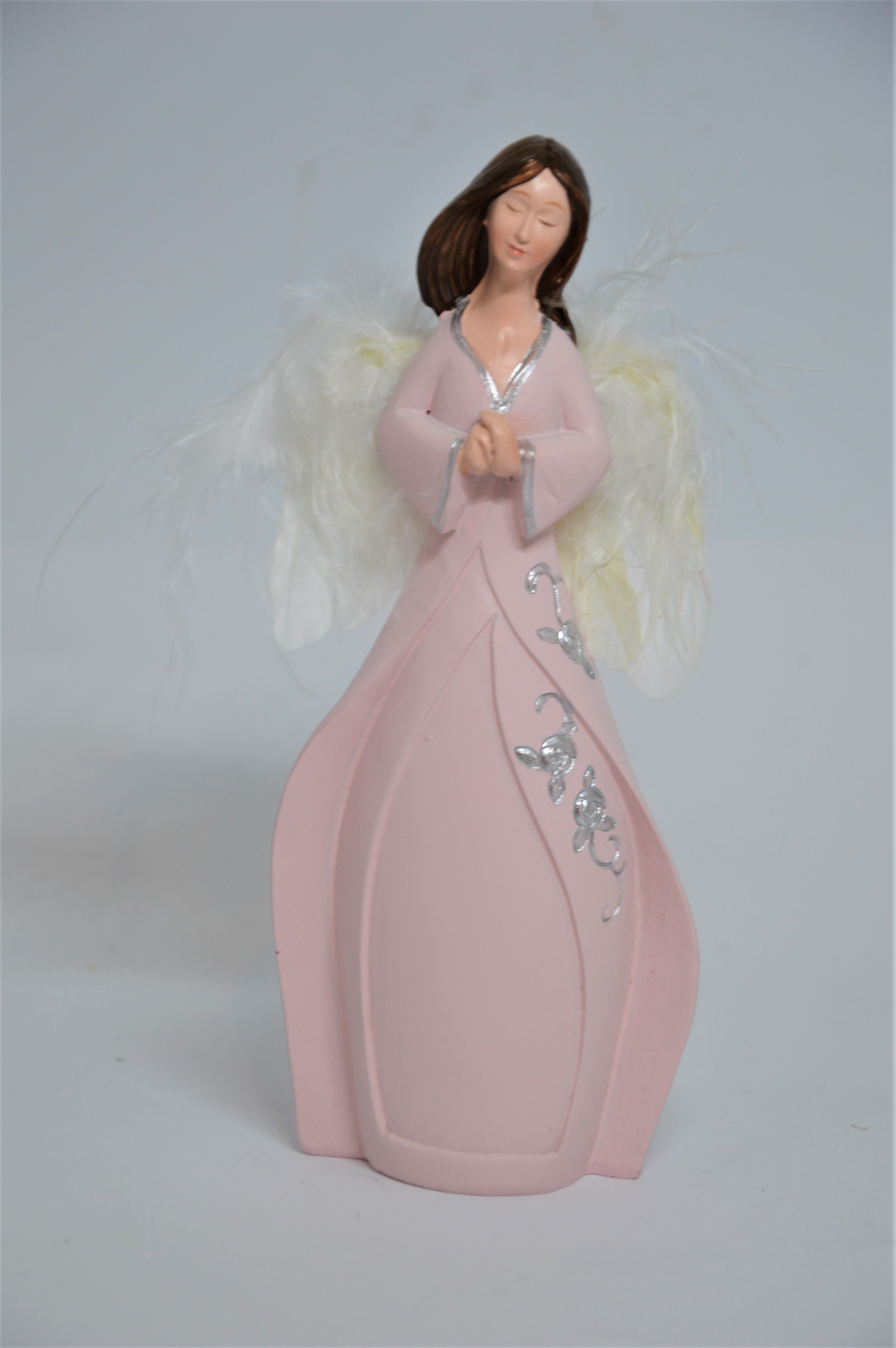 Anděl růžový – nádherný jemný andílek v pastelově růžových šatech s jemnými stříbrnými detaily. Anděl má dlouhé hnědé vlásky, detailně provedený obličej.