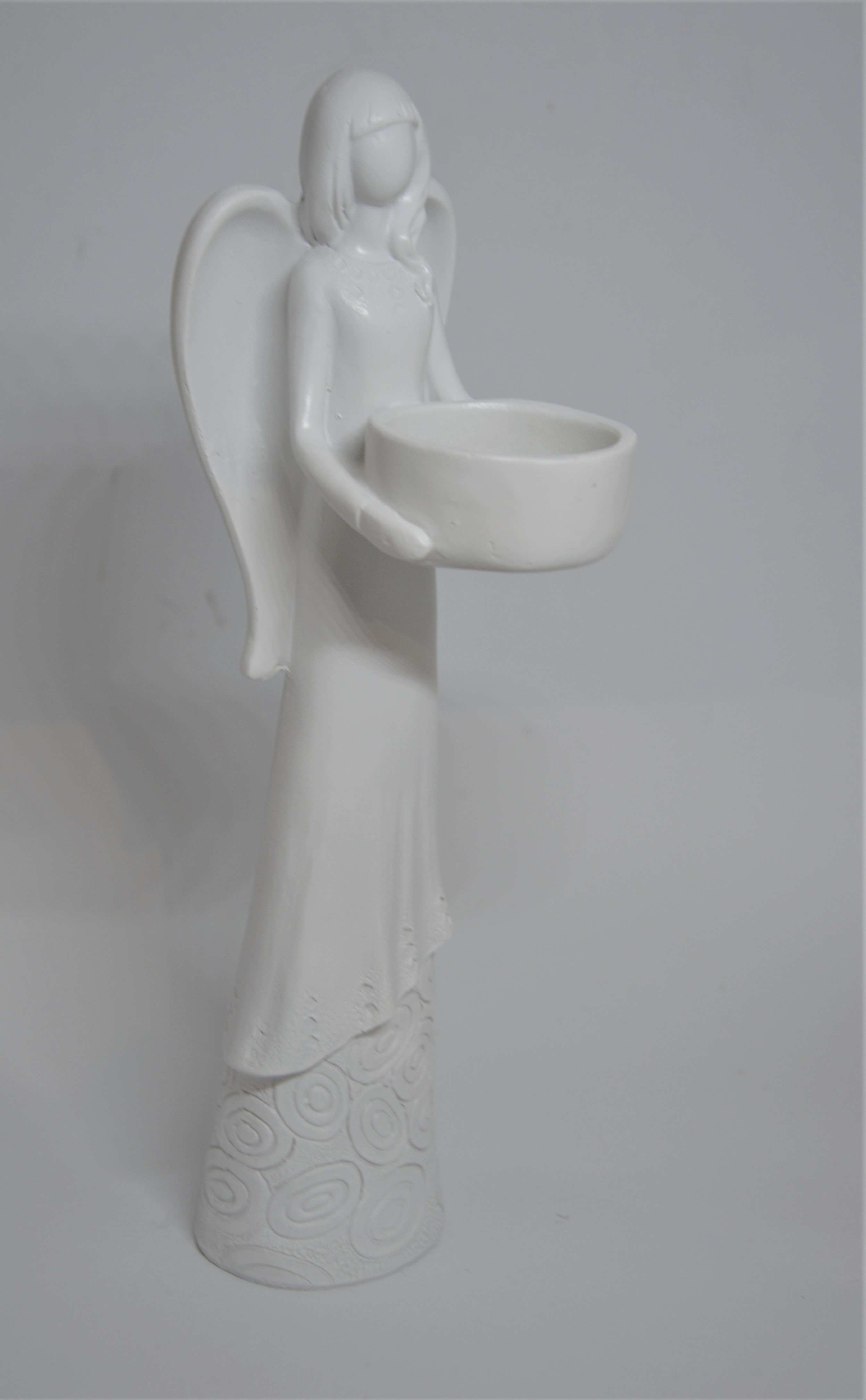 Anděl s kalíškem na svíčku – hladký bílý andělíček dokonale vystihuje heslo, že v jednoduchosti je krása. Má dlouhé vlásky a ofinu.