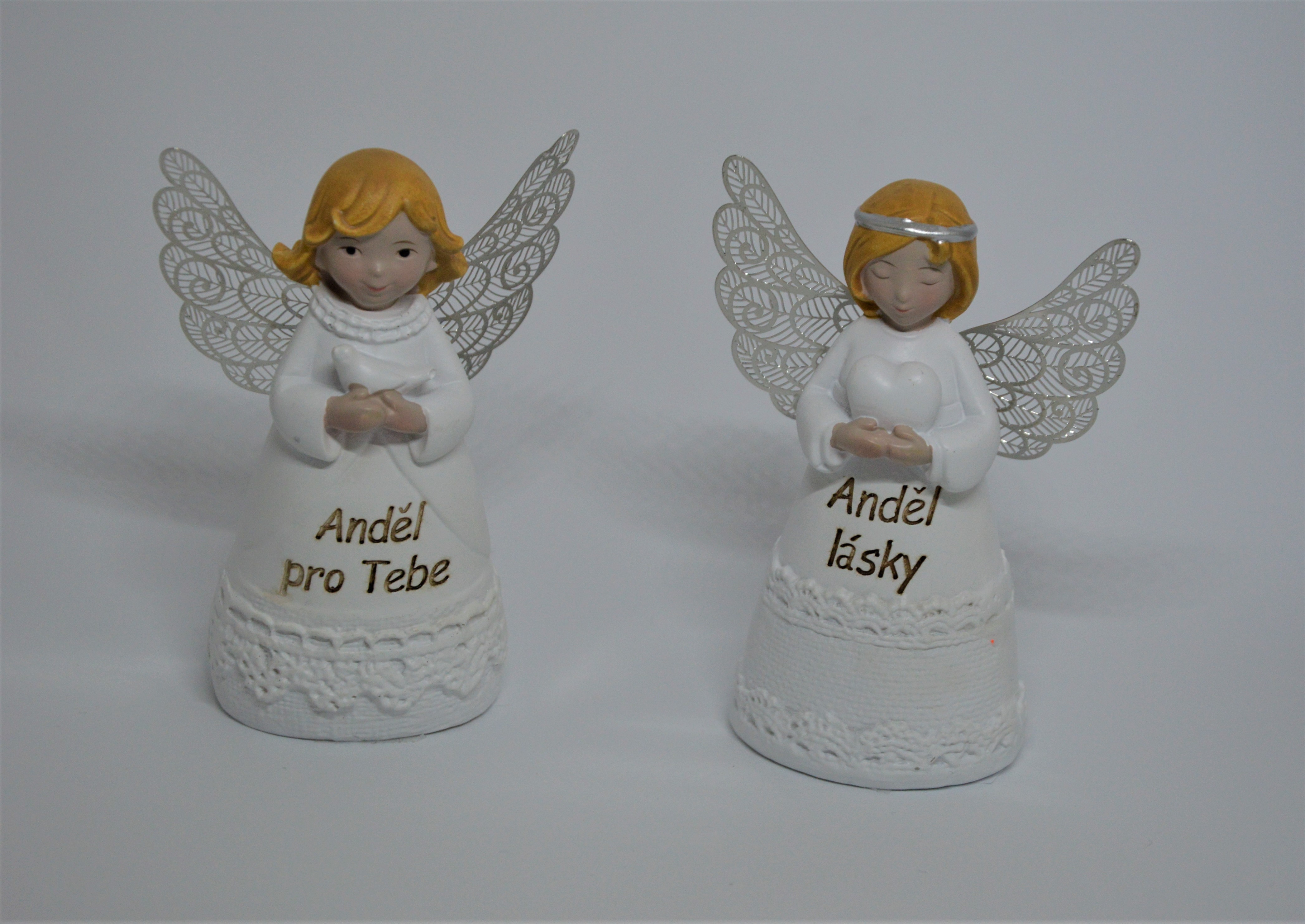 Anděl s kovovými křídly - s krátkými blonďatými vlásky, jeden má na hlavě čelenku a v ruce drží srdíčko, druhý má v ruce holoubka.