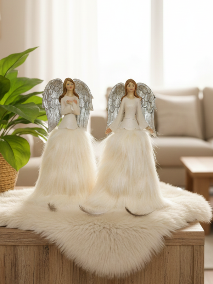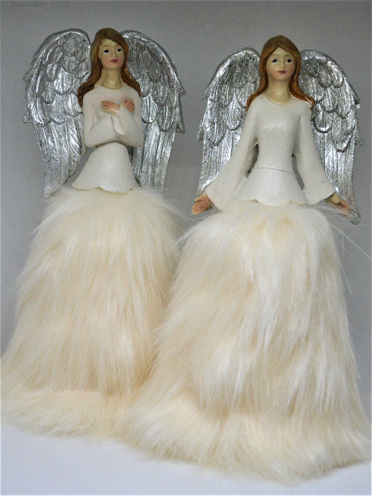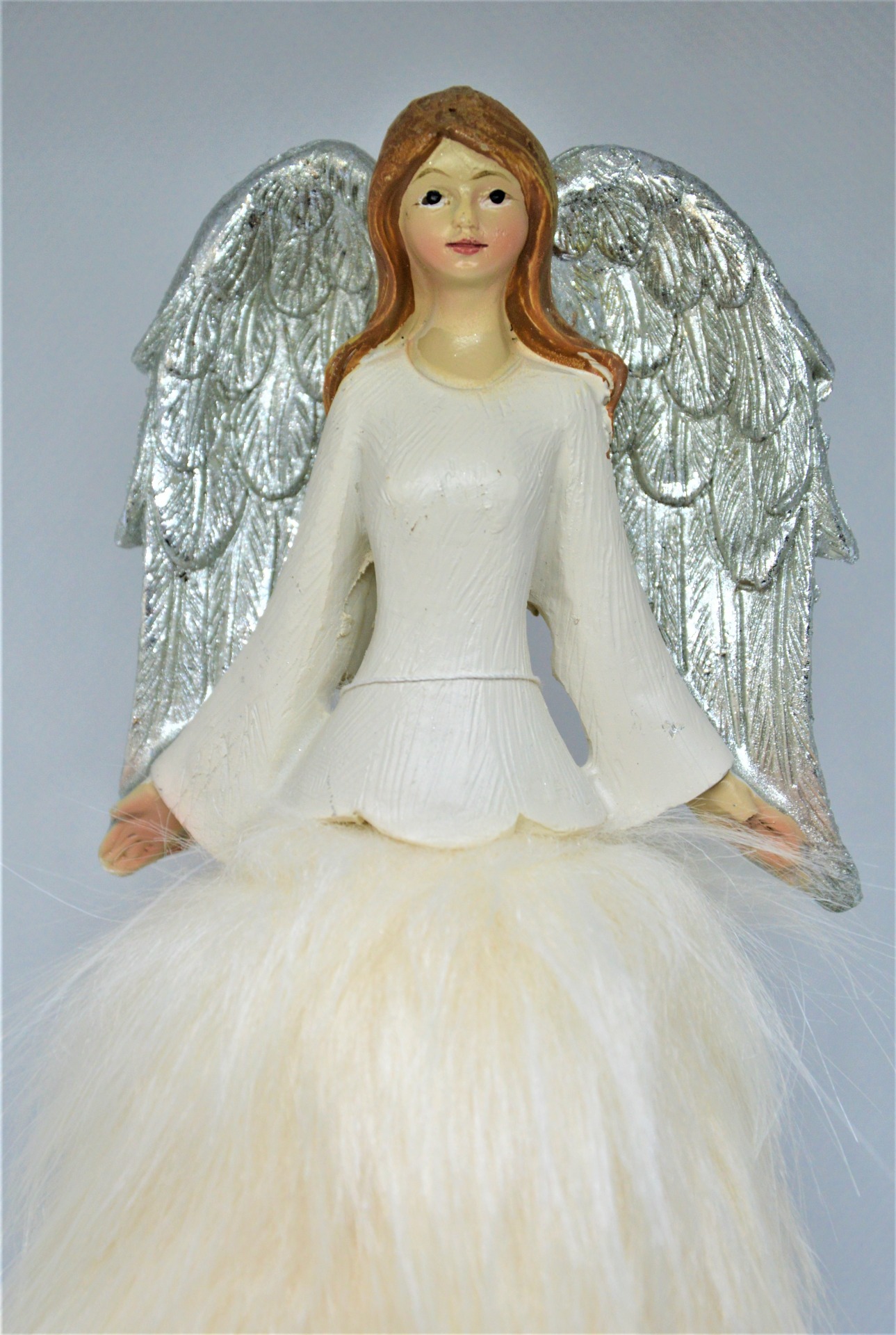 Anděl s kožešinovou sukýnkou - krásný zimní andělíček s dlouhými hnědými vlásky s šedými křídly a oblečený do krémové sukýnky z umělé kožešiny s dlouhými chlupy.