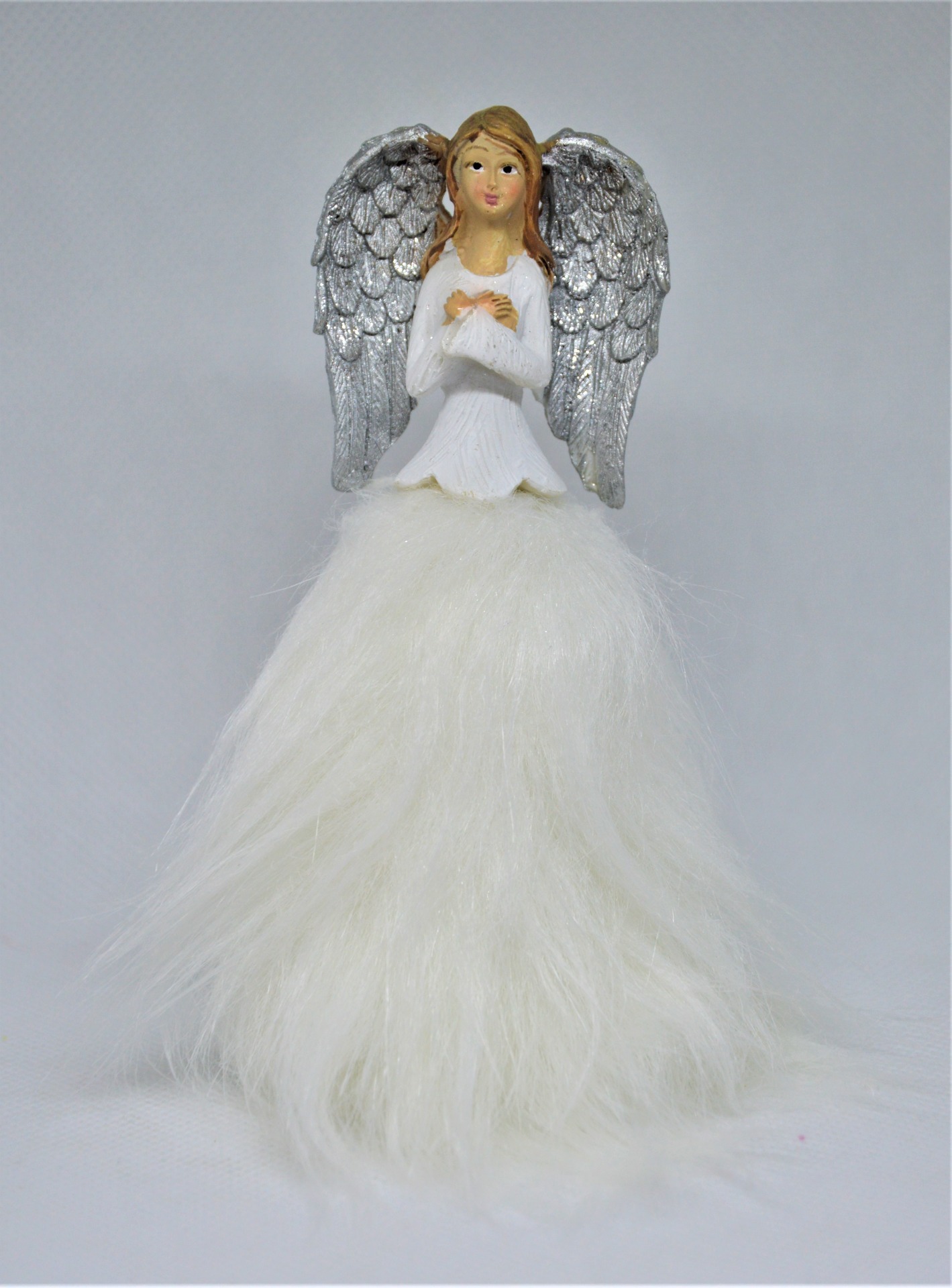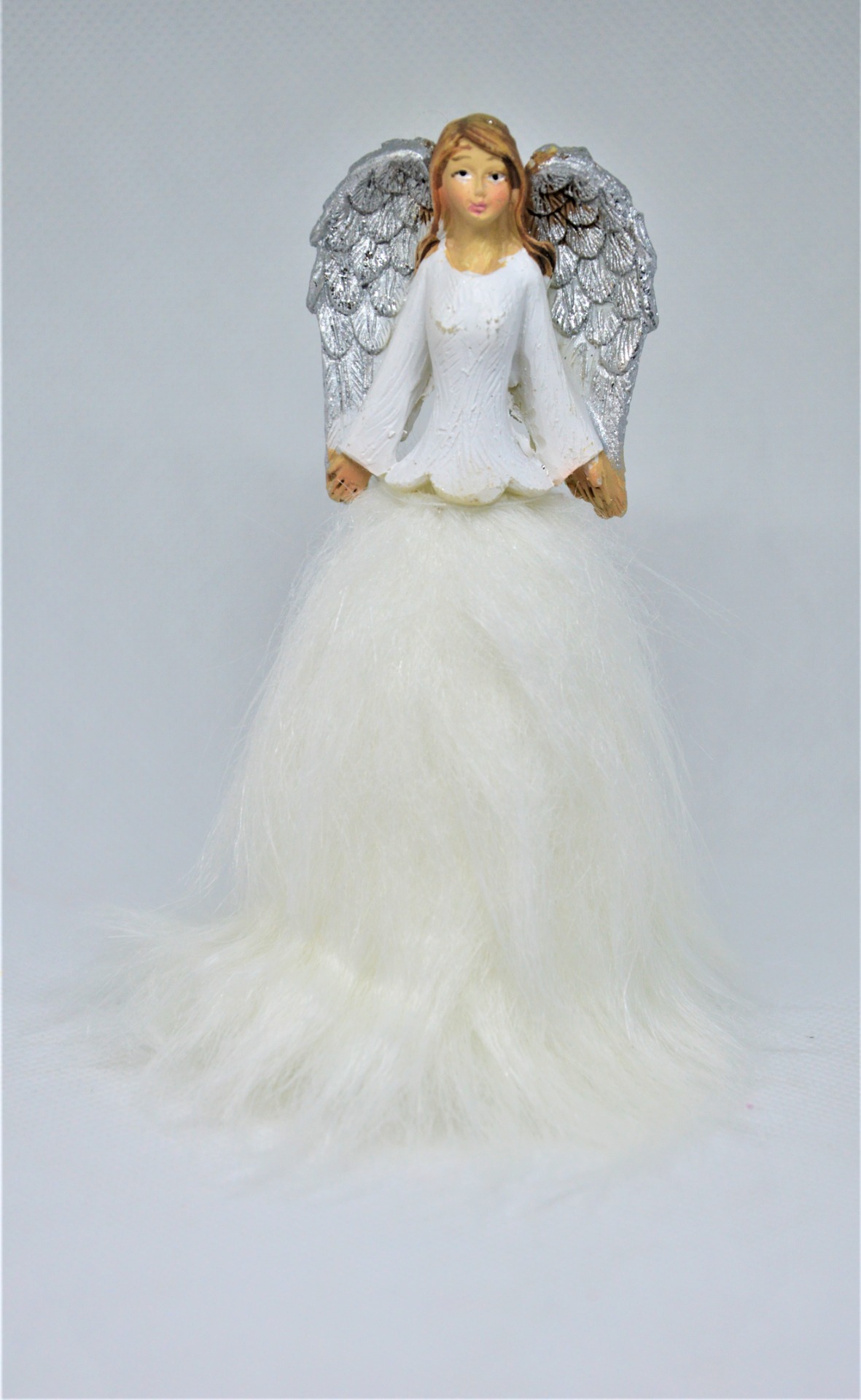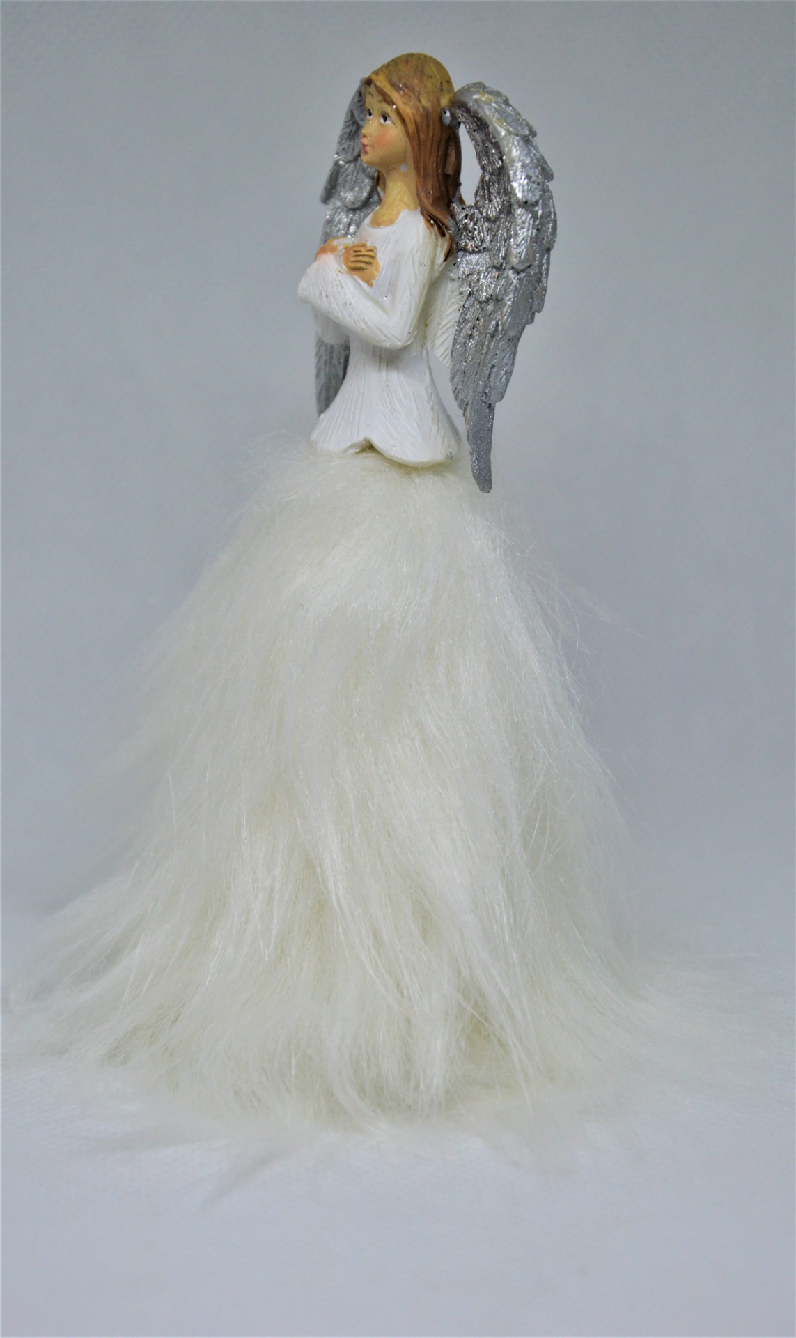 Anděl s kožešinovou sukýnkou - menší, krásný andělíček v “zimní” verzi. S hnědými vlásky, šedými křídly, oblečený do dlouhých šatů s krémovou sukýnkou z umělé kožešiny s dlouhými chlupy.