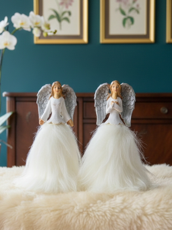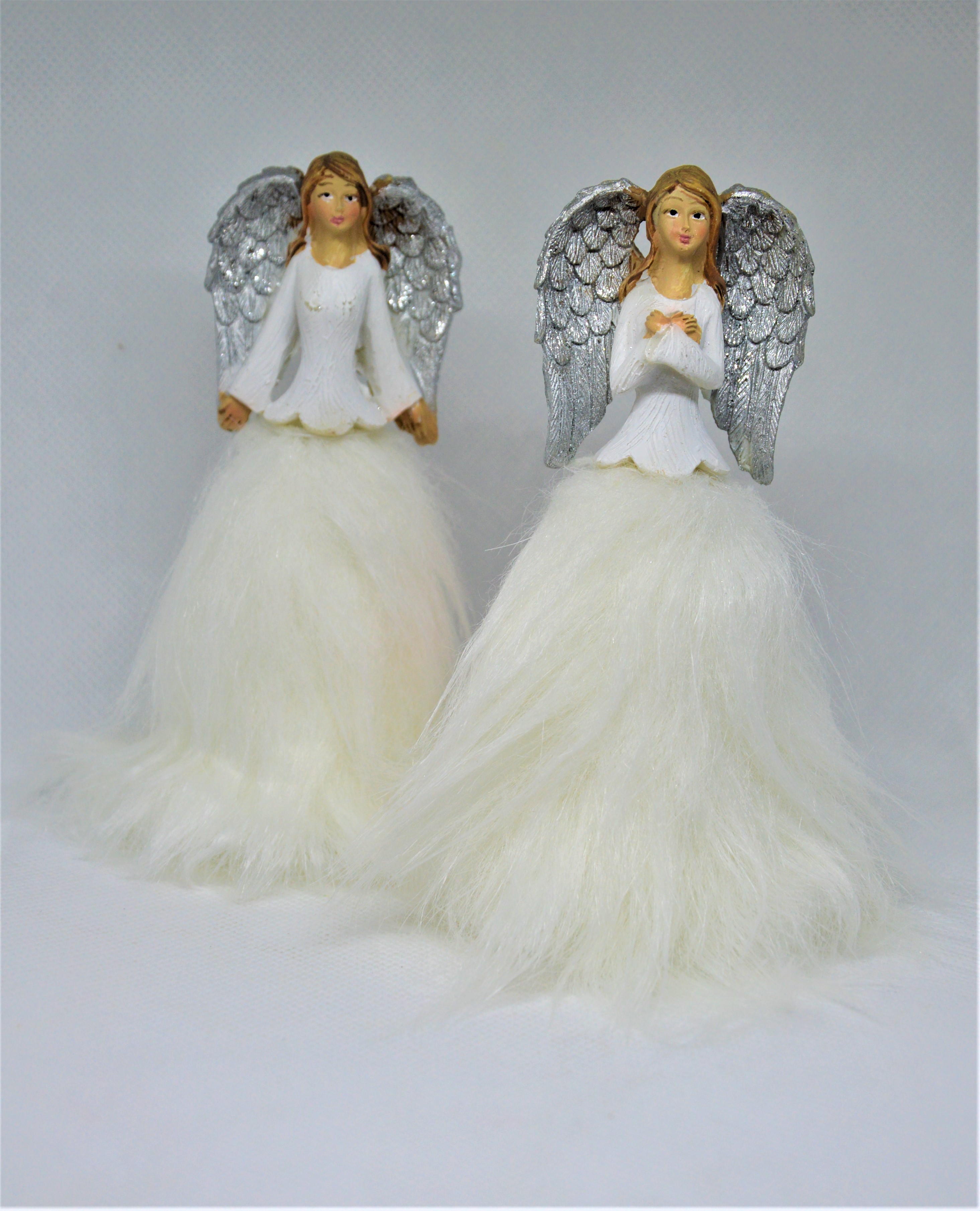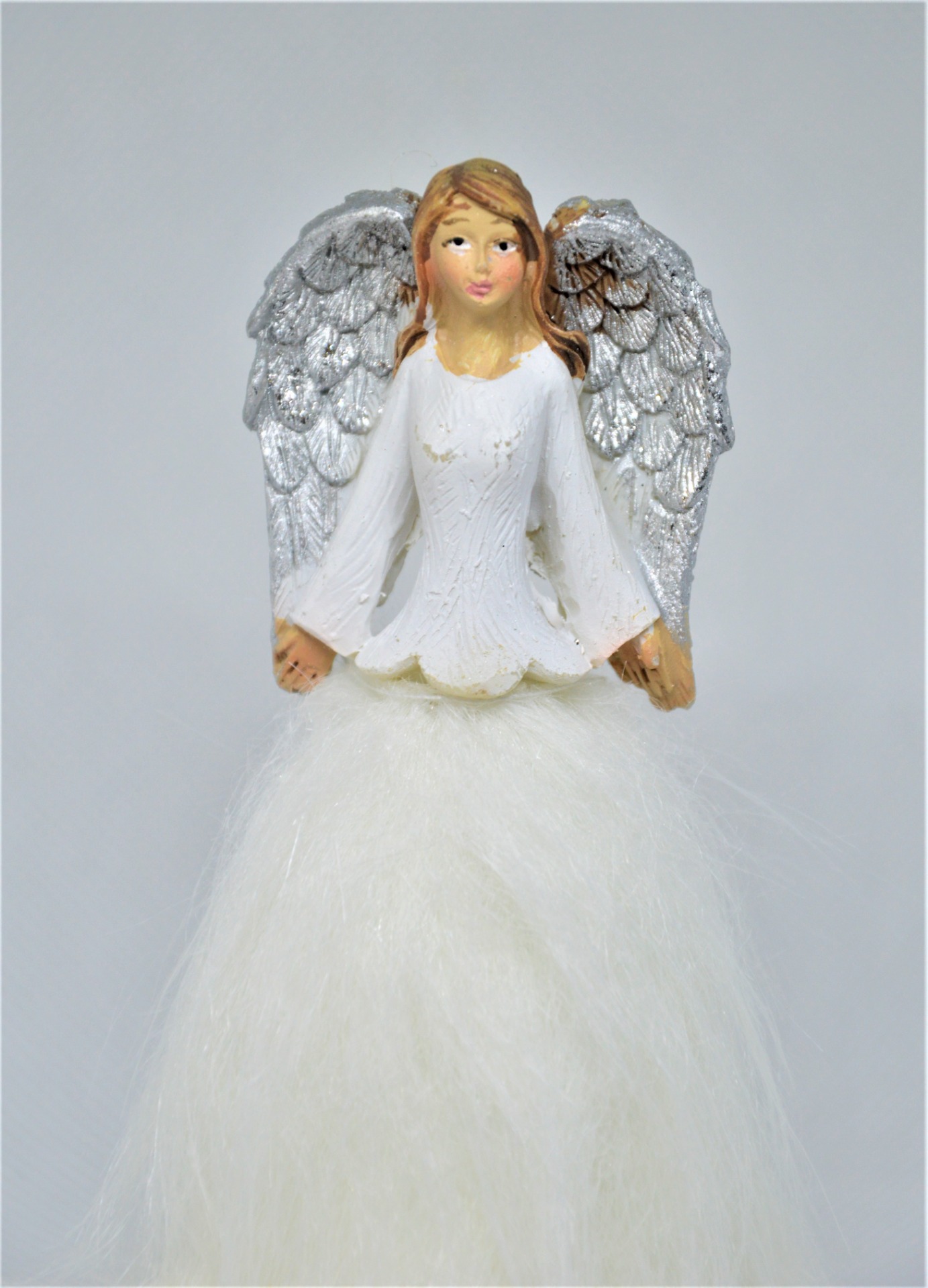 Anděl s kožešinovou sukýnkou - menší, krásný andělíček v “zimní” verzi. S hnědými vlásky, šedými křídly, oblečený do dlouhých šatů s krémovou sukýnkou z umělé kožešiny s dlouhými chlupy.
