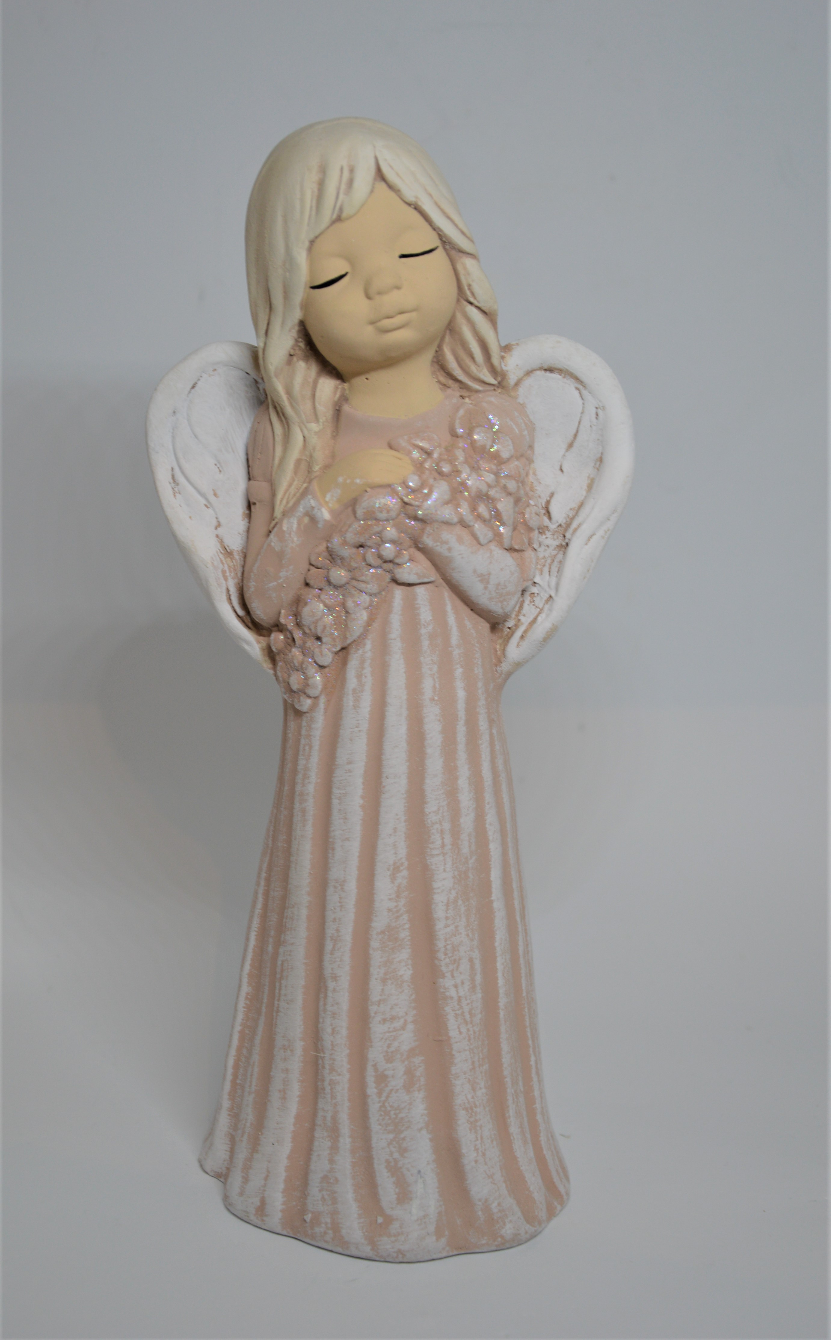 Anděl s kyticí – něžný andělíček s dlouhými světlými vlásky, zavřenýma očima je oblečený do jednoduchých světle růžových šatů.