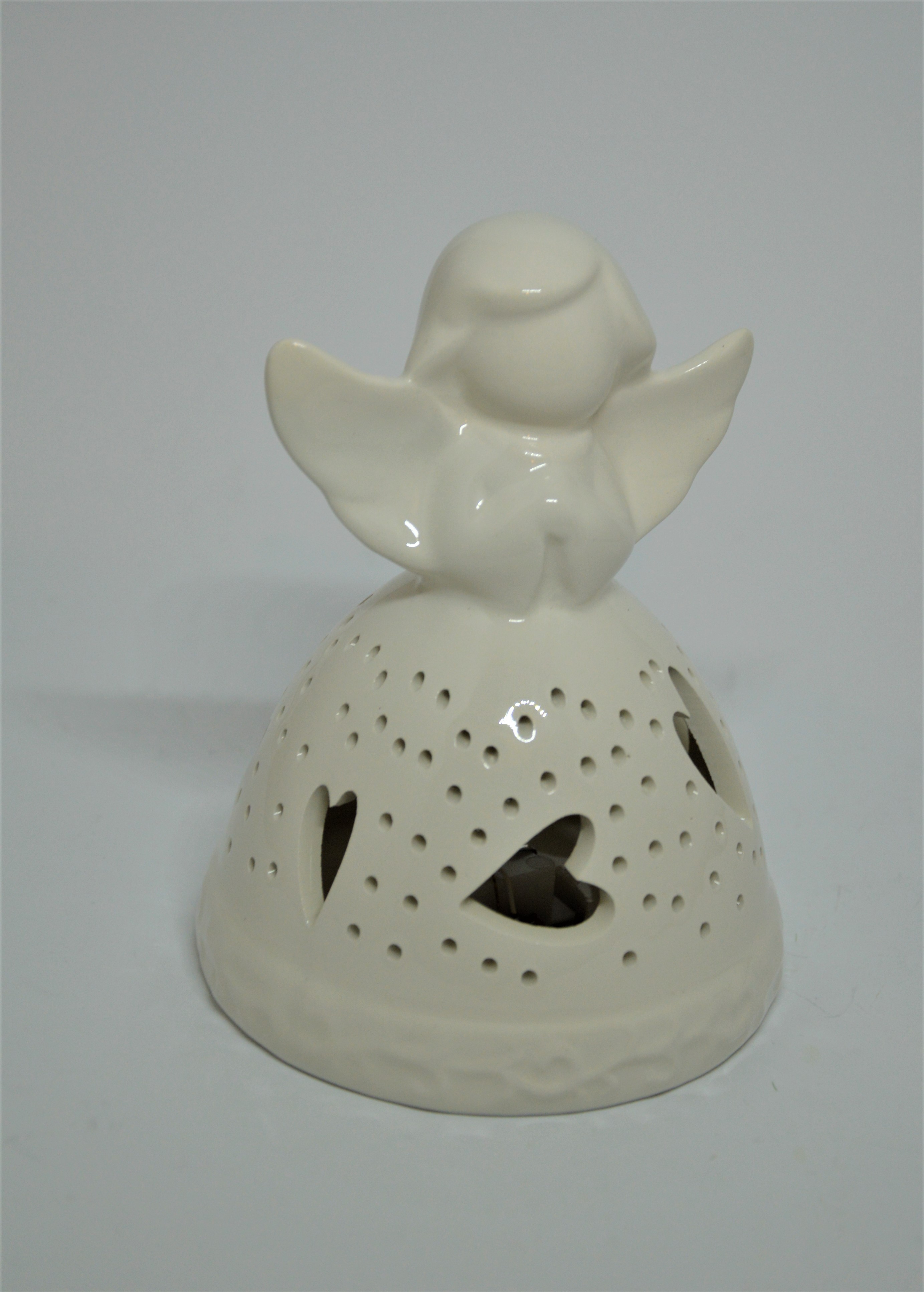 Anděl s LED osvětlením – bílý andělíček s vyřezávanými srdíčky, s LED osvětlením (baterie je součástí balení).
