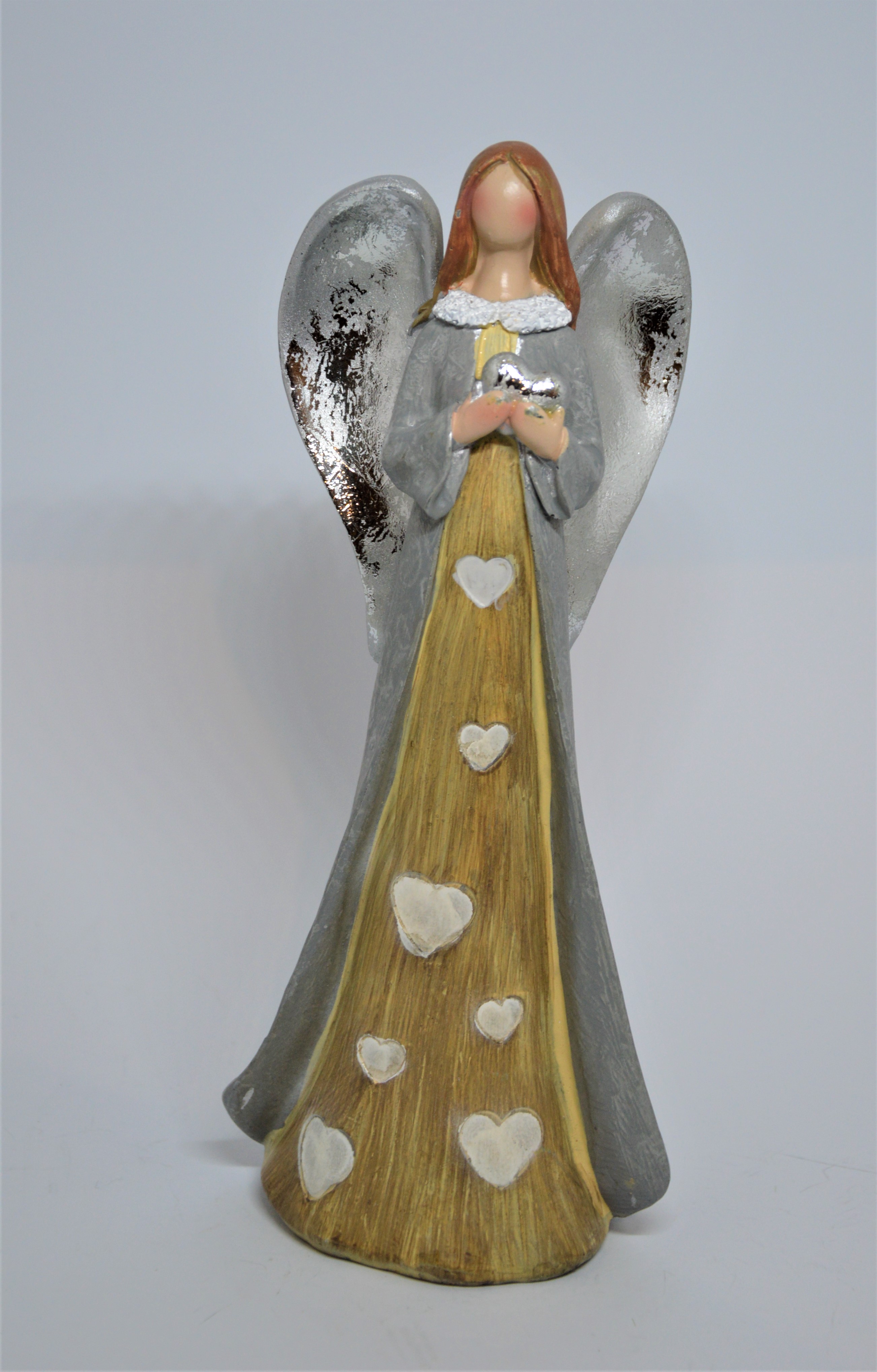 Dekorační anděl se srdíčky – krásný dekorační andílek se stříbrnými křídly, dlouhými hnědými vlasy a nezřetelným obličejem. V ruce drží stříbrné srdíčko. Motiv srdíček se objevuje i na „dřevěných“ šatech.