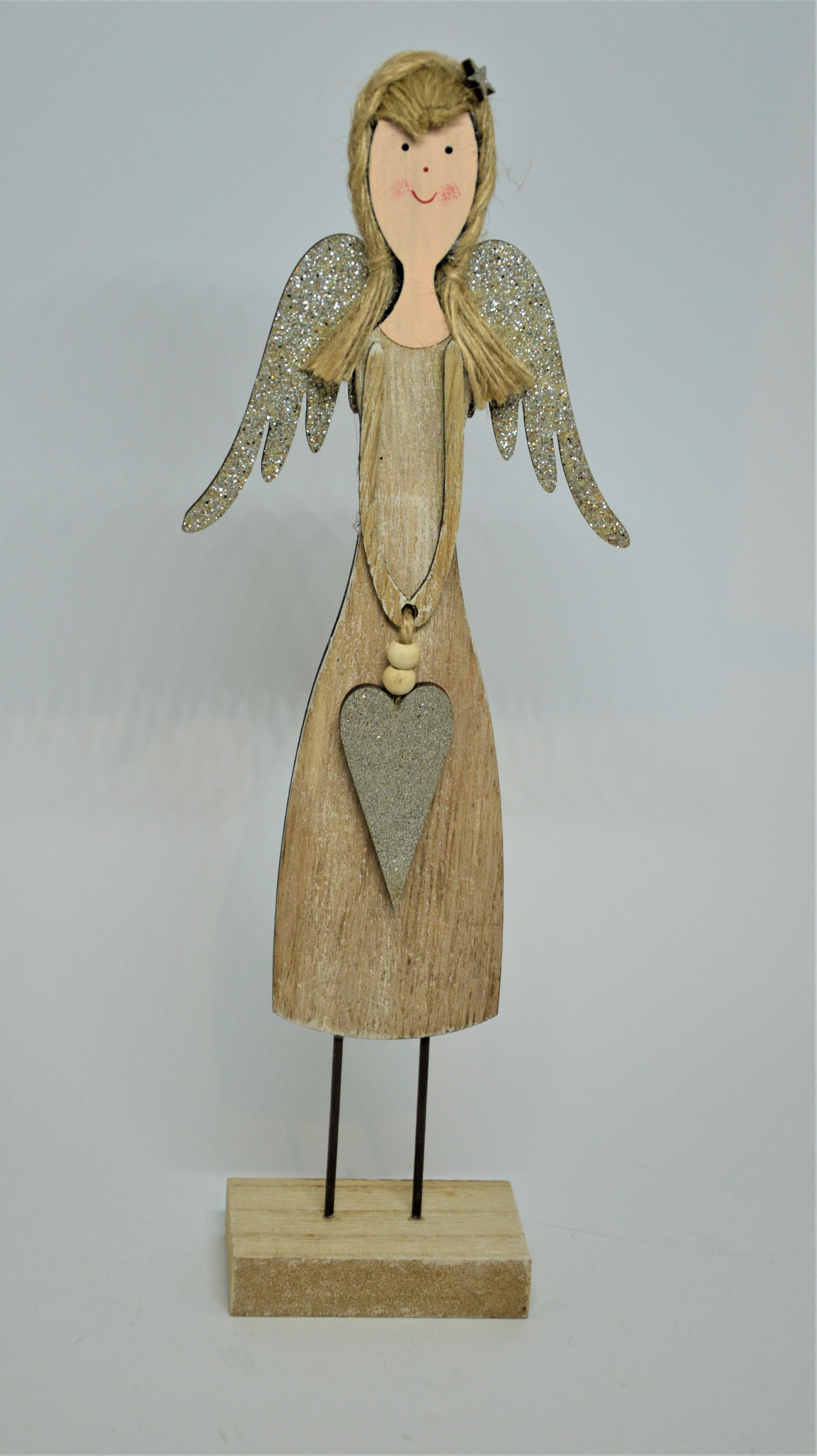 Dekorační anděl se třpytivými křídly – usměvavá andělka s dvěma zapletenými copy, vlásky ozvláštňuje třpytivá hvězdička. Má jednoduše zdobený obličej, v ruce drží třpytivé srdíčko. Umístěná na podstavci pro lepší stabilitu.