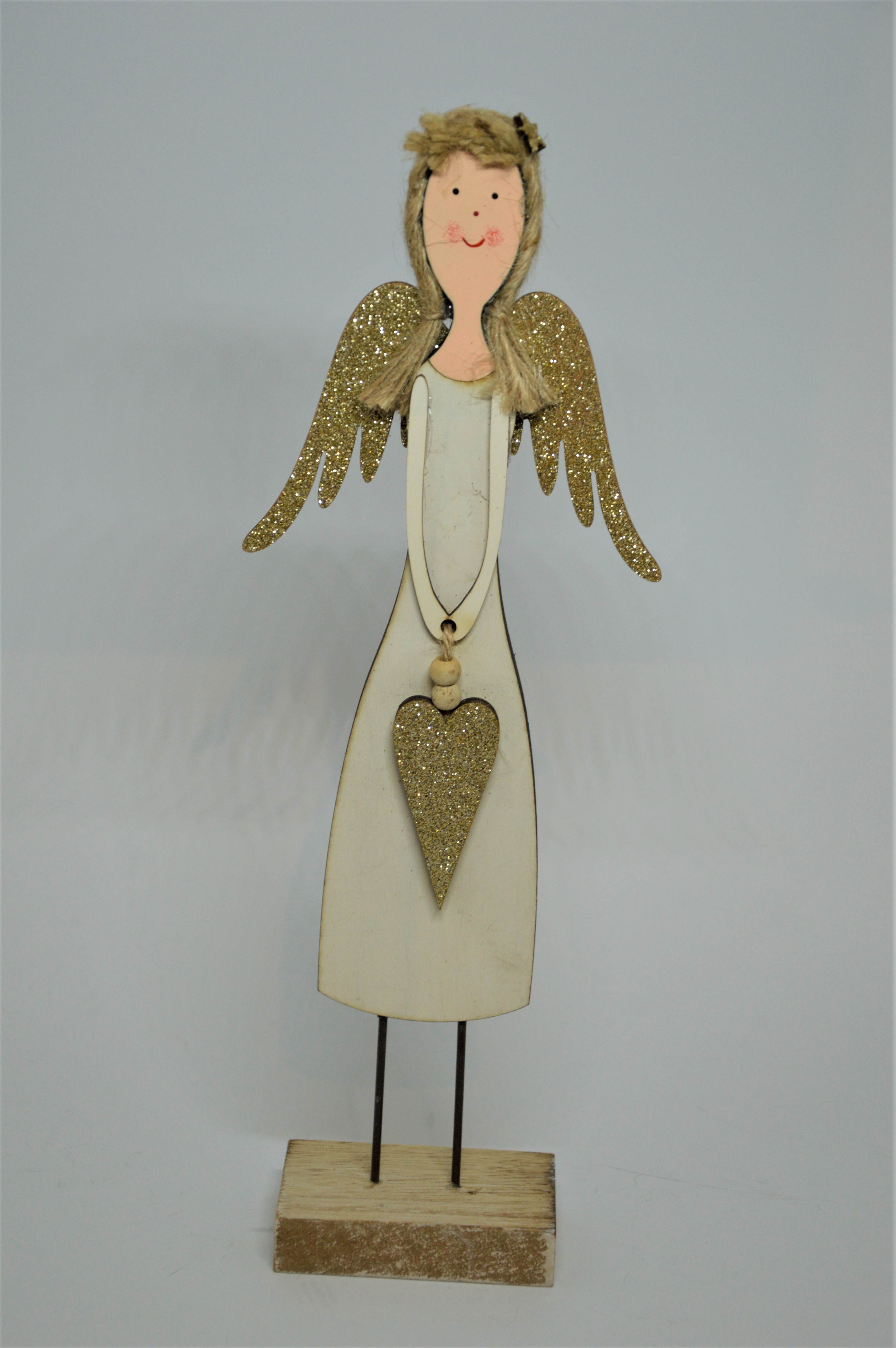 Dekorační anděl se třpytivými křídly – usměvavá andělka se dvěma copy, vlásky ozvláštněné třpytivou hvězdičkou. Má jednoduše zdobený obličej, v ruce drží třpytivé srdíčko. Umístěná na podstavci pro lepší stabilitu.