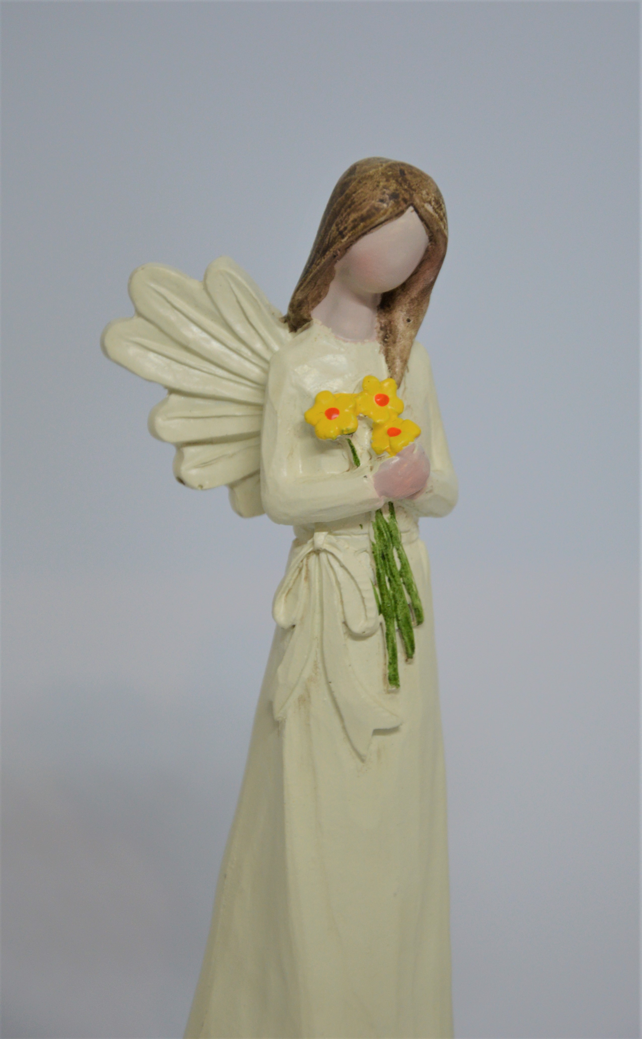 Anděl se žlutými květinami - andílek se světle hnědými vlásky, nezřetelným obličejem je oblečený do dlouhých krémových šatů zdobených v pase mašlí. Oběma rukama drží žluté květiny, které krásně kontrastují s bílou róbou.
