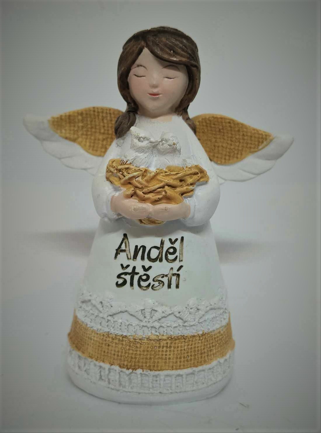Anděl štěstí – jemný, bílo-zlatý andělíček se zavřenýma očima a krátkými hnědými vlásky drží v náručí hnízdo s ptáčky a je zdobený nápisem Anděl štěstí.