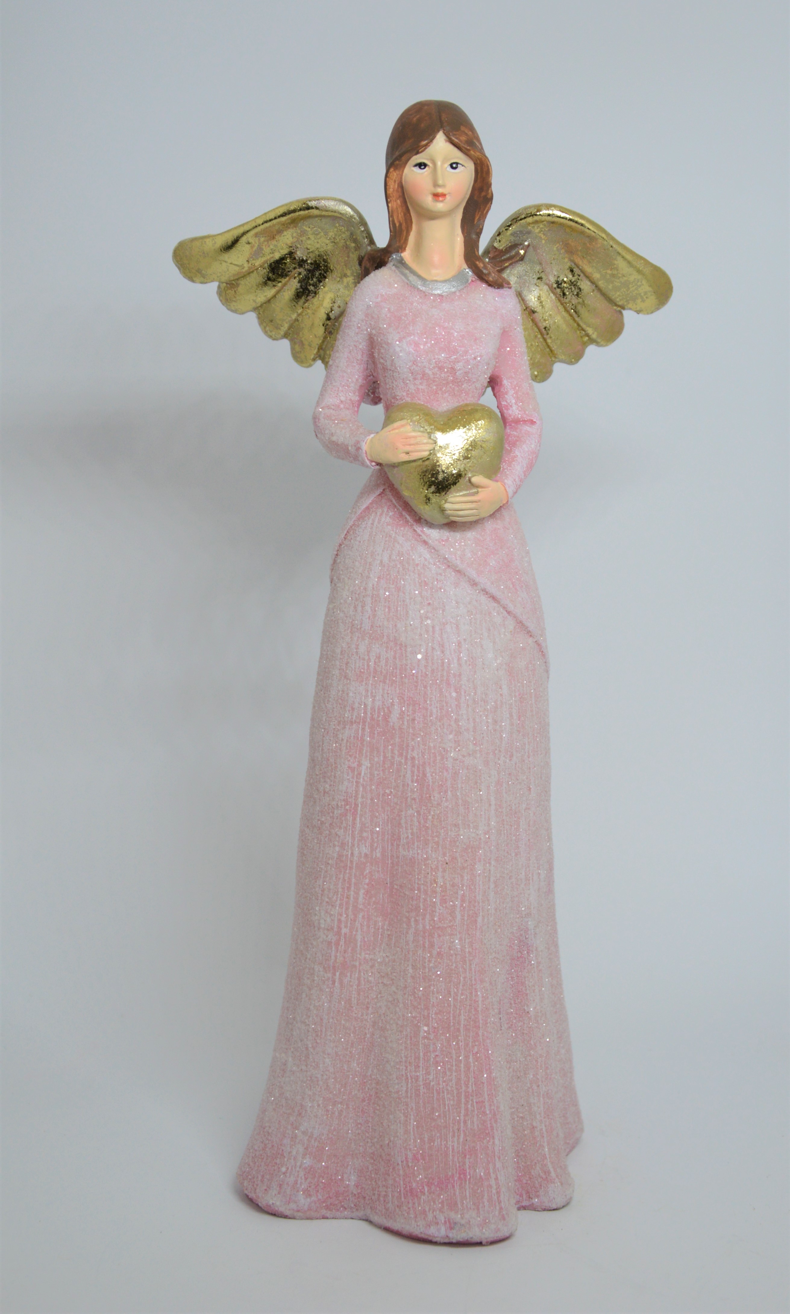 Anděl v růžových šatech – elegantní a luxusně působící andílek s dlouhými hnědými vlásky a jemně vykresleným obličejem.