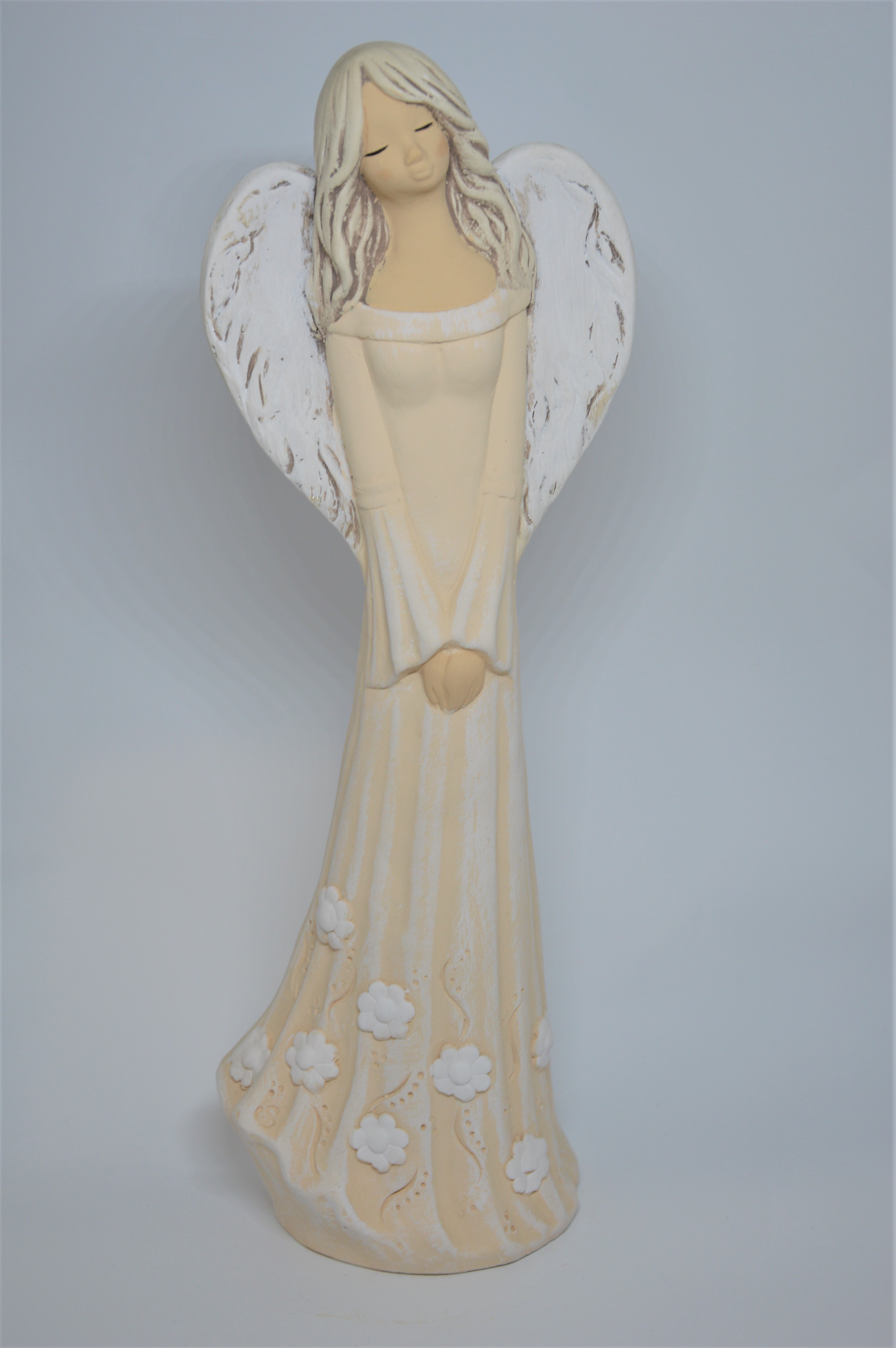 Sádrový anděl v jemné pastelové barvě, s delšími blond vlasy, lehce zdobenými bílými křídly a se zavřenýma očima.