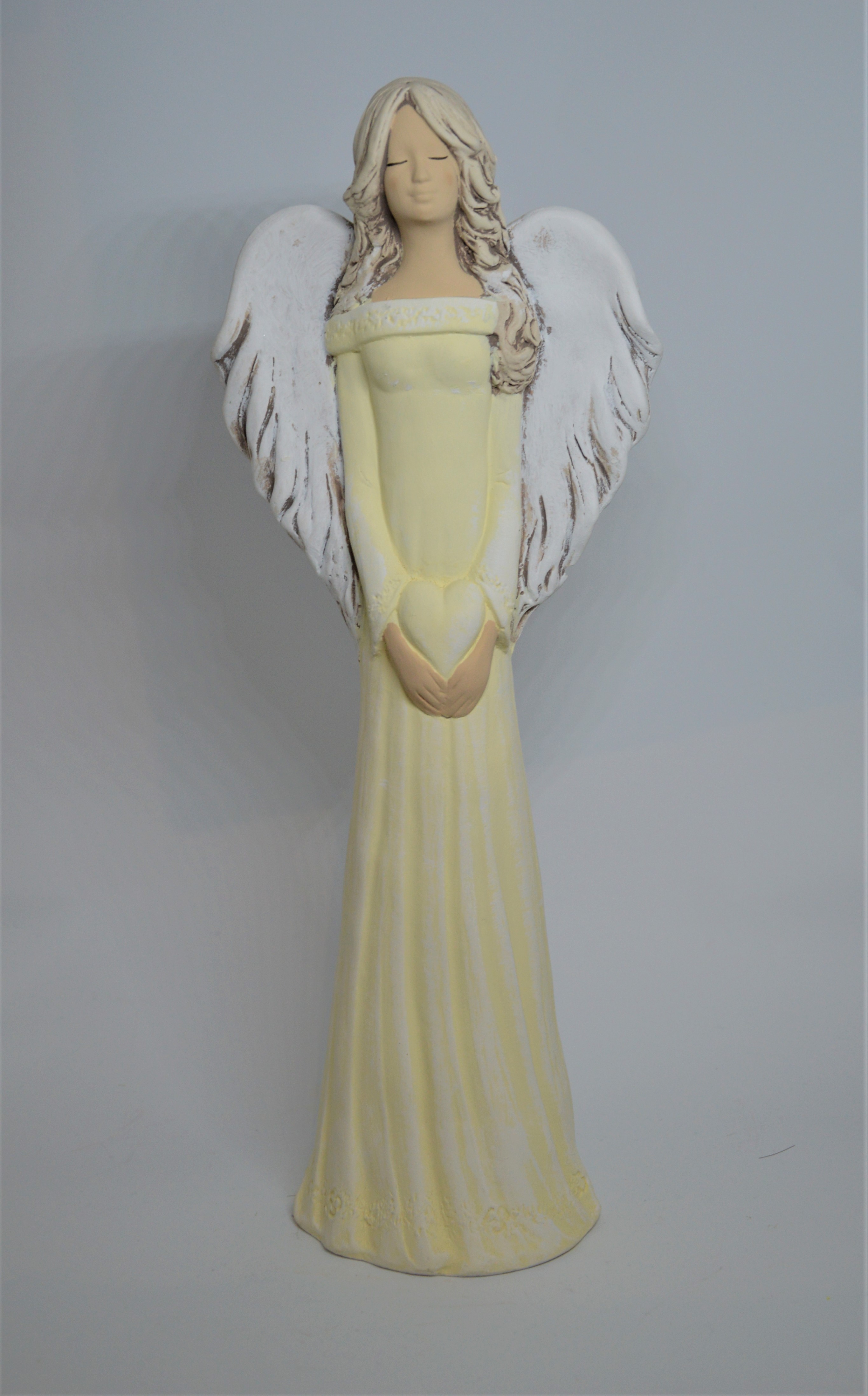 Anděl ve světle žlutých šatech - sádrový anděl v dlouhých pastelově žlutých šatech, dlouhými blond vlasy a zavřenýma očima. V ruce drží bílé srdíčko, skvěle se tak hodí jako dárek pro vaše milovaní.