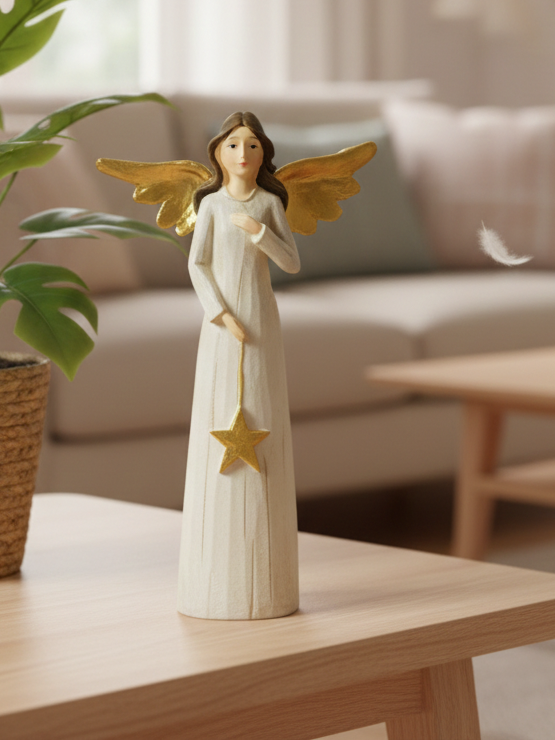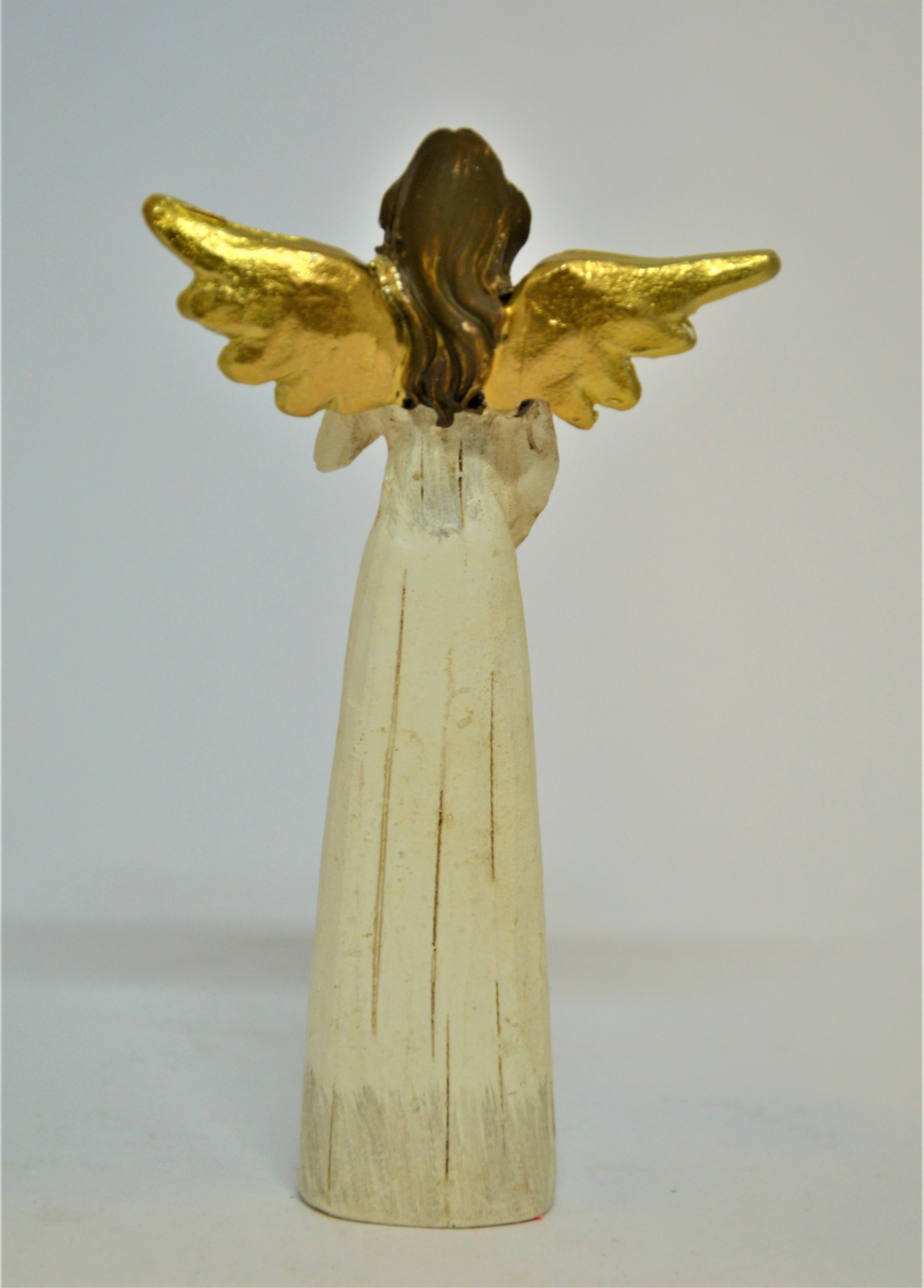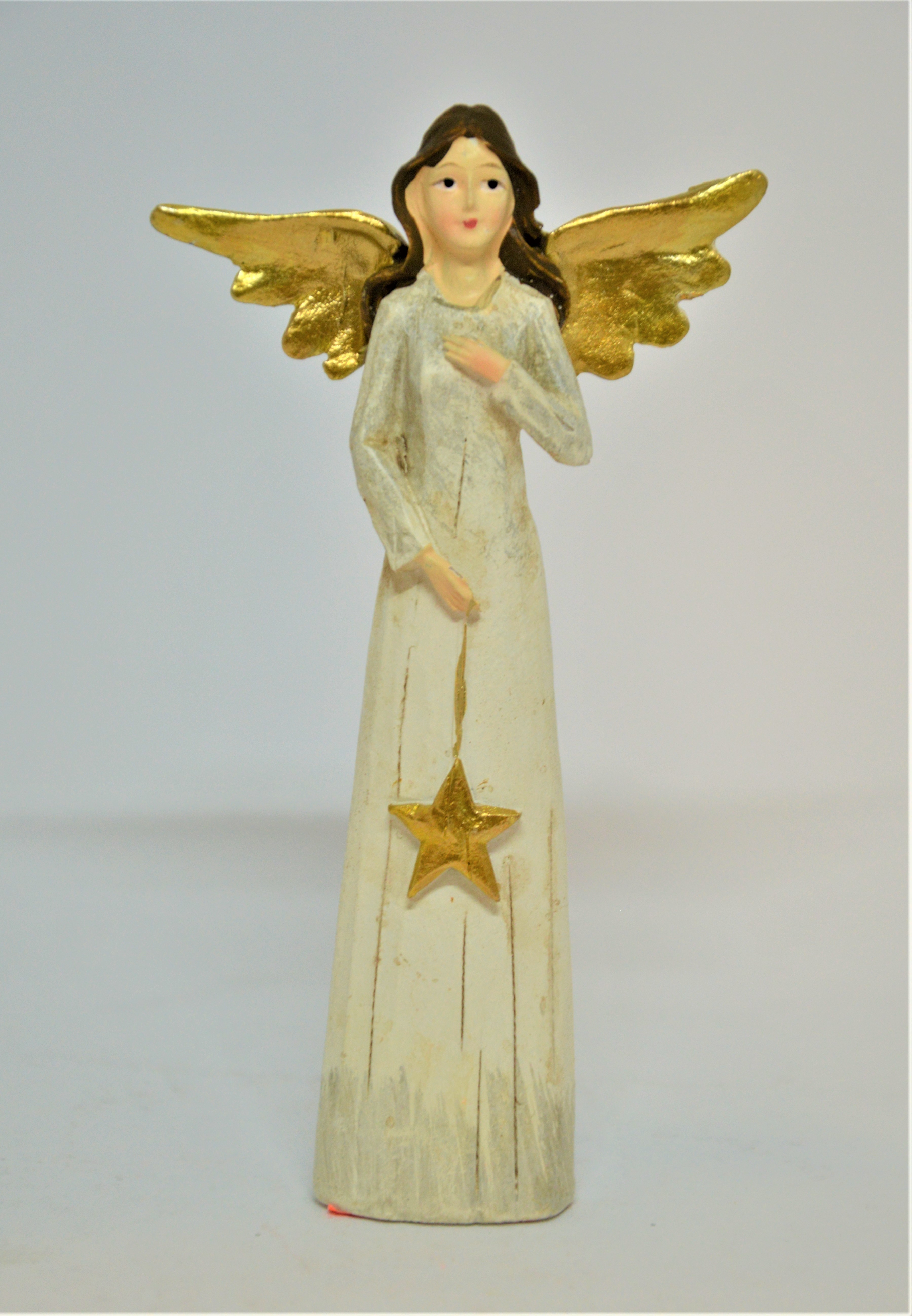 Béžový anděl se zlatými křídly - anděl s hnědými vlásky a detailně provedeným obličejem drží v ruce zlatou hvězdičku, která symbolizuje naději a věčný život.