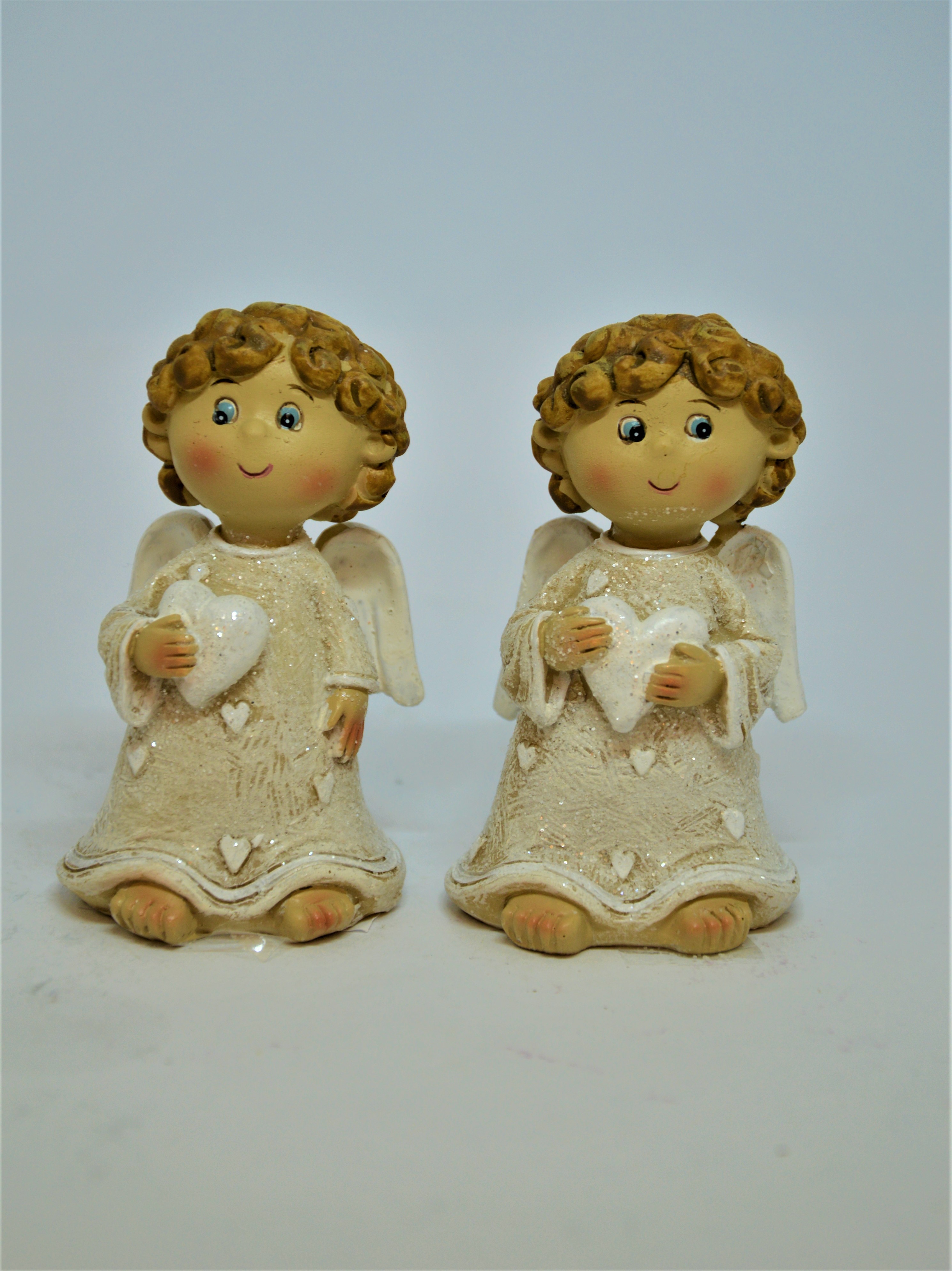 Béžový kudrnatý andělíček - nevinněji působícího andílka byste hledali jen těžko. Světlé kudrnaté vlásky, velké modré oči, růžová líčka, jemné šaty, bosé nohy a v ruce drží bílé srdíčko. Všechny tyto atributy z něj dělají ideální osobní dárek pro blízkého člověka, kterého chcete potěšit a vykouzlit mu úsměv na tváři. Vyroben z polystonu (druh pryskyřice). dvě varianty: srdíčko drží oběma rukama/srdíčko drží v jedné ruce. 110 Kč, rozměry: 9 x 5,5 x 5 cm.