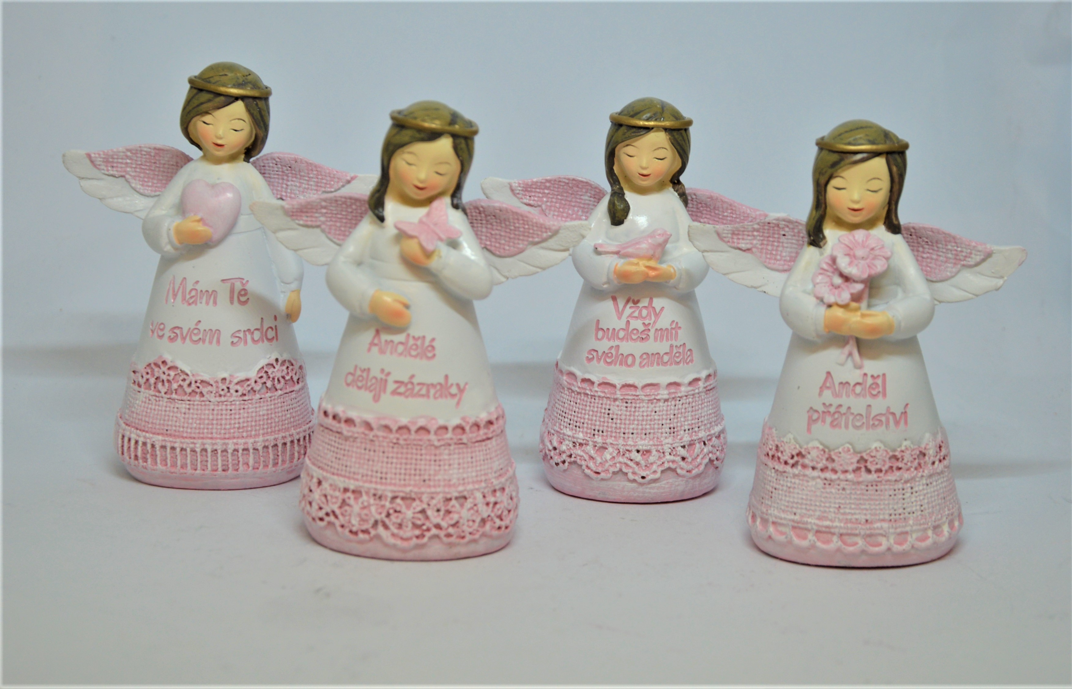 Bílo-růžový andělíček - roztomilý a něžně působící anděl s čelenkou ve vlasech a s minimalisticky zdobeným obličejem je oblečený do šatů zdobených krajkou a opatřených všeříkajícím nápisem. Díky němu skvěle poslouží jako dárek pro vaše milované, kterým můžete dát najevo, jak jsou pro vás důležití.