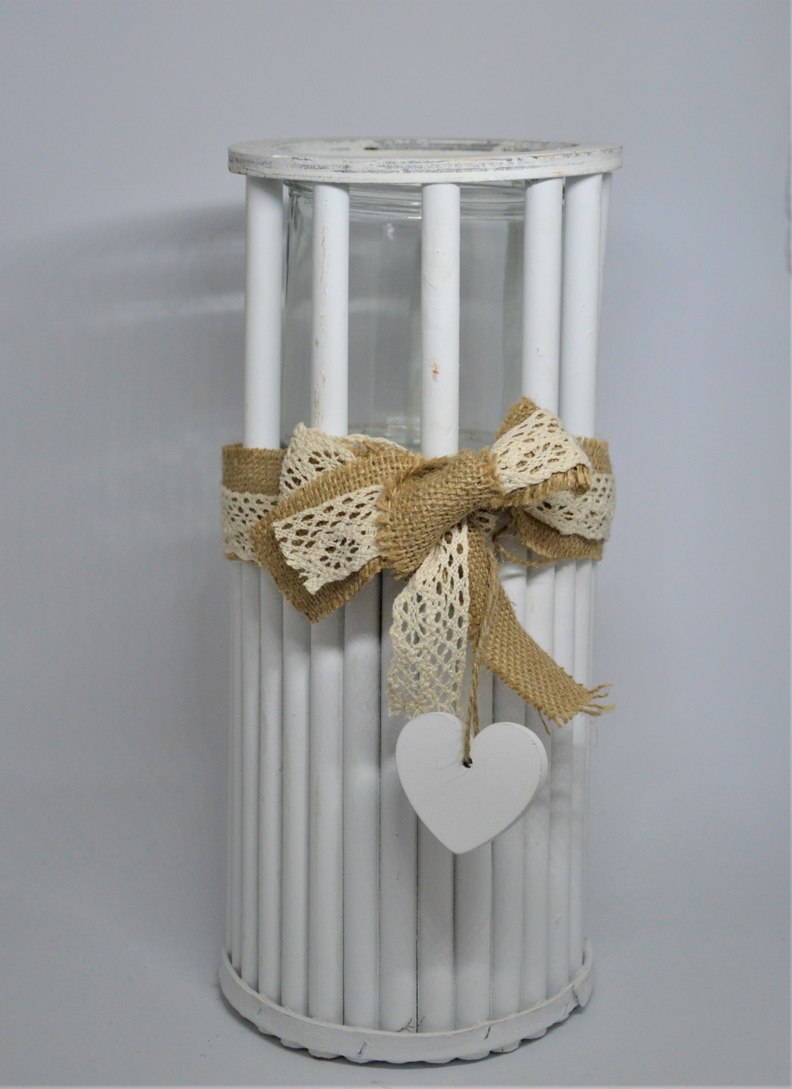 Bílý dřevěný svícen - bílý kulatý svícen ze dřeva se skleněnou nádobou na svíčku uvnitř. Zdobí ho stužka z plátna a dřevěná dekorace ve tvaru srdce.