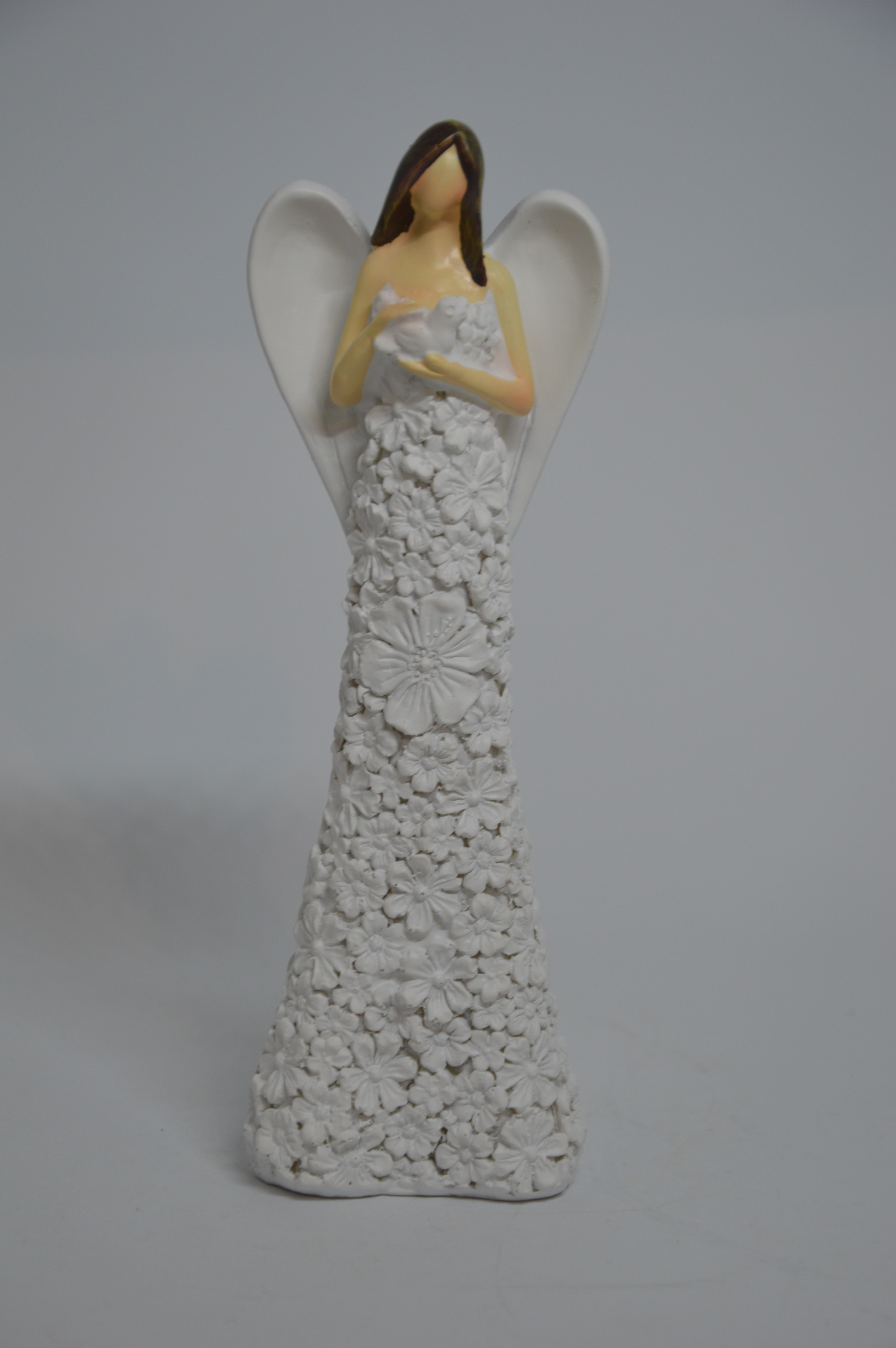 Bílý květinový anděl – oblečený je do krásných květinových šatů, má tmavě hnědé vlásky, nezřetelný obličej a hladká oblá křídla ve tvaru srdce.