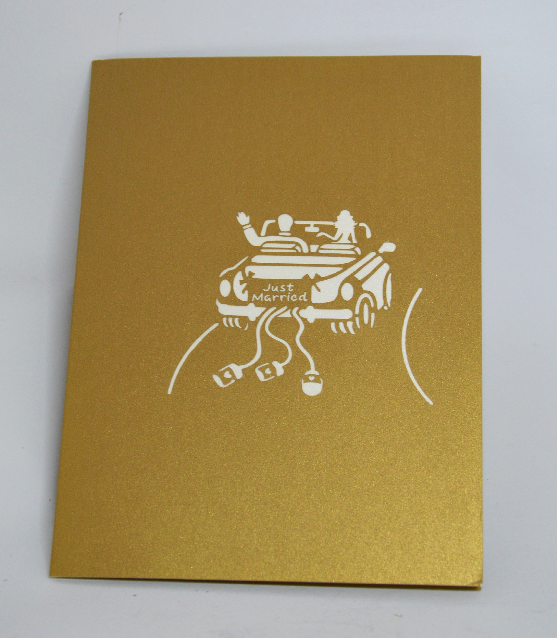 Blahopřání ke svatbě – originální, ručně zpracované 3D svatební blahopřání s motivem automobilu a nápisem Just married.