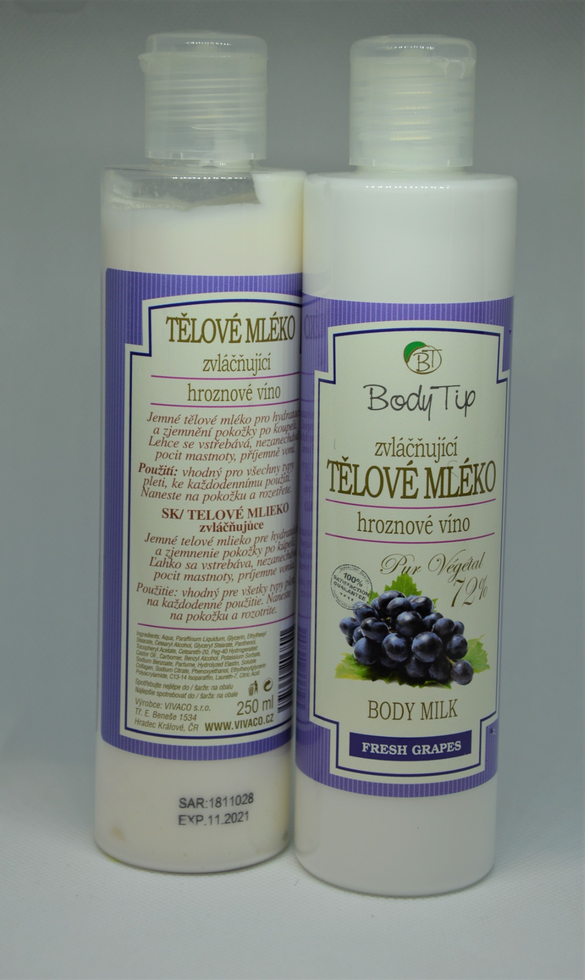 Zvláčňující jemné tělové mléko hroznové víno pro hydrataci a zjemnění pokožky po koupeli. Lehce se vstřebává, nezanechává pocit mastnoty, příjemně voní.