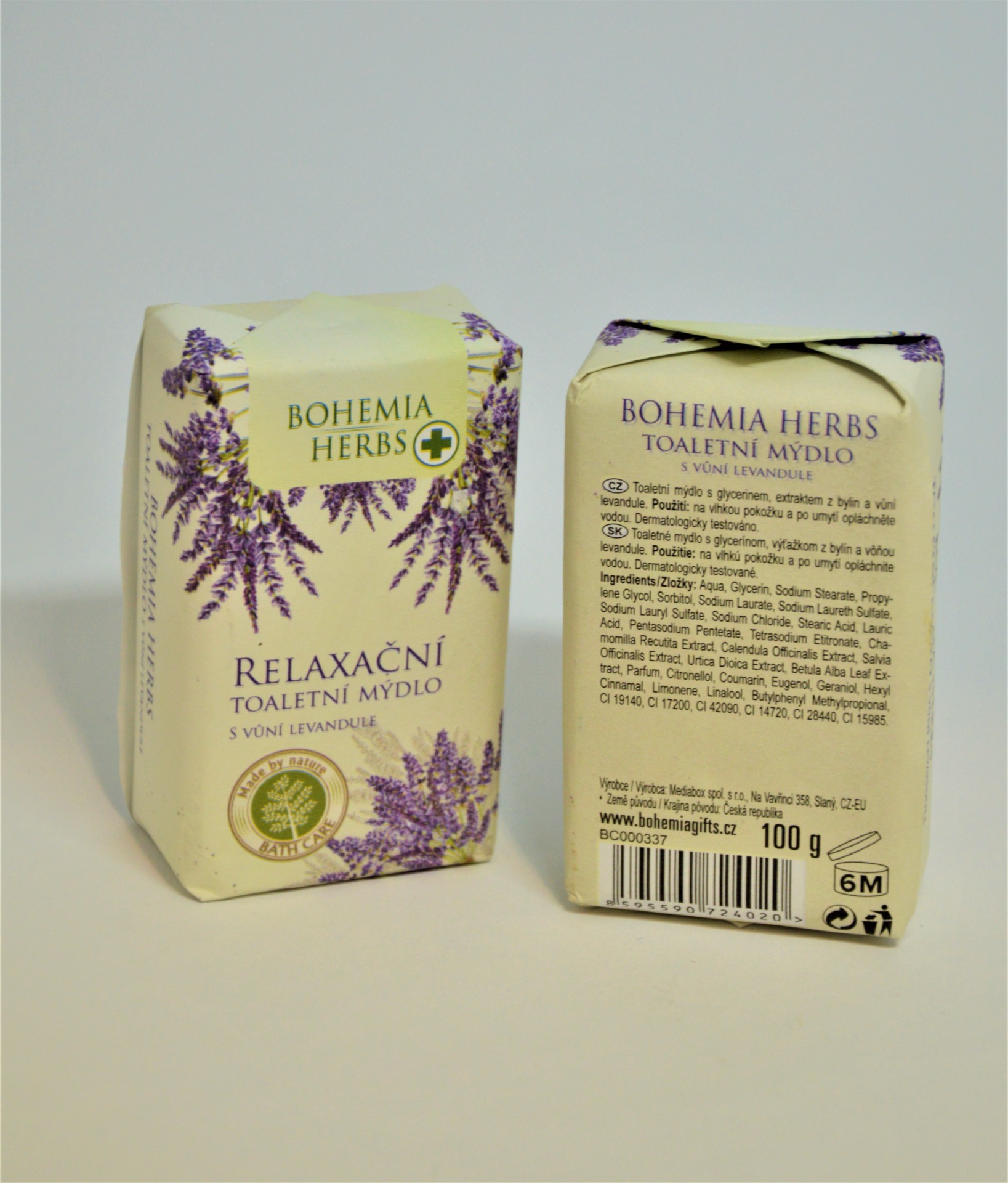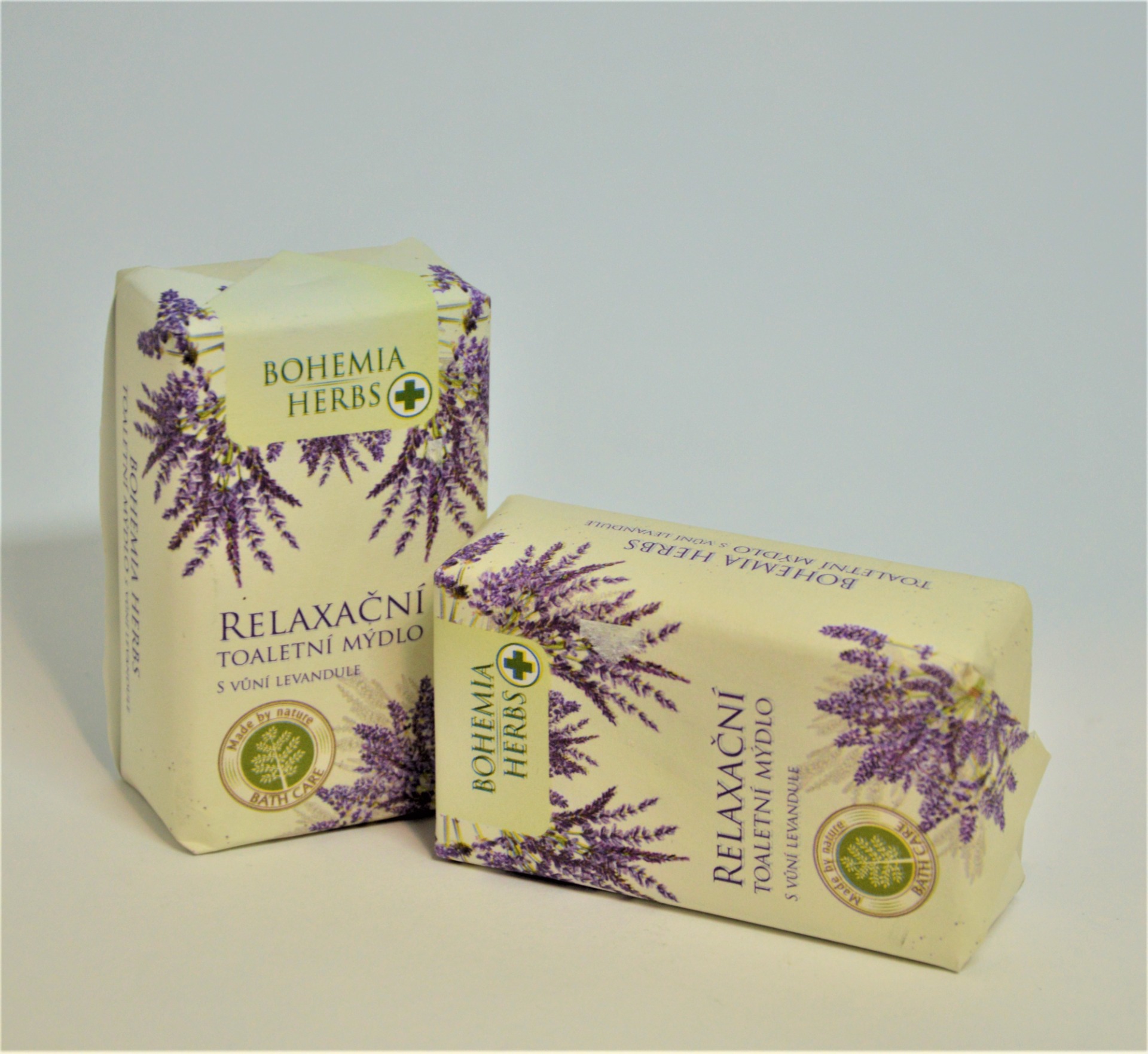 Relaxační toaletní mýdlo Bohemia Herbs s vůní levandule - s glycerinem a extrakty z bylin, z heřmánku pravého, měsíčku lékařského, šalvěje lékařské, kopřivy dvoudomé, břízy bílé.