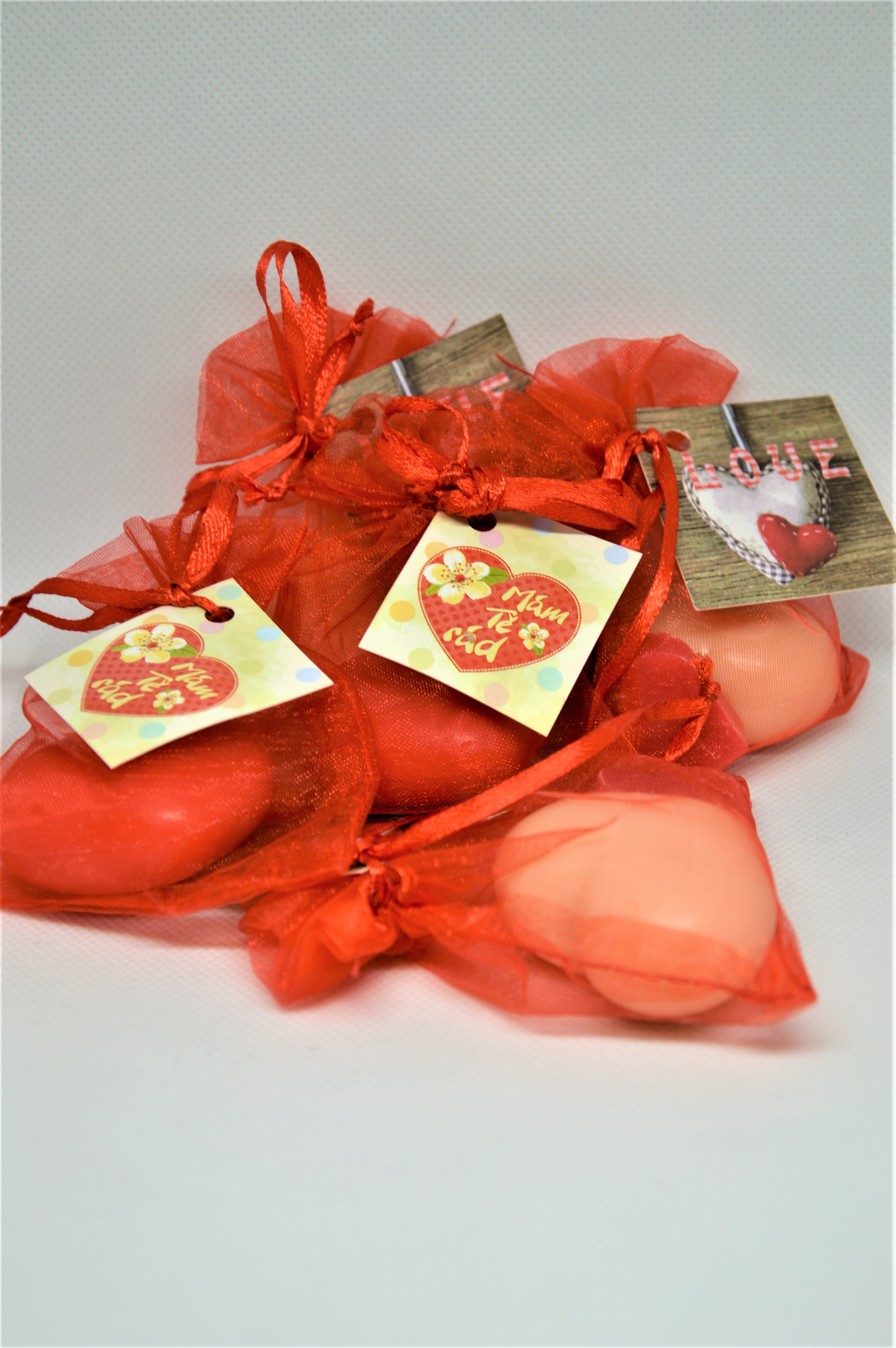 Voňavá buclatá glycerinová mýdla ve tvaru srdce zabalená v červeném pytlíčku z organzy s originální designovou cedulkou.