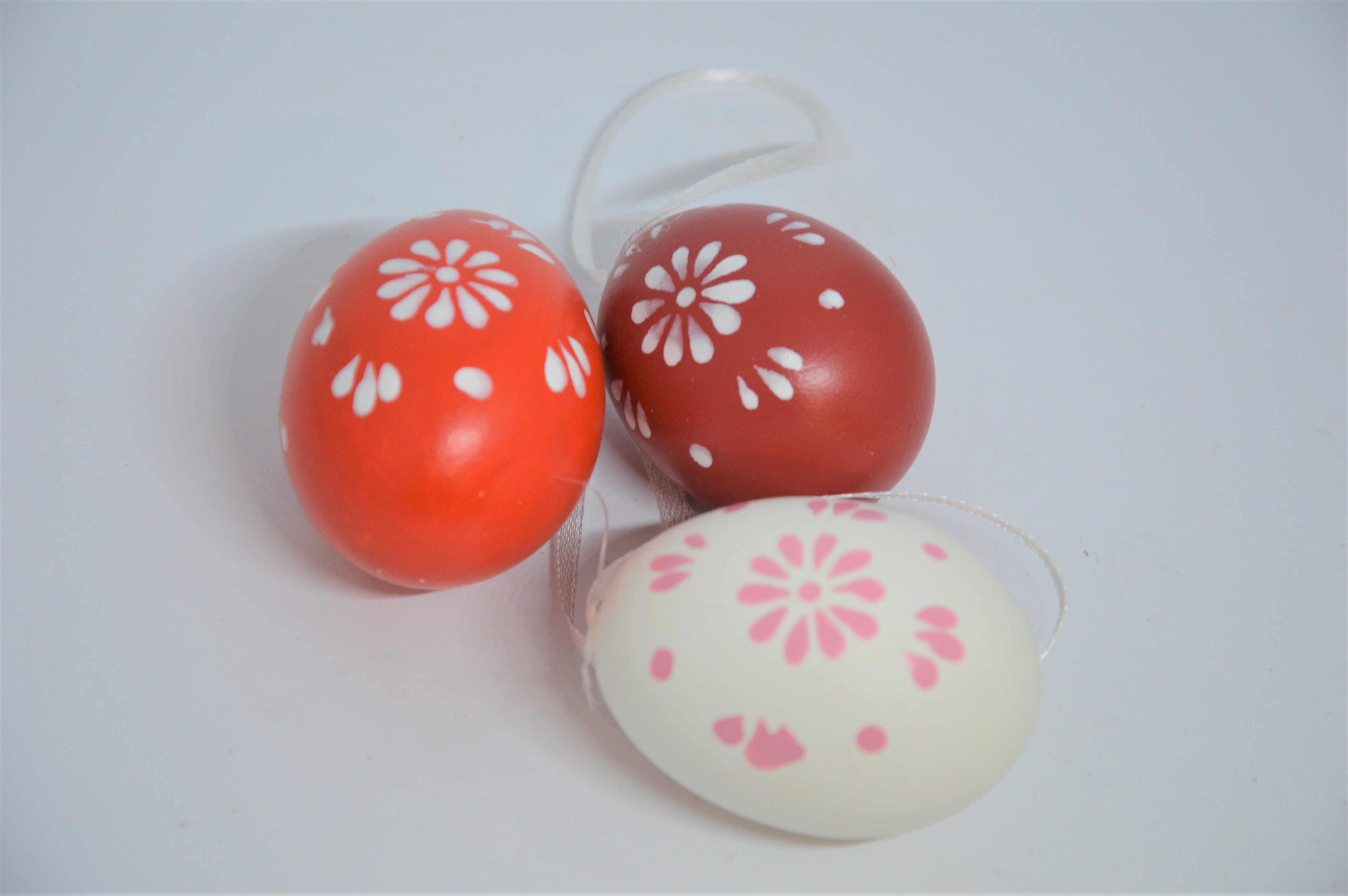 Červené kraslice na pověšení - malované kraslice z pravých vajíček v červeno-bílé variantě můžete pověsit třeba na rozkvetlé větvičky kočiček, zlatého deště, třešní nebo vrby, které máte umístěné ve váze. Vytvoří dokonalou velikonoční atmosféru.