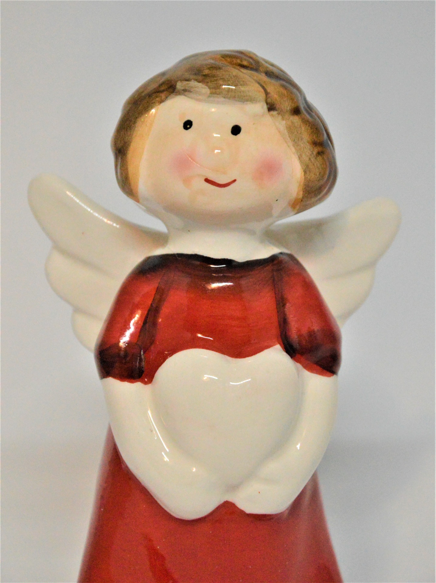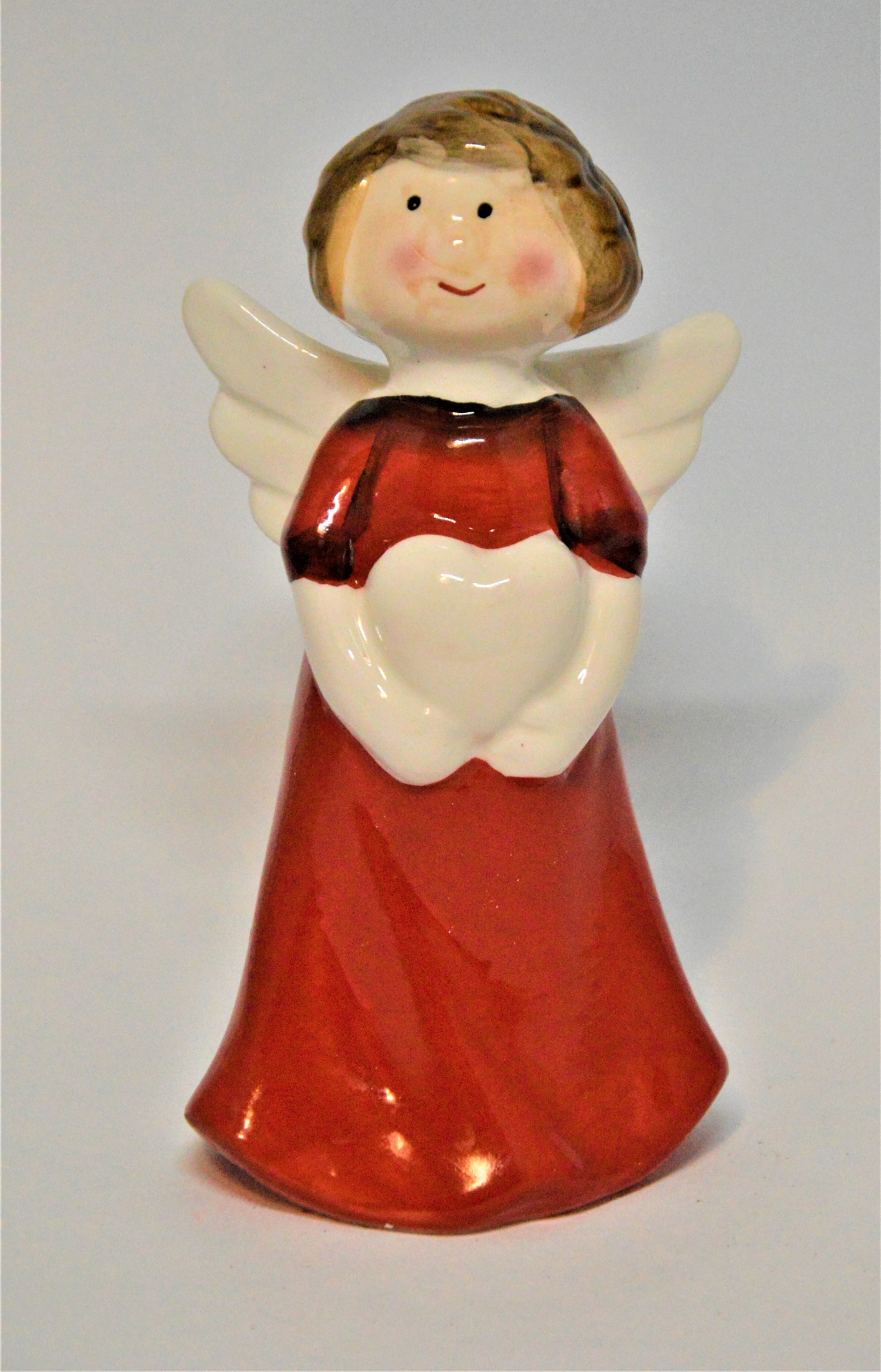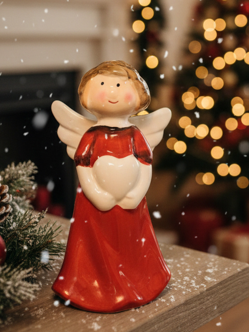 Červený keramický andělíček - v červených šatech, s bílými křídly, bílýma rukama a s krátkými hnědými vlásky. V ruce drží bílé srdíčko - symbol lásky, krásně tak poslouží k obdarování vašich nejbližších, kterým jeho prostřednictvím můžete vyjádřit svoje city.