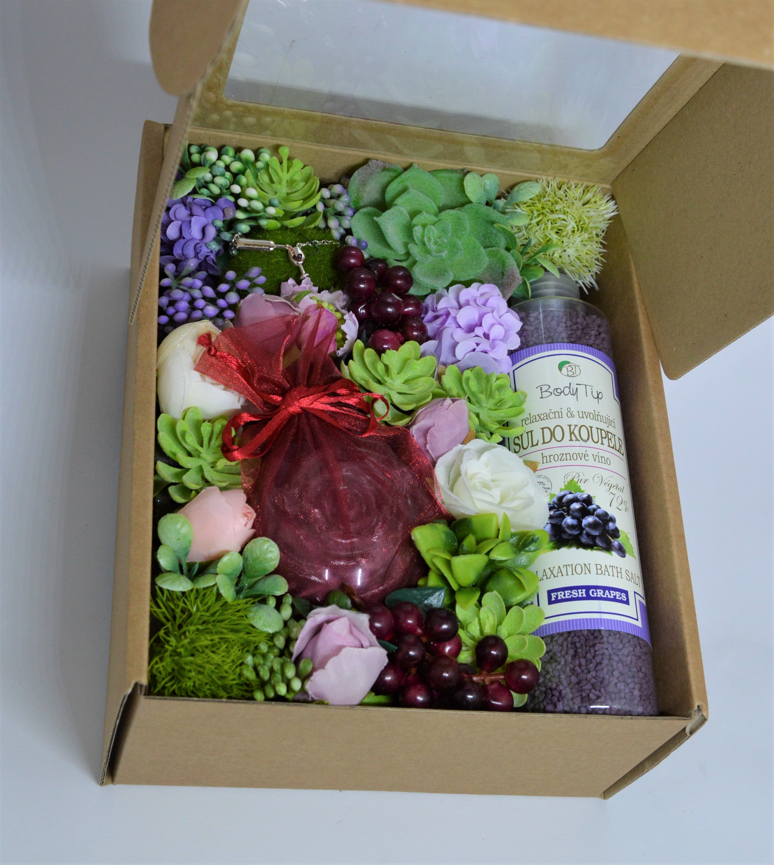 Dárková krabička Pro milovnice vína – originální a stylový dárek, který potěší především všechny milovnice vína. Obsahuje totiž jenom produkty, které jsou s tímto oblíbeným nápojem nějakým způsobem spjaty. Kratfová krabička s průhledným víkem je laděná do jemných odstínů fialové, které krásně doplňuje kombinace bílé a zelené. Kromě květin jsou k dekoraci použity také umělé hrozny. Krabičku zdobí světle fialová taftová stuha.