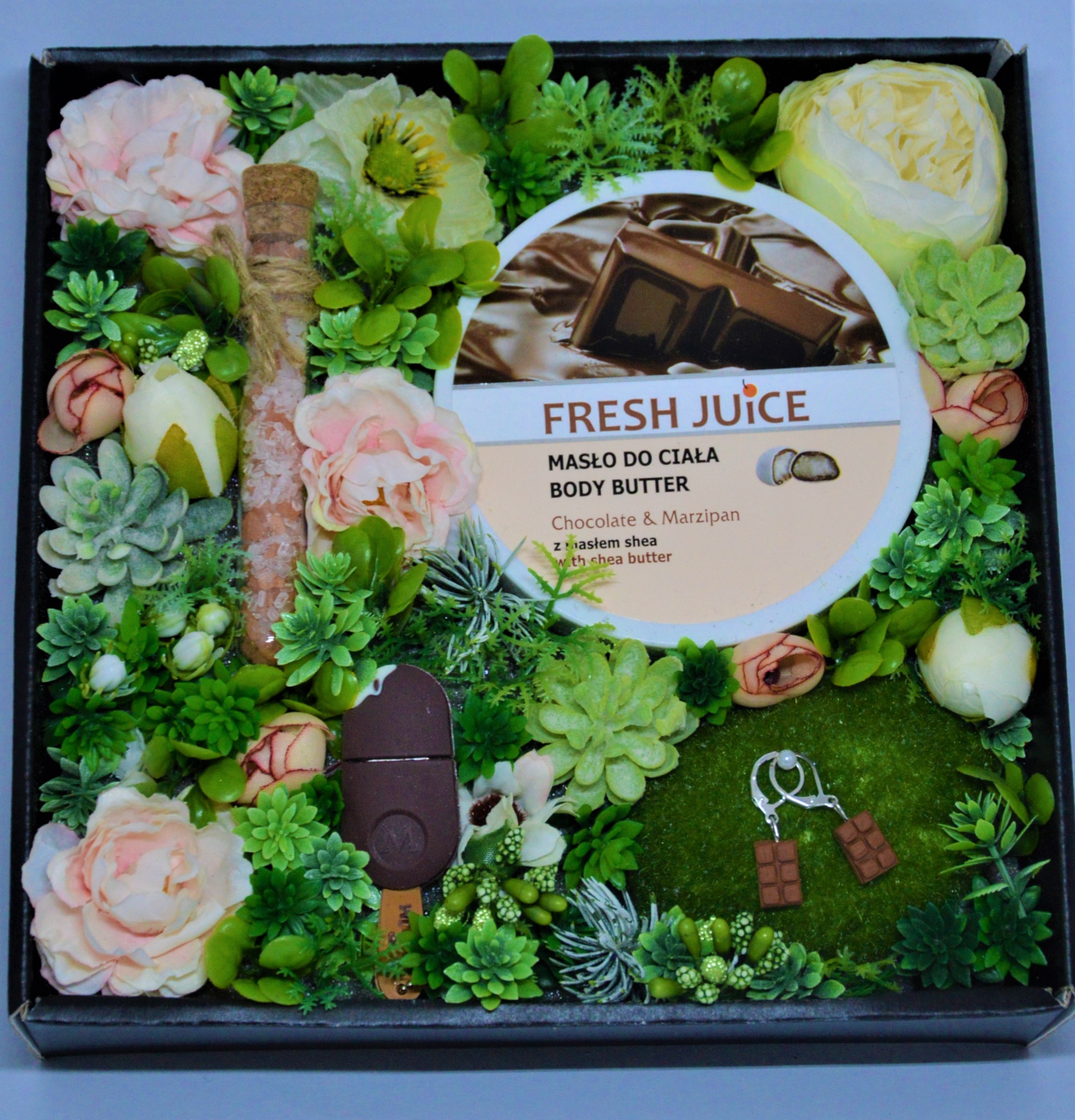 - něco pro potěšení - tělové máslo s vůní čokolády a marcipánu (s výživným máslem a mandlovým olejem, které vyživí a zkrášlí suchou pokožku. Objem: 225 ml)