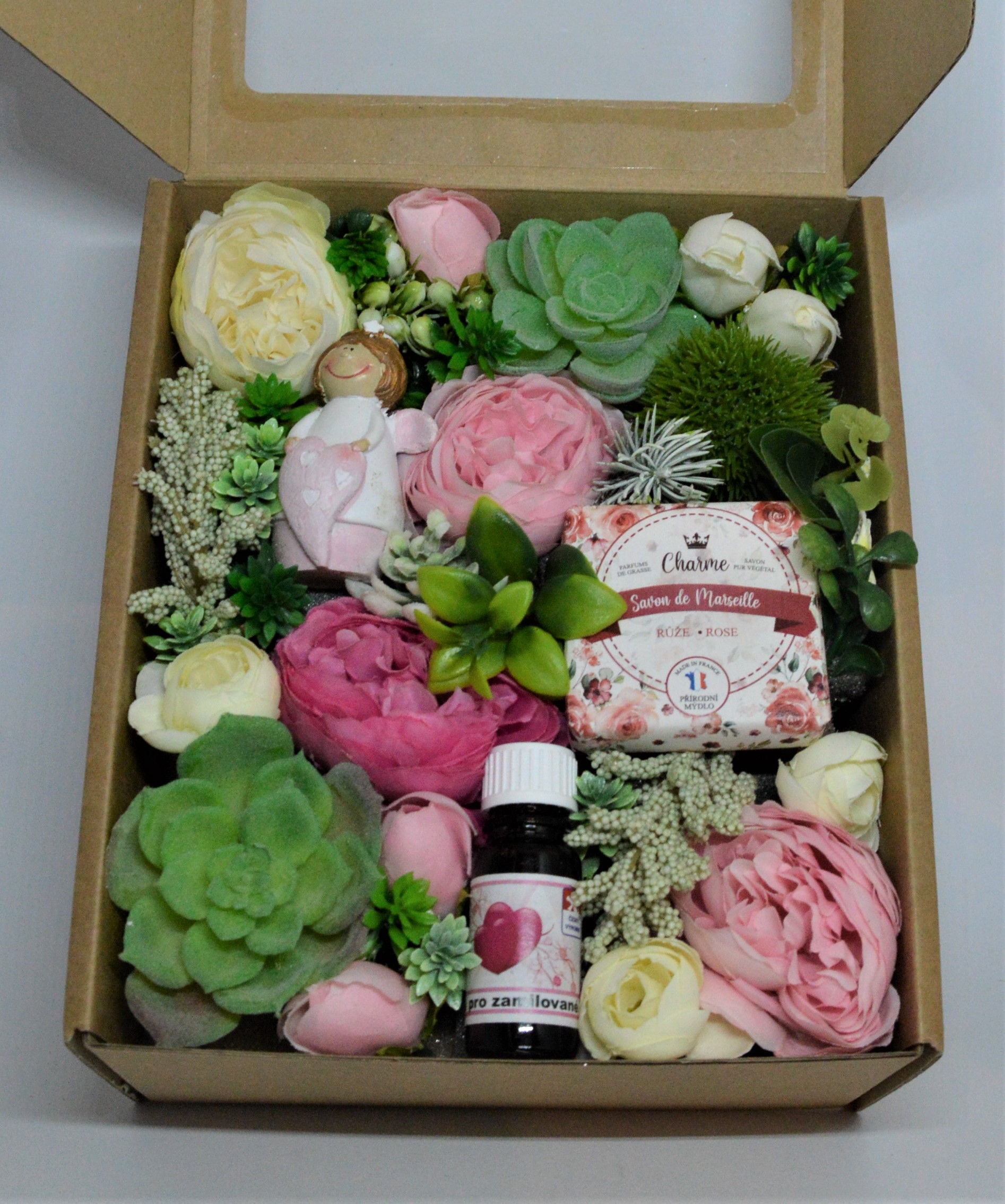 Kraftová krabička s průhledným víkem je laděna do růžovo-bílých barev, které doplňuje svěží zeleň. Zdobí ji světle růžová taftová stuha.