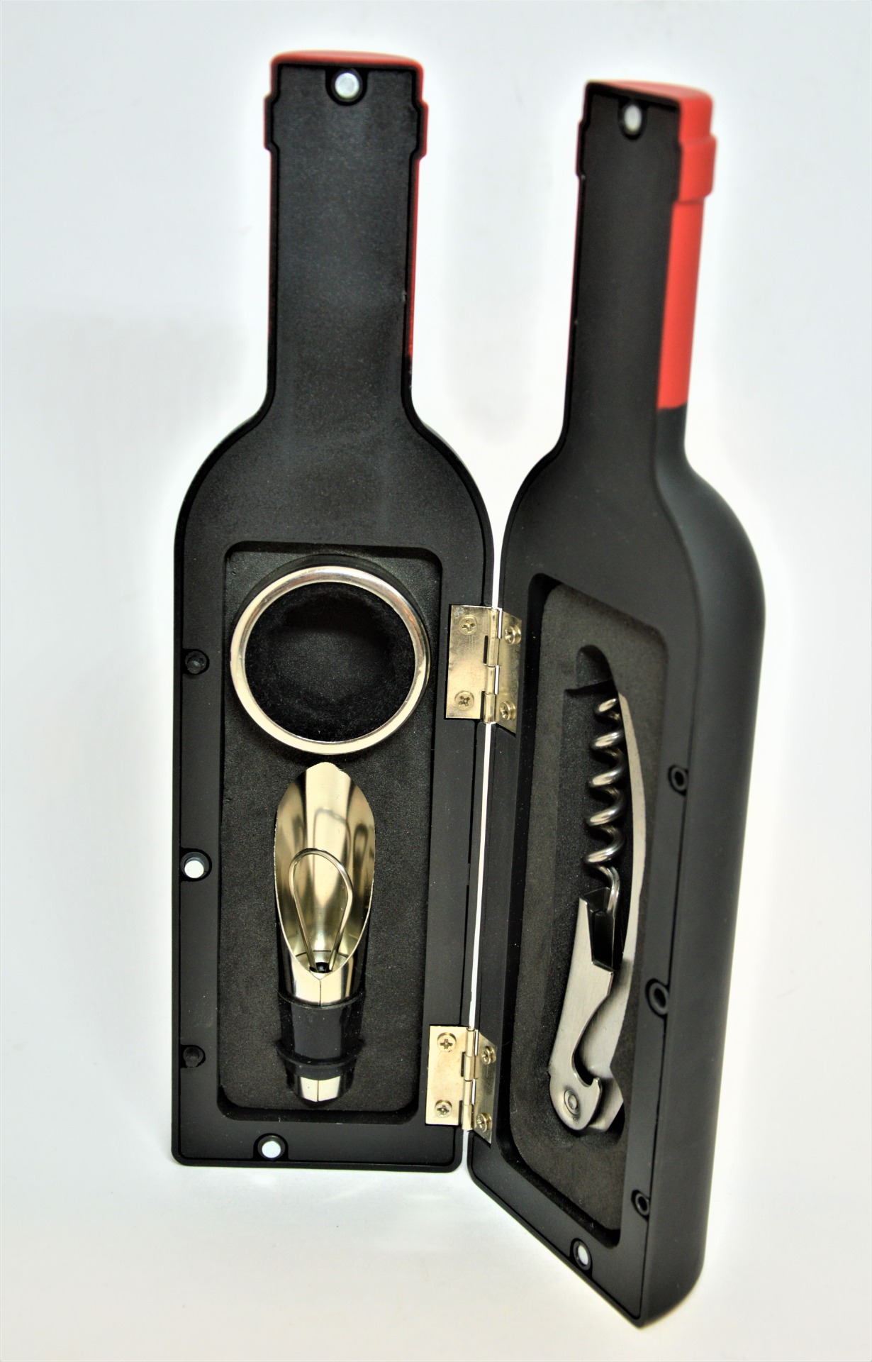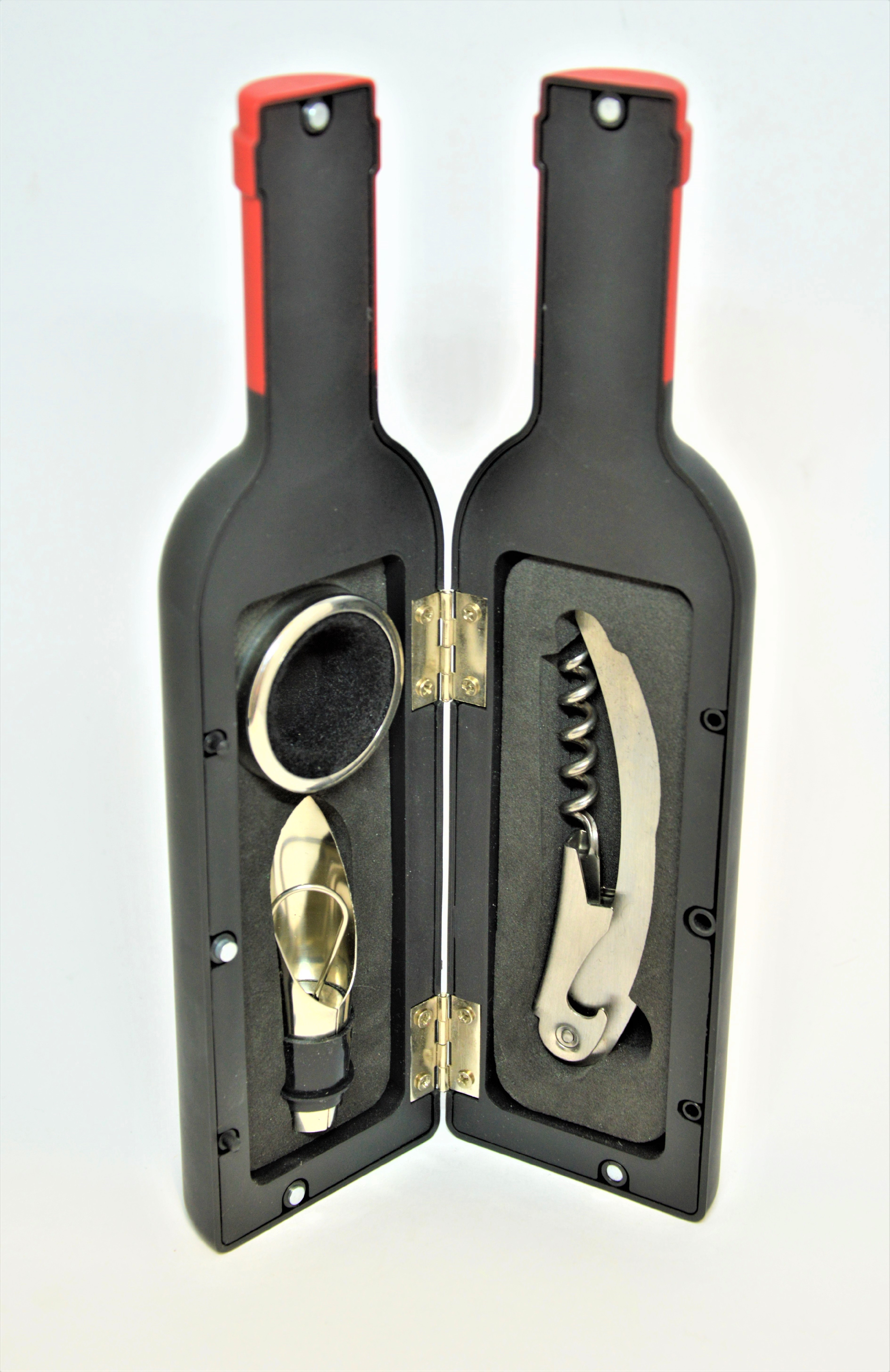 Dárková sada na víno ve tvaru lahve - pro snadnou manipulaci s vínem. Obsahuje víceúčelový otvírák na víno, nálevku se zátkou a kroužek na víno.