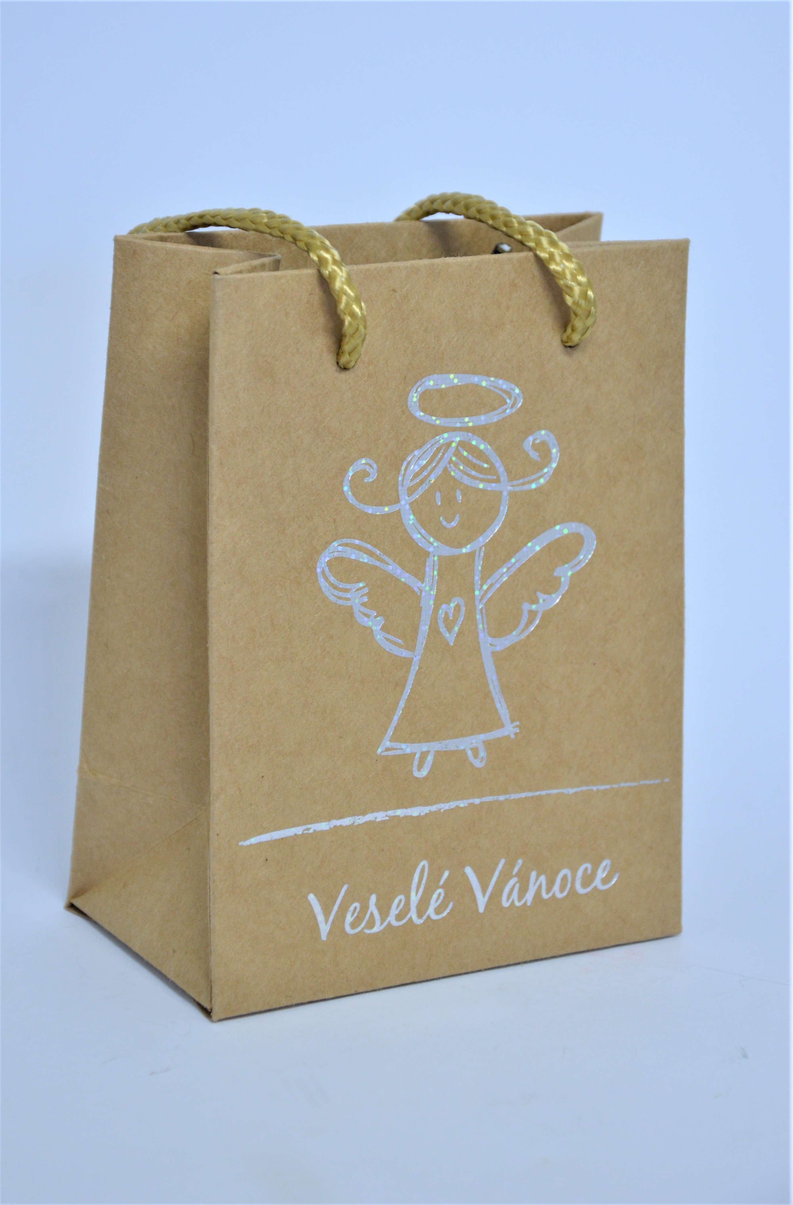 Dárková taška s andělem - nemáte čas, chuť ani trpělivost na balení dárků? Pak vás zachrání hnědá papírová taška s roztomilým motivem bílého anděla a bílým nápisem: Veselé Vánoce. Stačí do ní všechno hezky naskládat a máte hotovo!