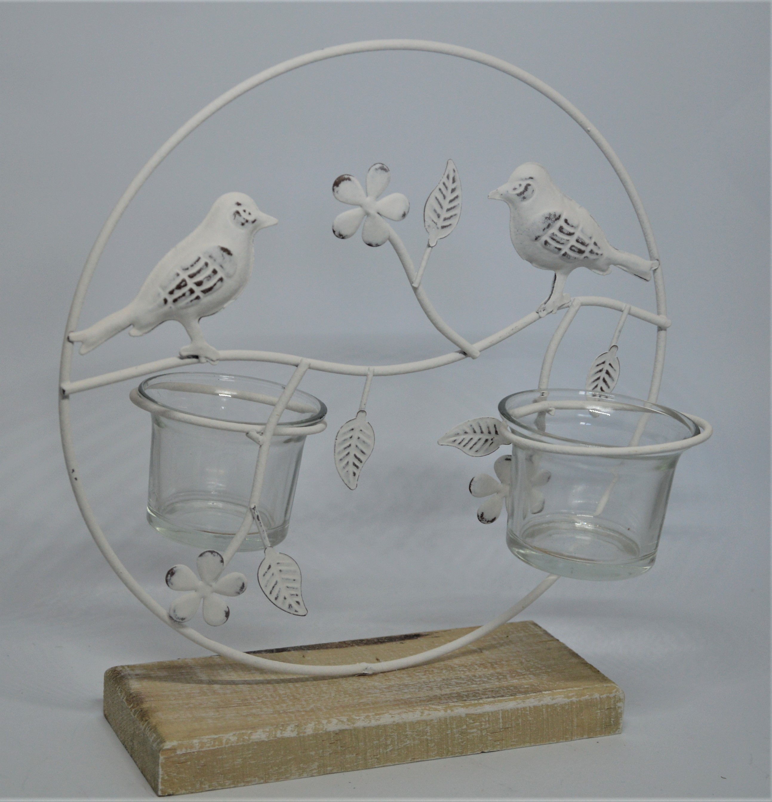 Dekorace s ptáčky na dvě čajové svíčky – netradičně řešený bílý kulatý svícen zdobený ptáčky a květinami se ve vašem interiéru bude vyjímat v každém ročním období.