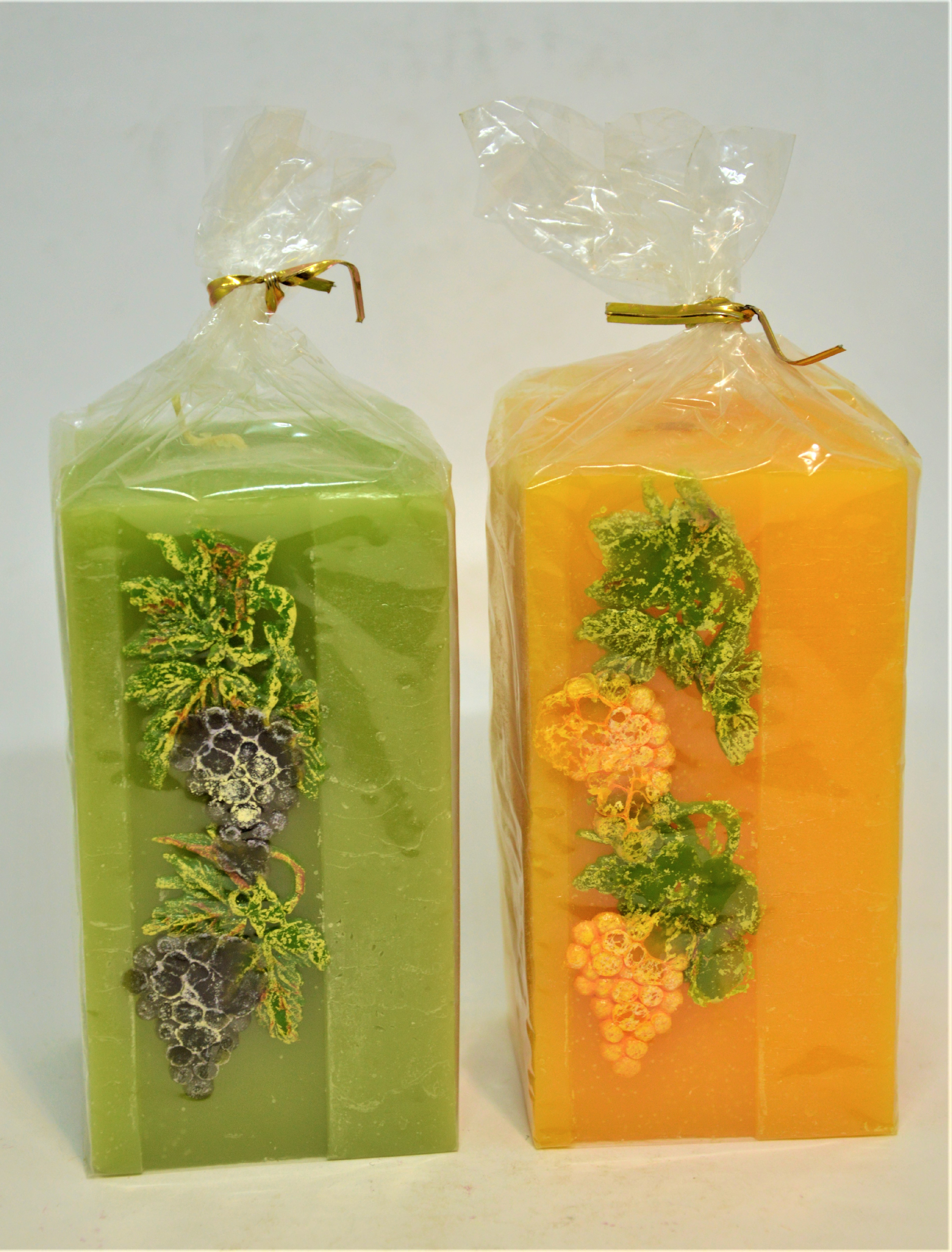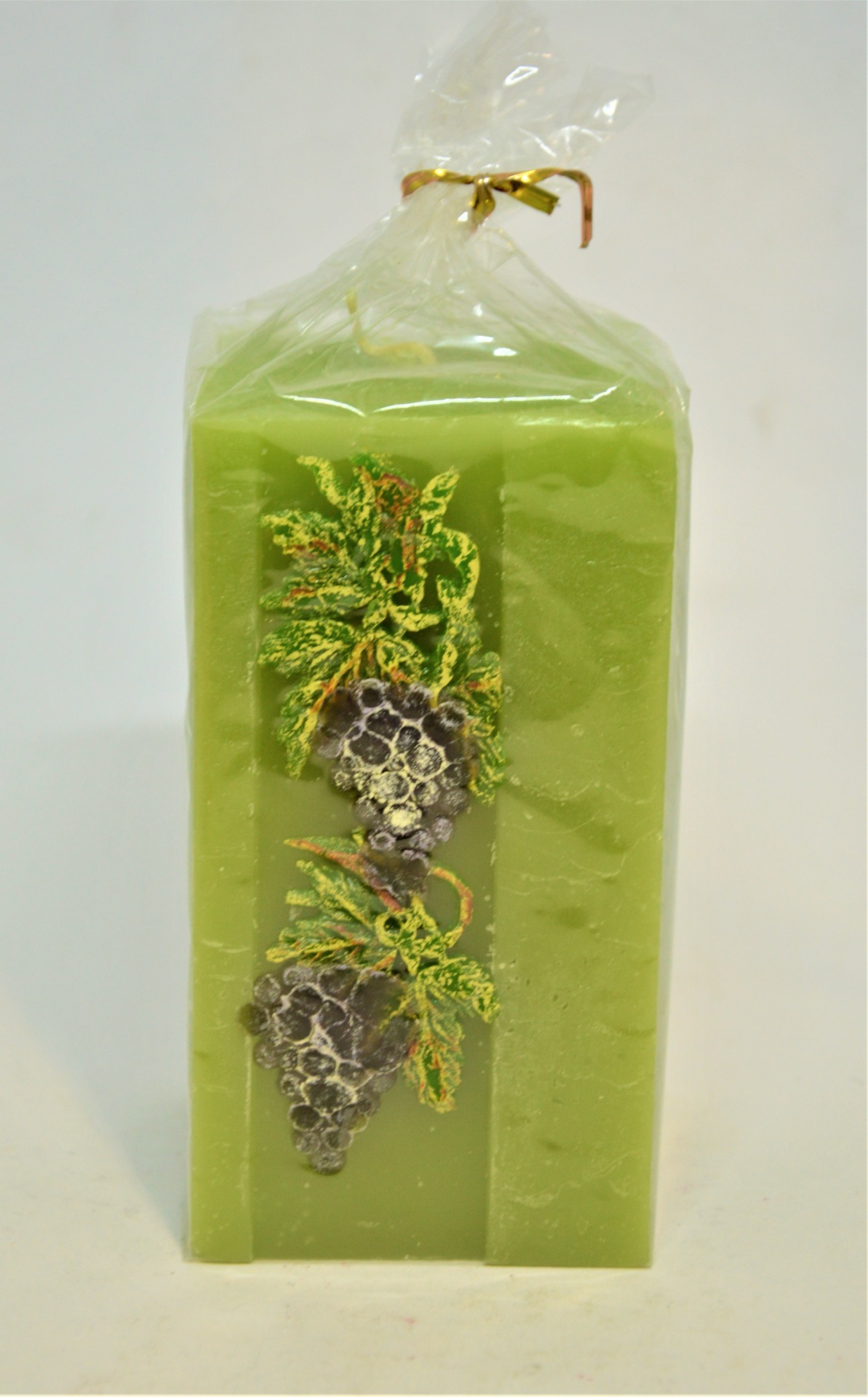 Dekorační svíčka s motivem vinné révy a hroznu - vonná, ve tvaru hranolu. Vytvoří příjemnou romantickou večerní atmosféru třeba při popíjení lahodného vína.