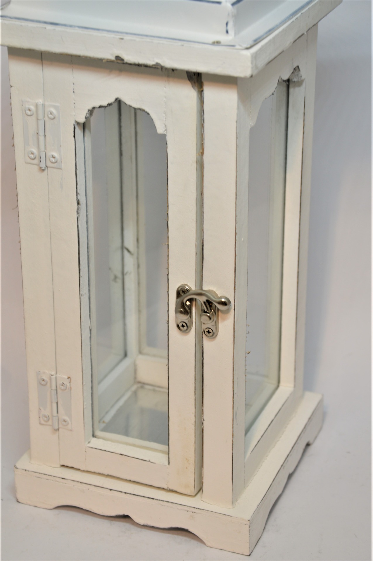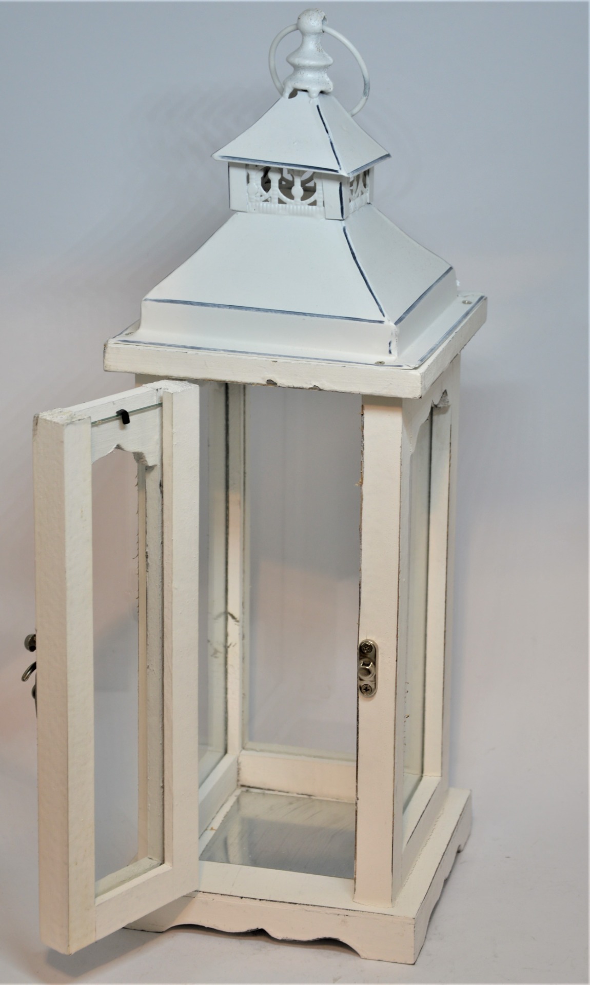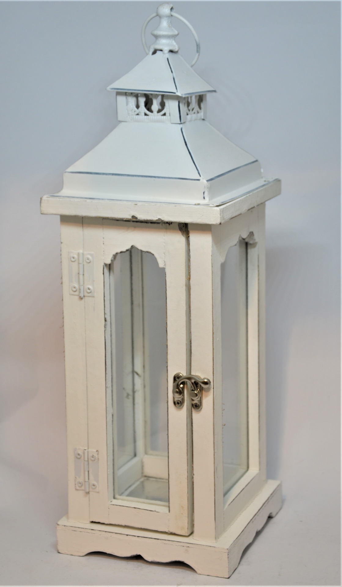 Bílá dřevěná lucerna s kovovou stříškou - na zavěšení, stojící na malém podstavci. Stěny zdobené úzkými podlouhlými okny.