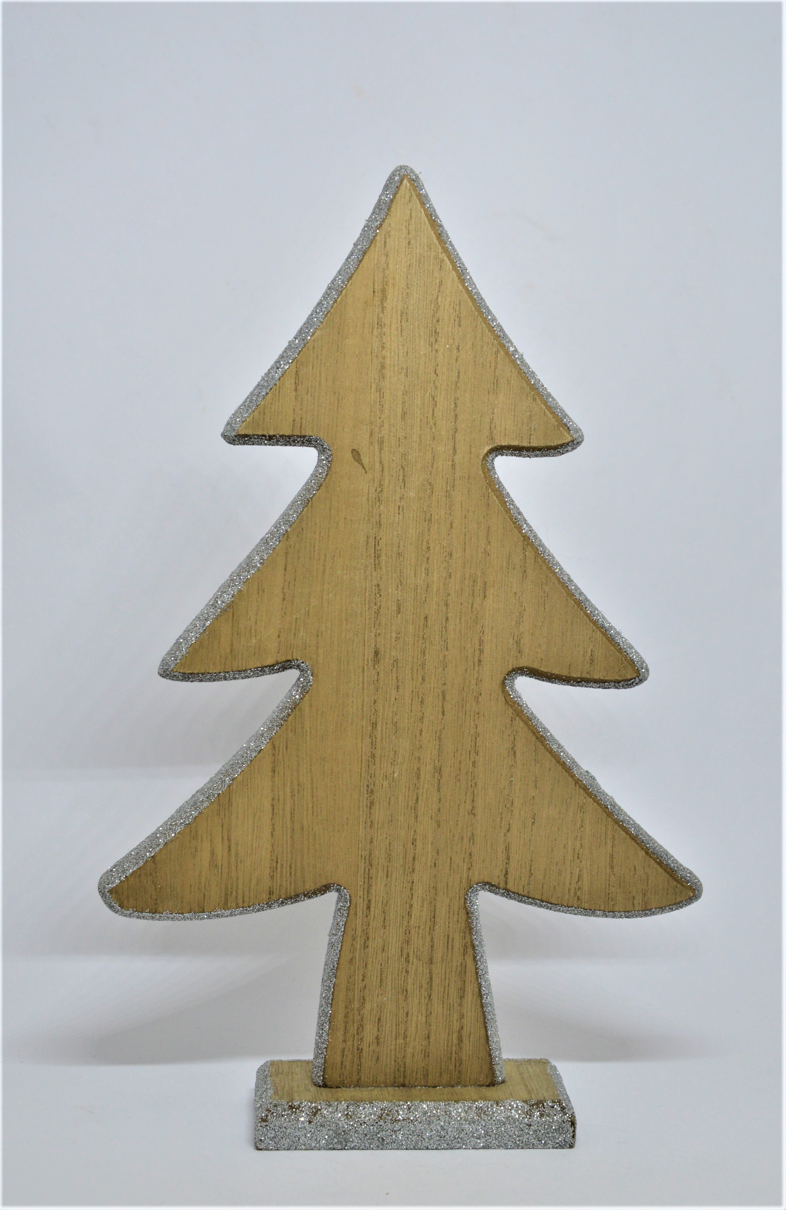 Dřevěný vánoční stromeček - umístěný na podstavci pro lepší stabilitu. Jednoduchý přírodní kousek je ozvláštnění stříbrnými třpytkami, které jsou rozeseté po jeho obvodu.
