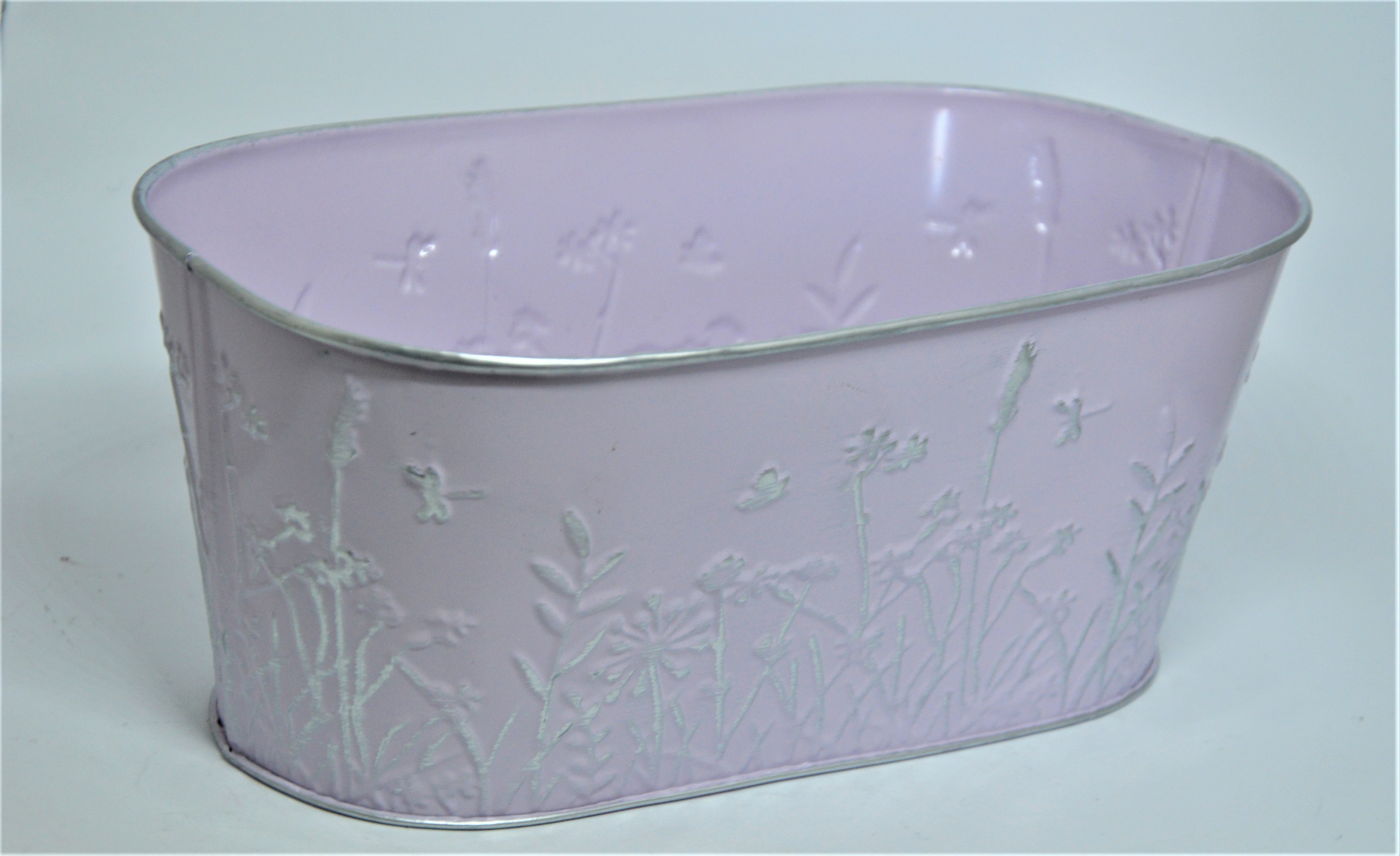 Fialový truhlík na květiny – praktický kovový truhlík na květiny v jemné fialkové barvě zdobí motivy rostlin, vážky a motýlů.