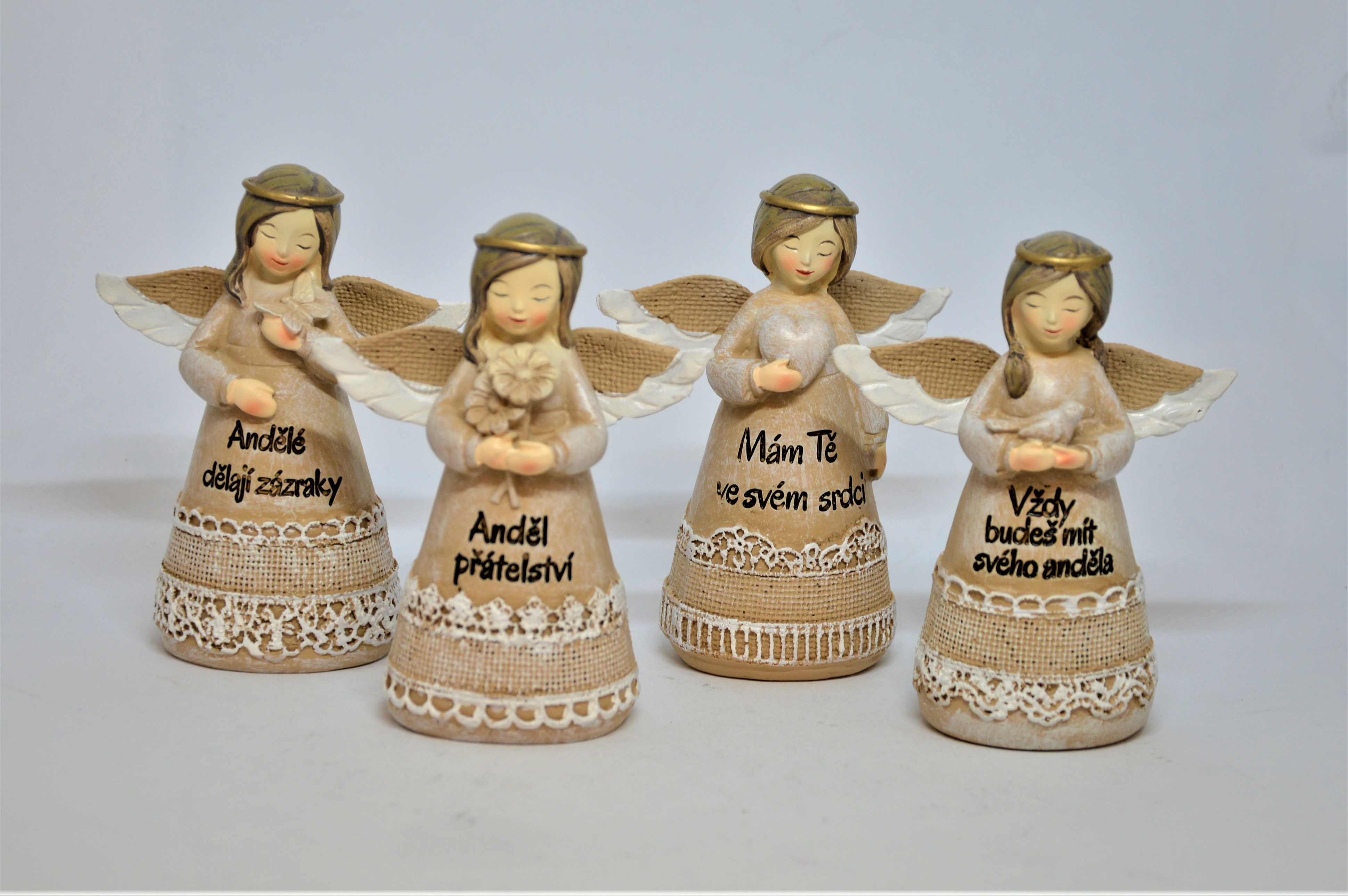 Roztomilý a něžně působící anděl - s čelenkou ve vlasech a s minimalisticky zdobeným obličejem oblečený do šatů zdobených krajkou a opatřených všeříkajícím nápisem. Díky němu skvěle poslouží jako dárek pro vaše milované.