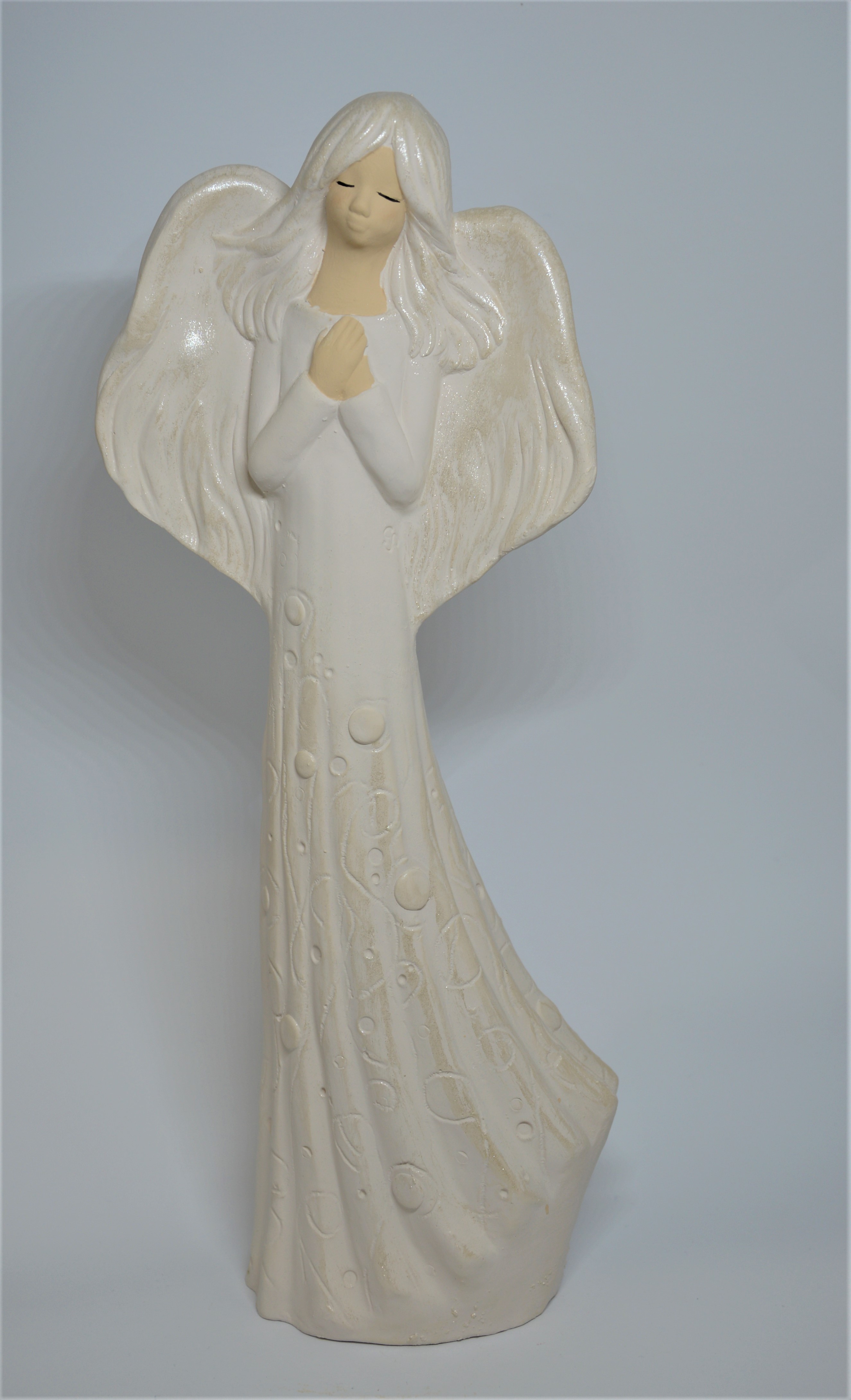 Sádrový jednobarevný anděl s rukama sepjatýma na hrudi. Díky svému jednoduchému provedení, hladkým liniím a neutrální krémové barvě se skvěle hodí do jakéhokoli interiéru.