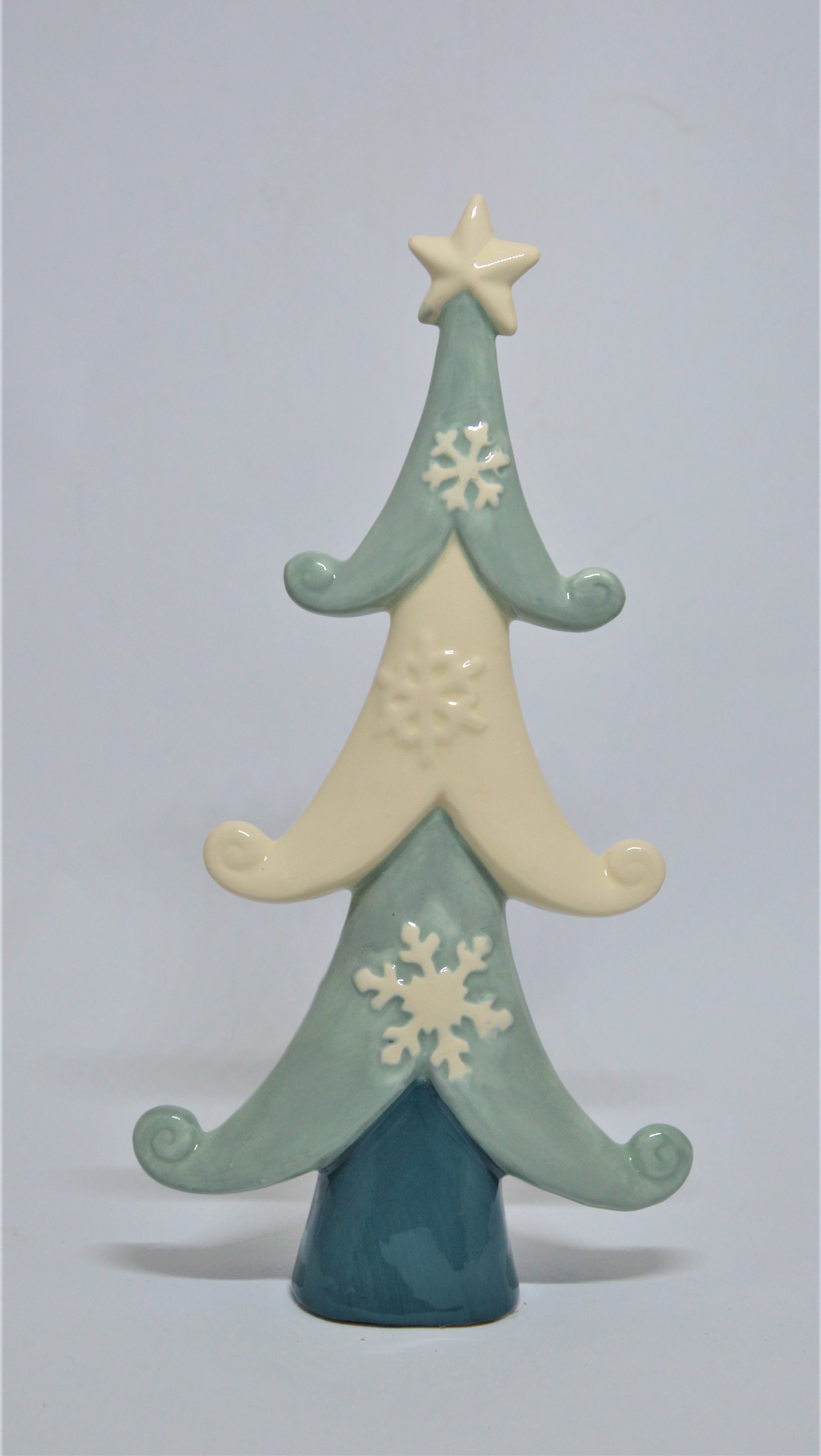 Keramický vánoční stromeček - modro-bílý, oboustranný stromeček se sněhovými vločkami a s bílou hvězdou nahoře.