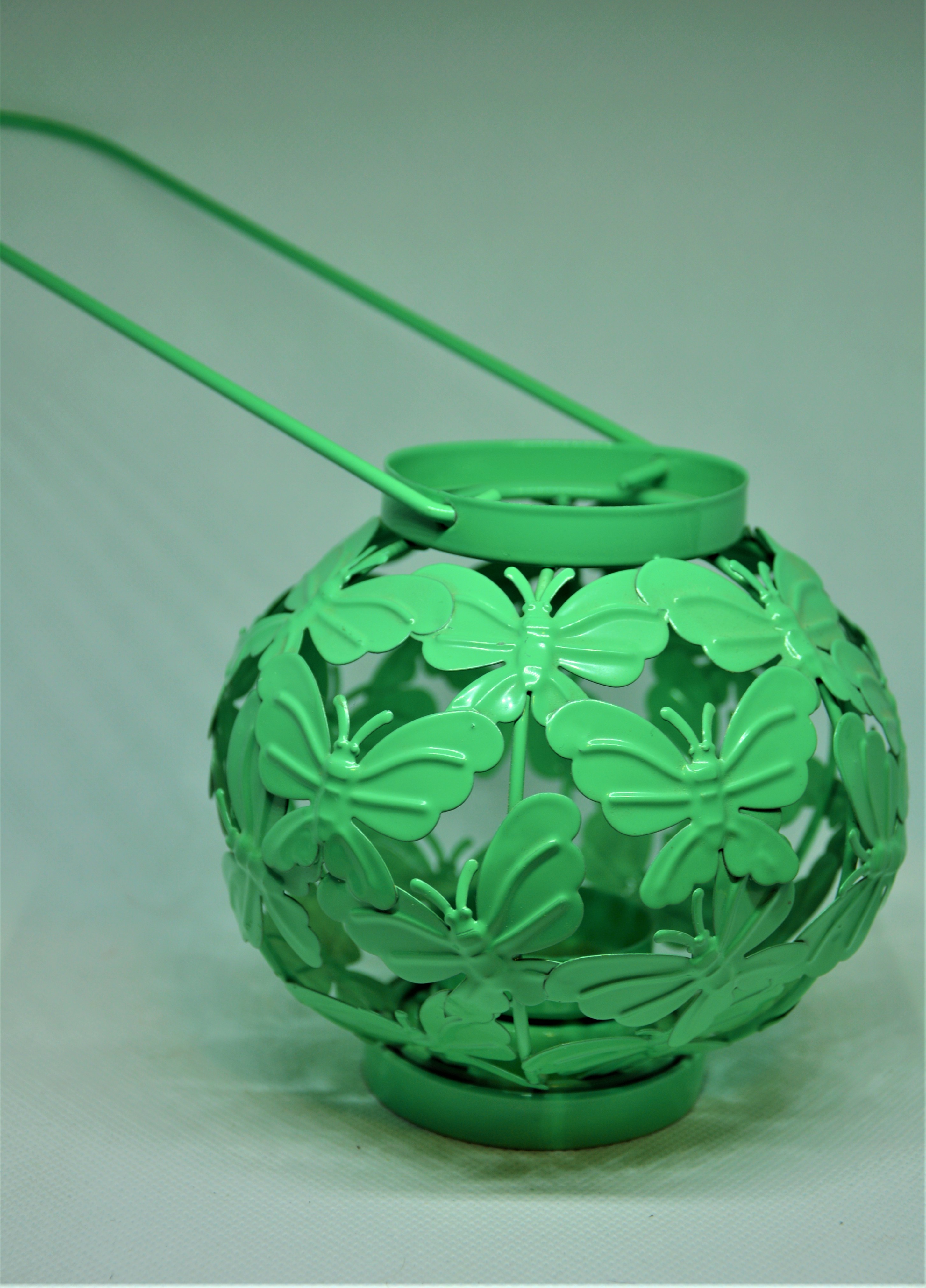Zelená kovová lucerna na čajovou svíčku s dlouhým uchem na zavěšení - s motýlky.