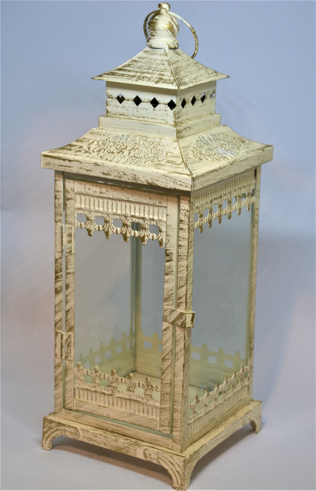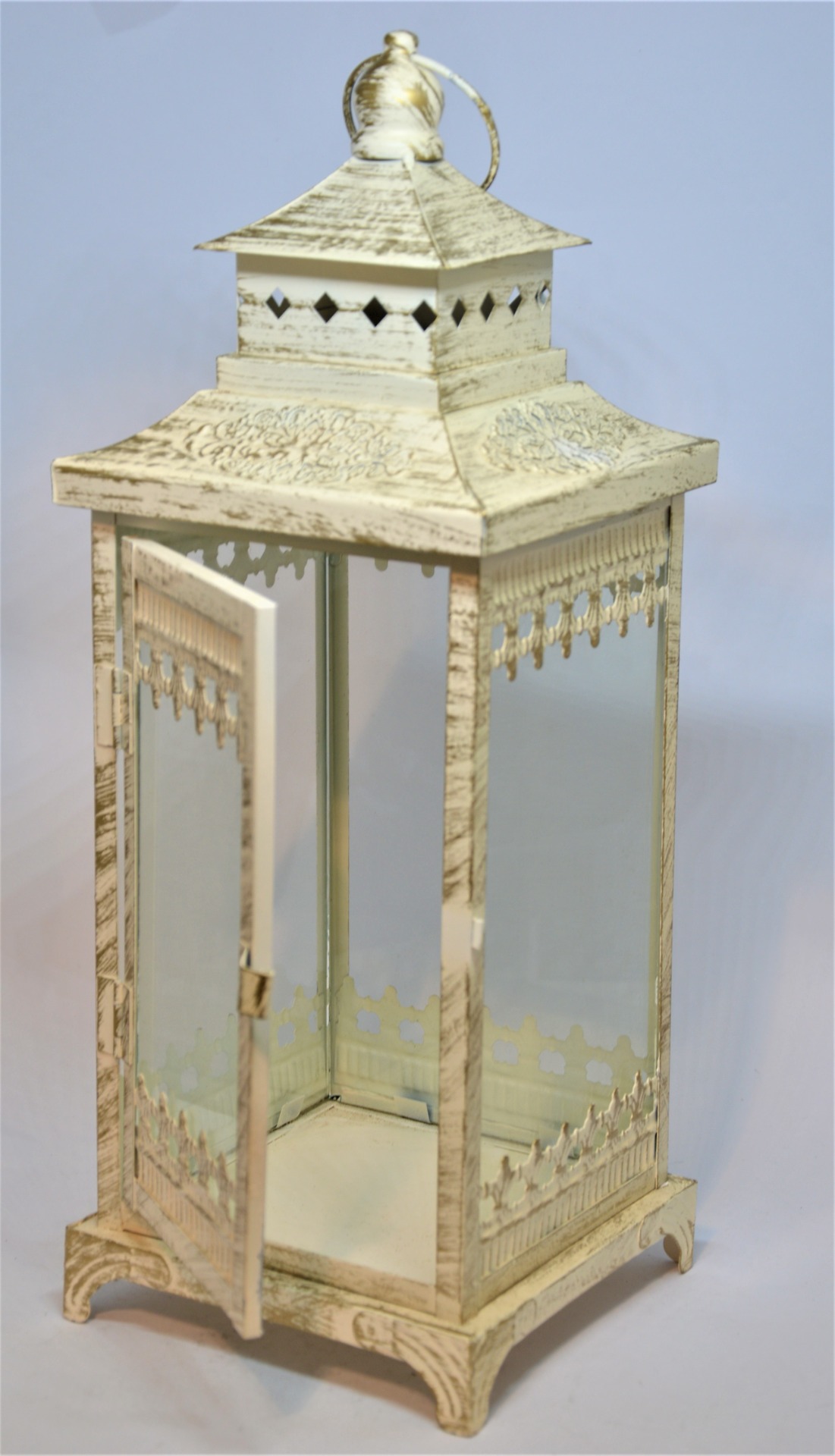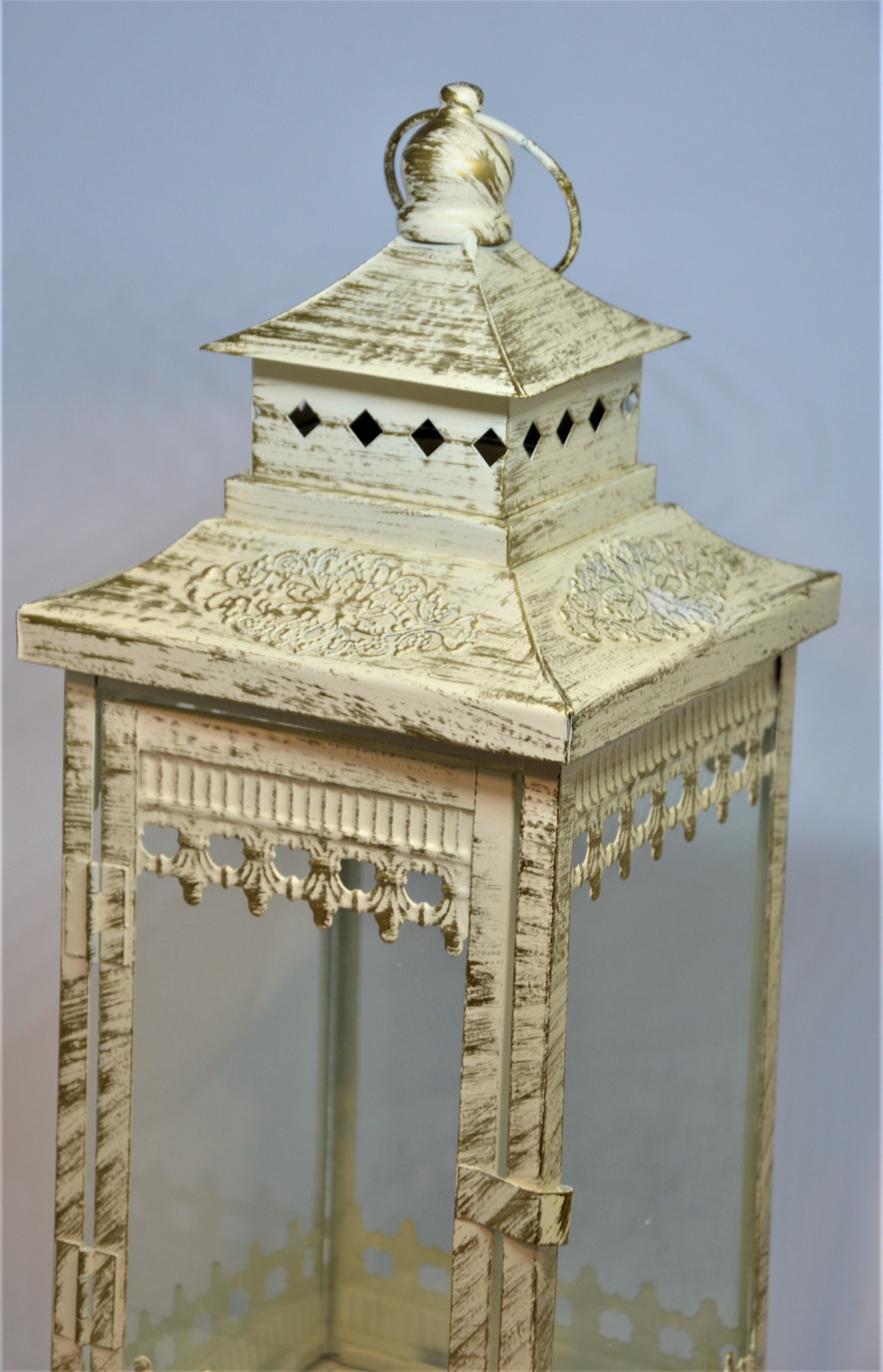 Bílá kovová lucerna - na zavěšení. Nad lucernou s bílou patinou a nezvyklými ozdobnými prvky, které lemují spodní a horní část prosklených stěn, zaplesají především milovníci romantiky, vintage a provence stylu.