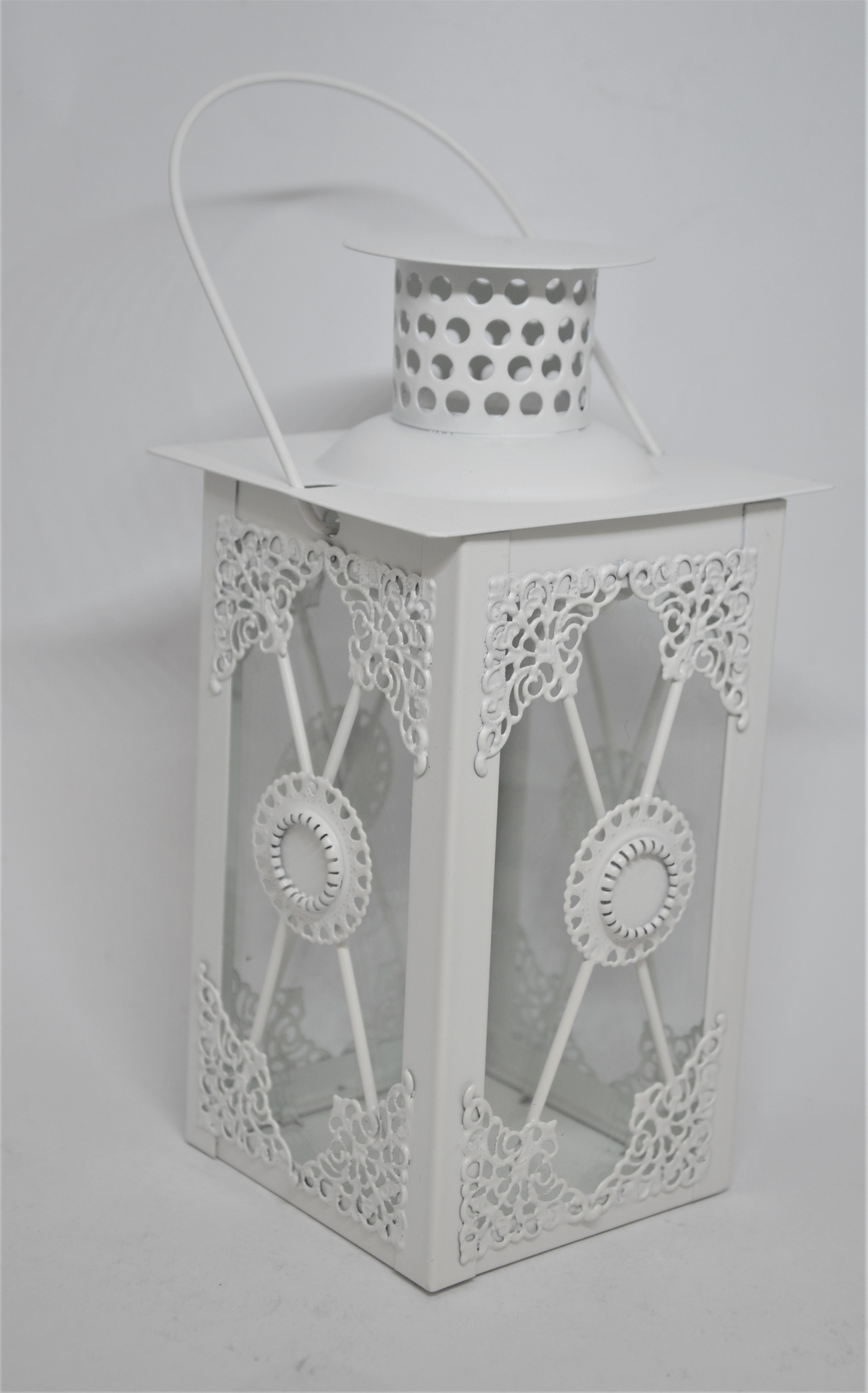 Kovová lucerna - bílá kovová lucerna se zajímavě zdobenými bočními skly.