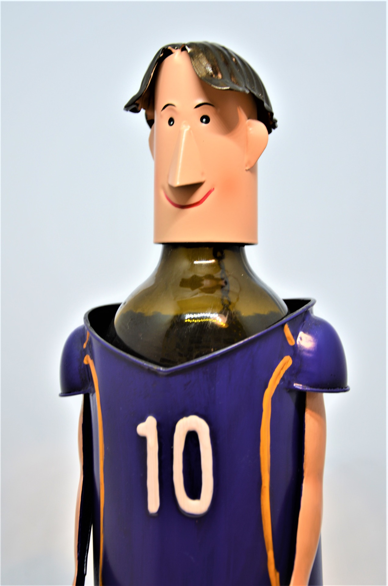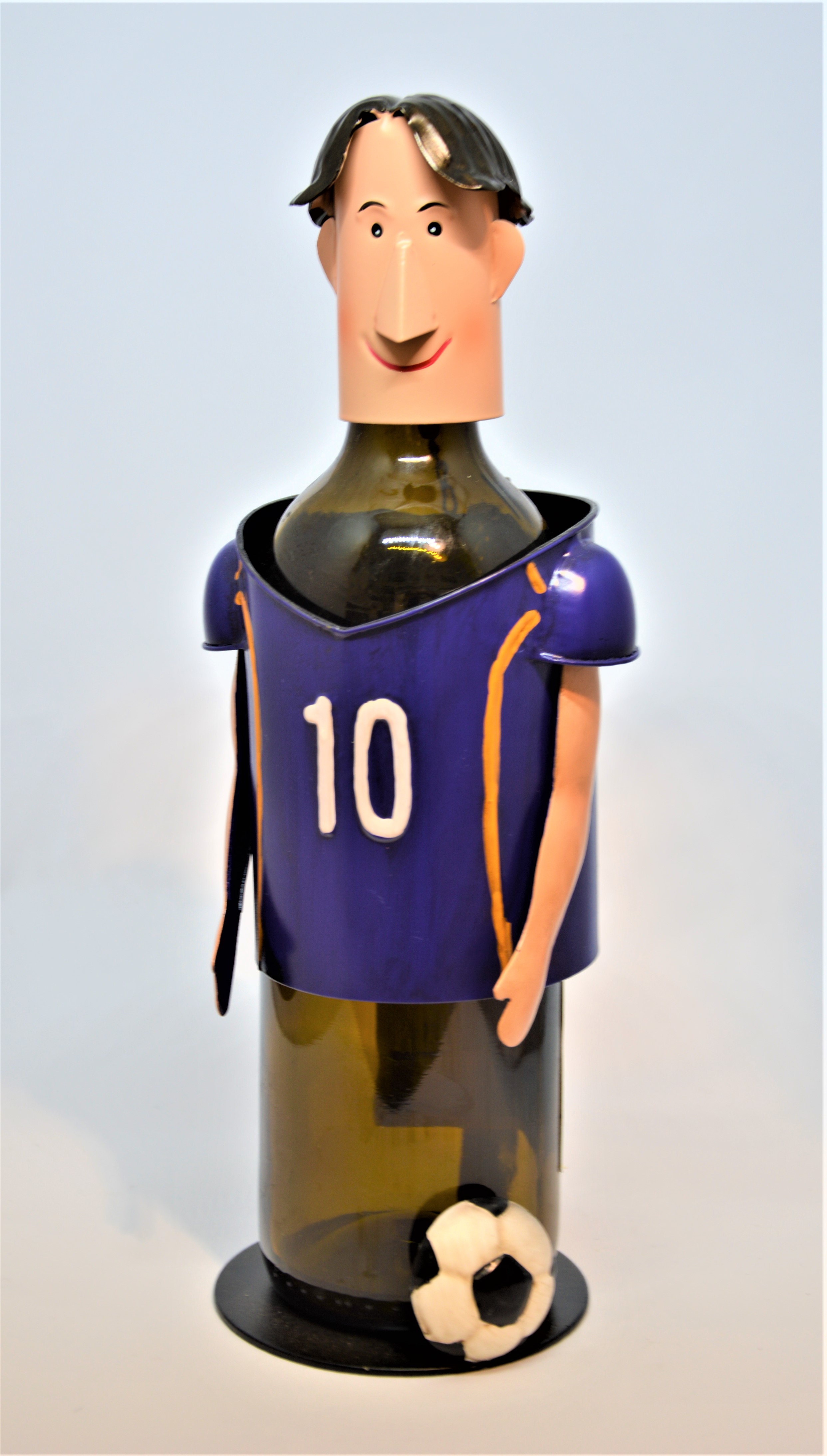 Kovový stojan na víno Fotbalista - “oblečený” v barevném dresu - barevný, ručně vyráběný originální stojan potěší všechny milovníky dobrého vína a příznivce fotbalu. Praktický dárek, který udělá radost oslavenci k narozeninám, uplatní se však i při mnoha dalších příležitostech.