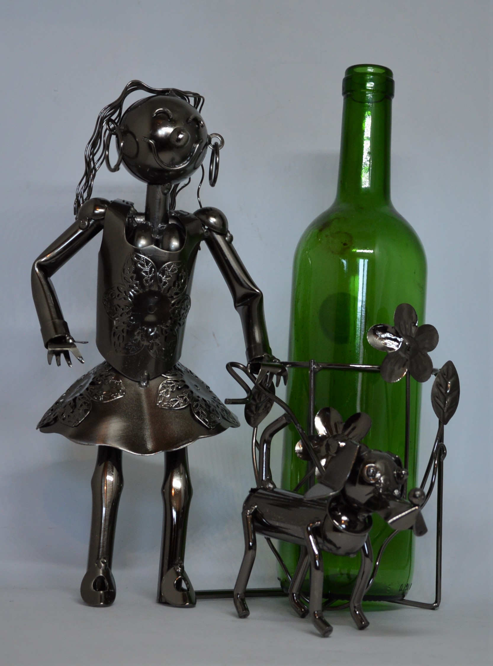 Kovový stojan na víno Pejskaři – ručně vyráběný originální stojan, který zobrazuje dívku na procházce se psem. Potěší nejen všechny milovníky dobrého vína, ale i všechny příznivce čtyřnohých chlupatých mazlíčků a venčení.