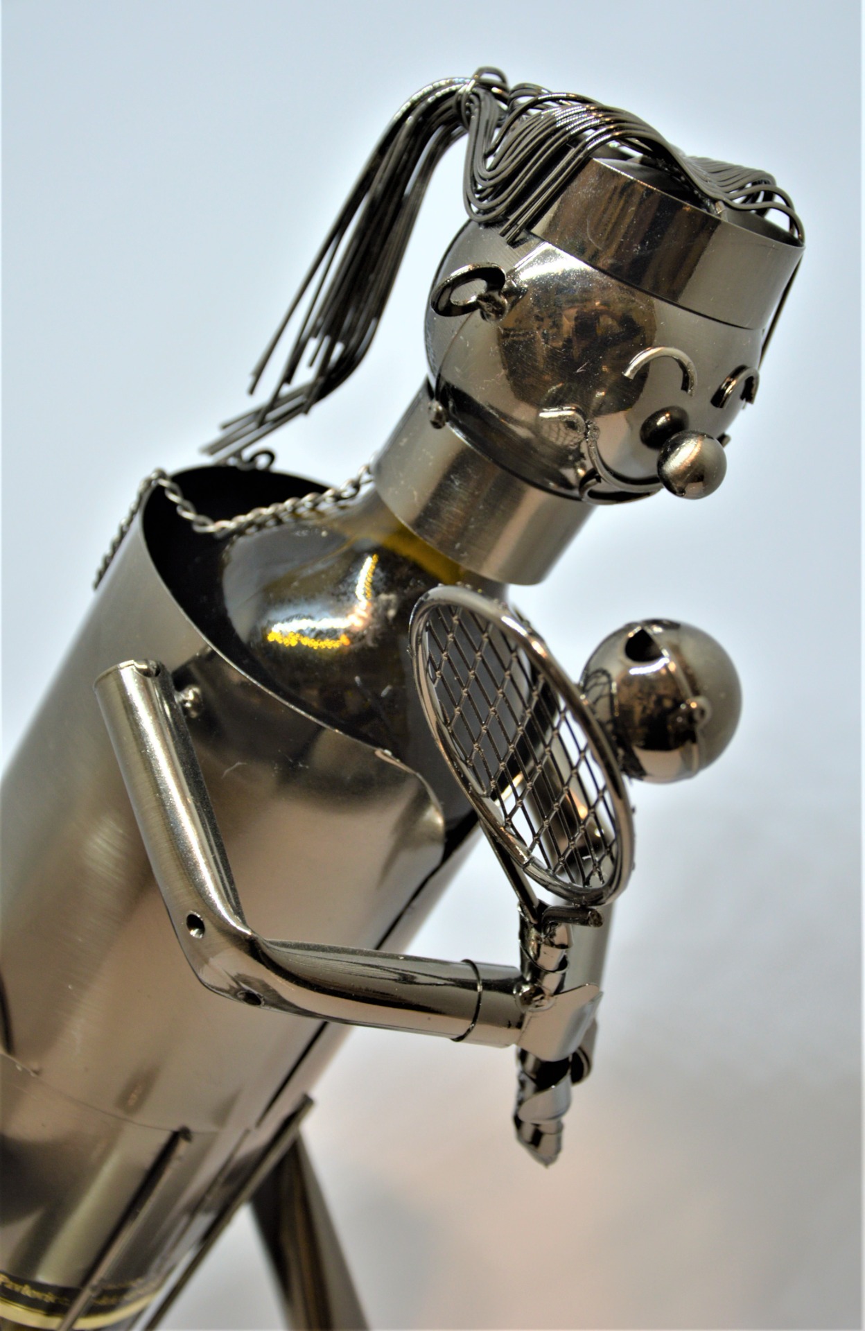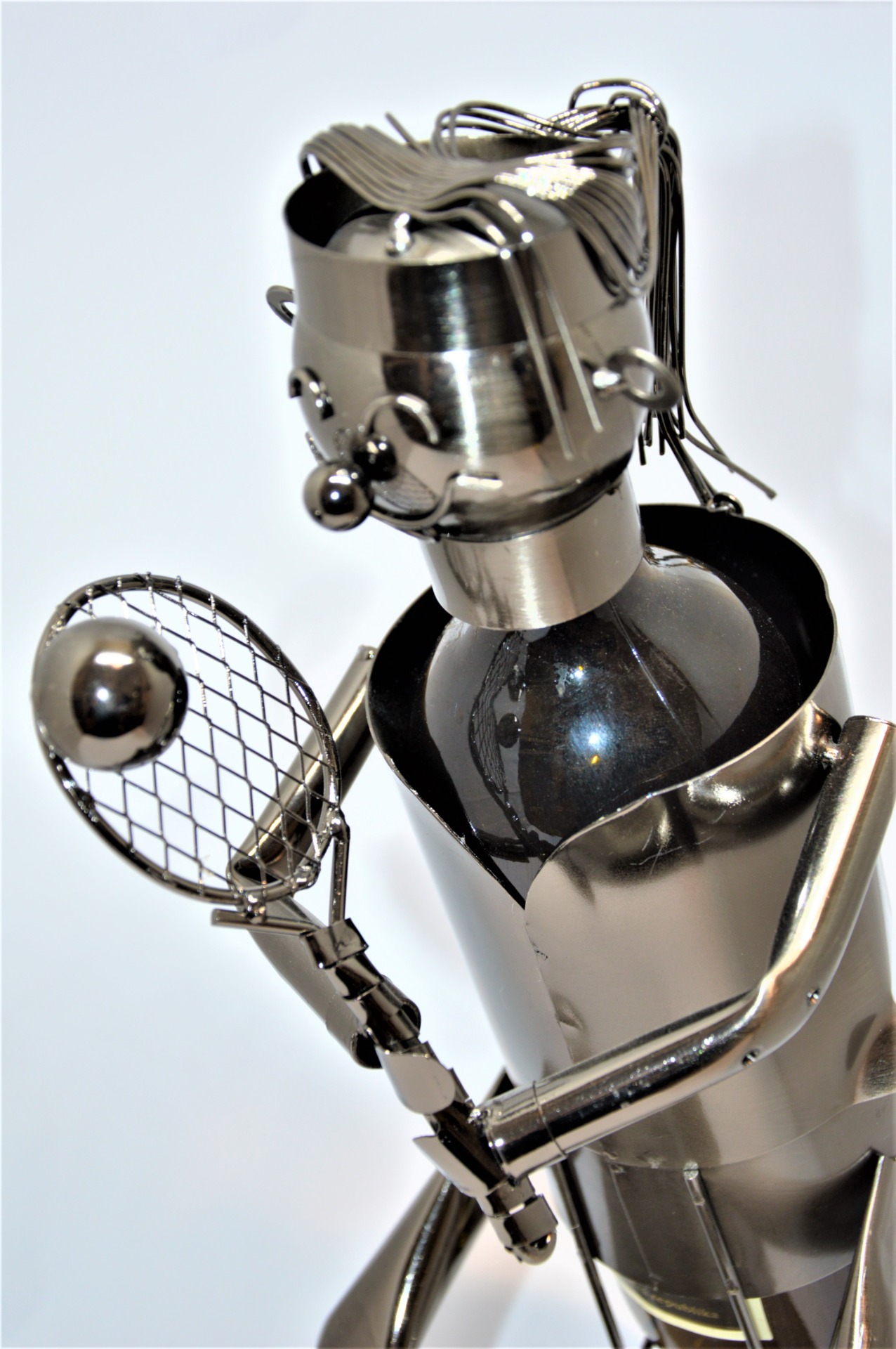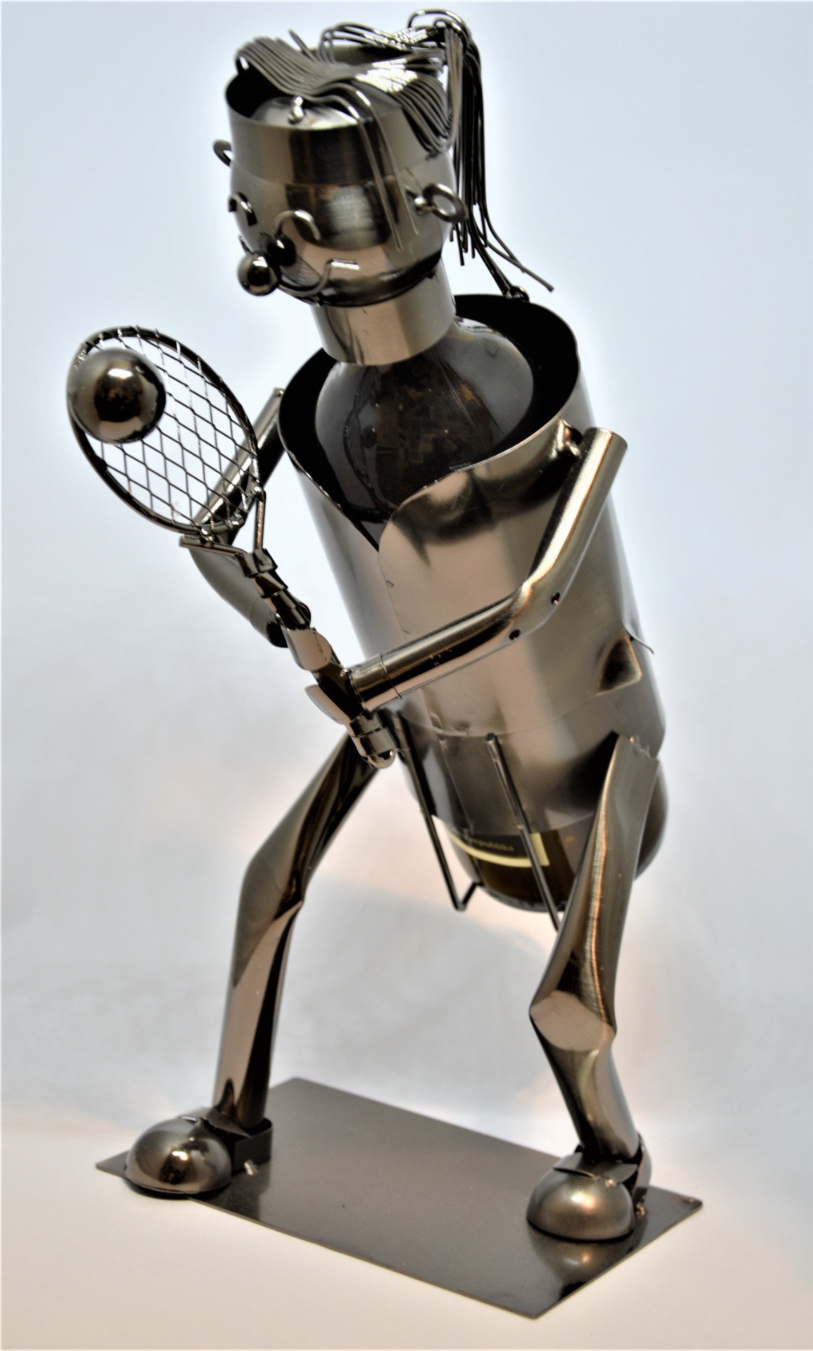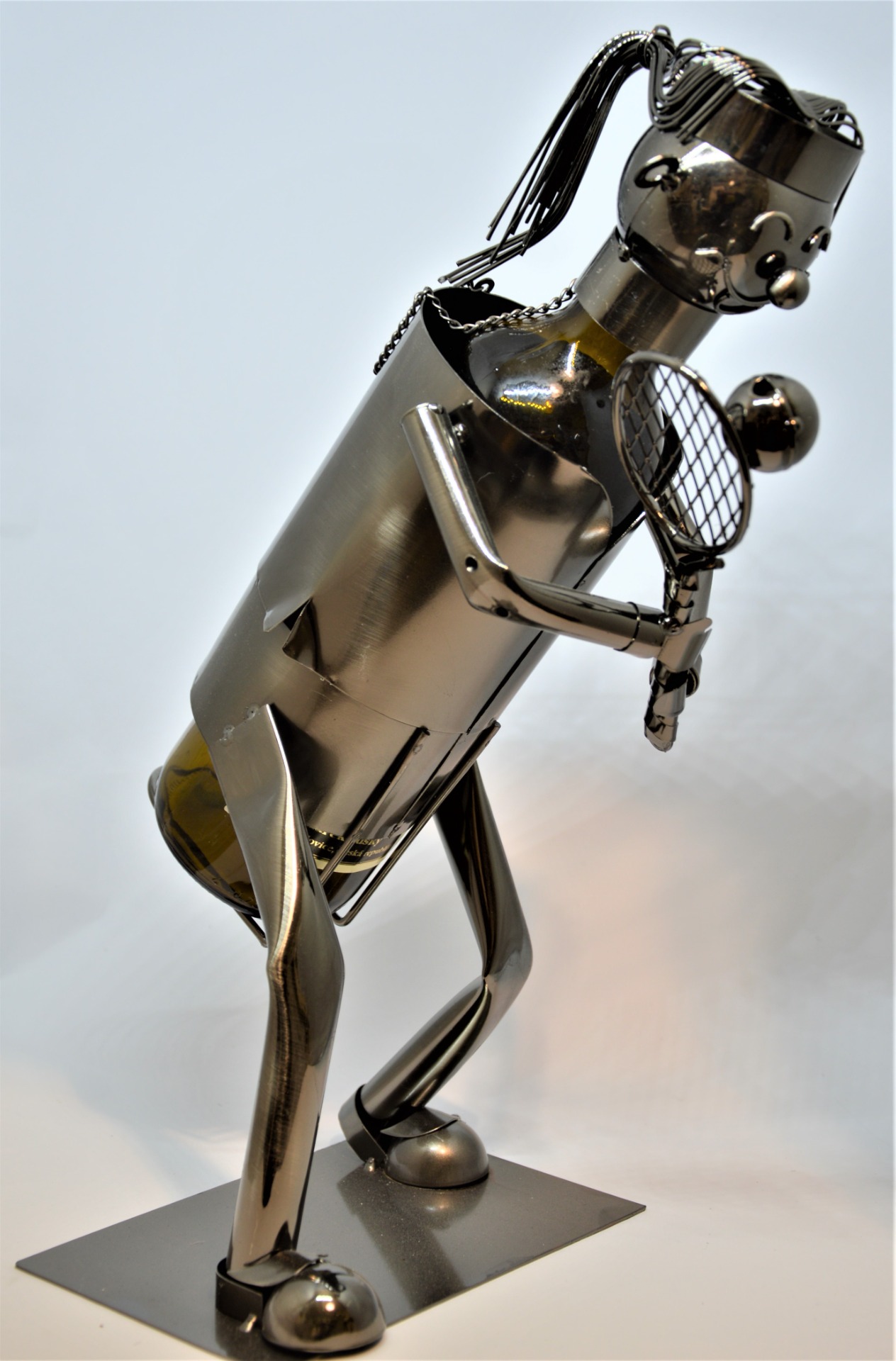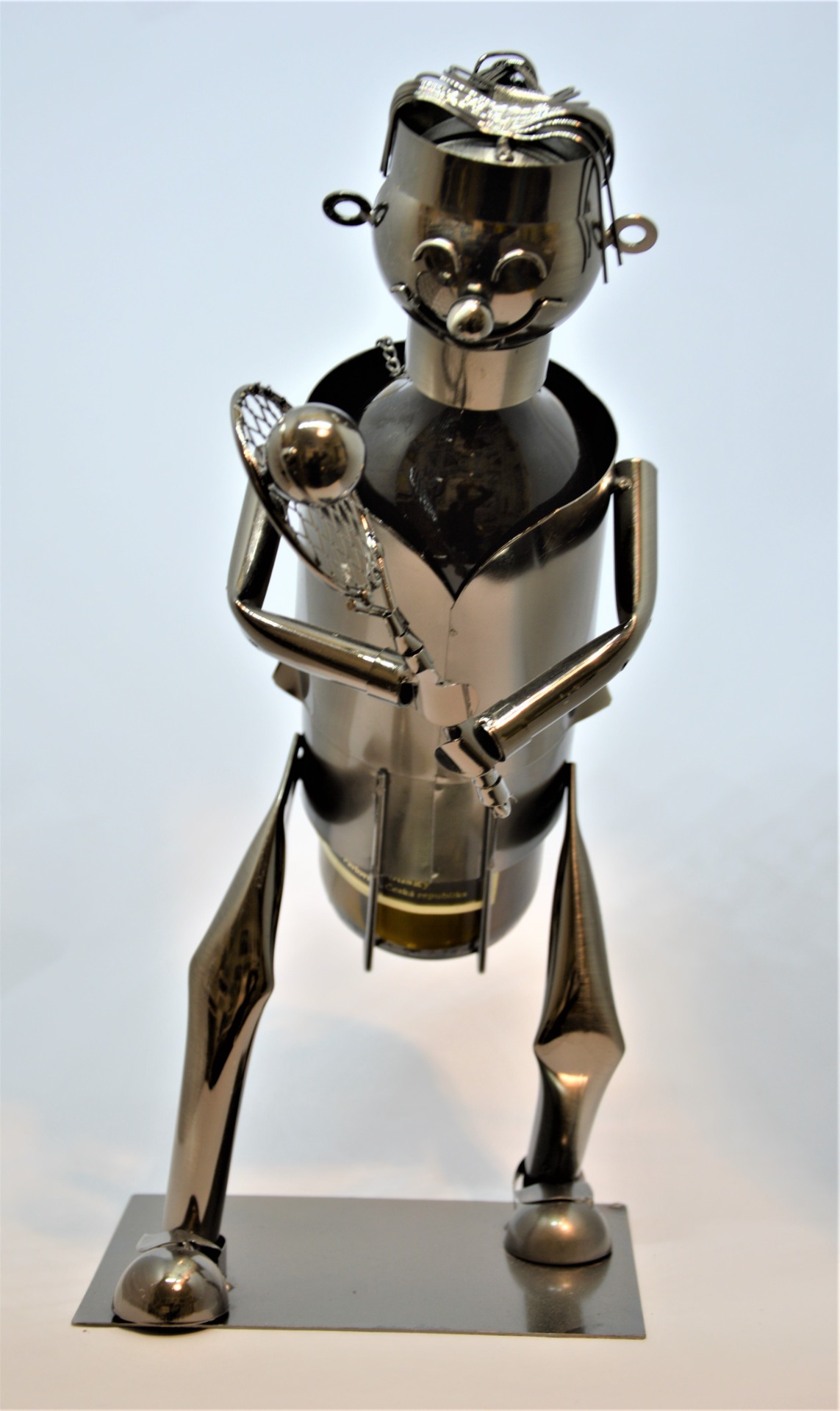 Kovový stojan na víno Tenistka - ručně vyráběný originální stojan potěší nejen všechny milovníky dobrého vína, ale i milovníky bílého sportu. Poslouží jako ideální dárek k nejrůznějším příležitostem, uplatnění najde především při narozeninových oslavách.