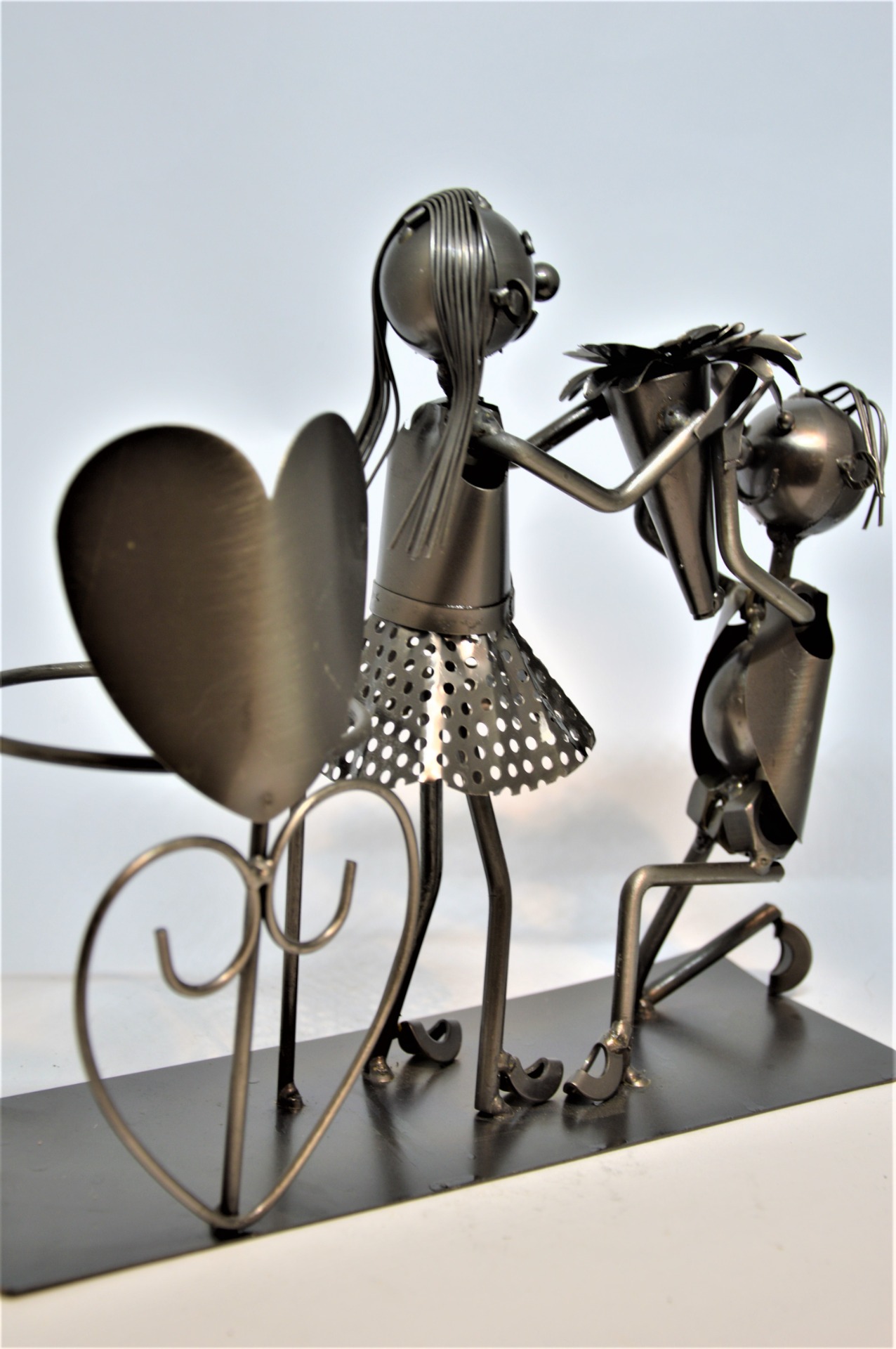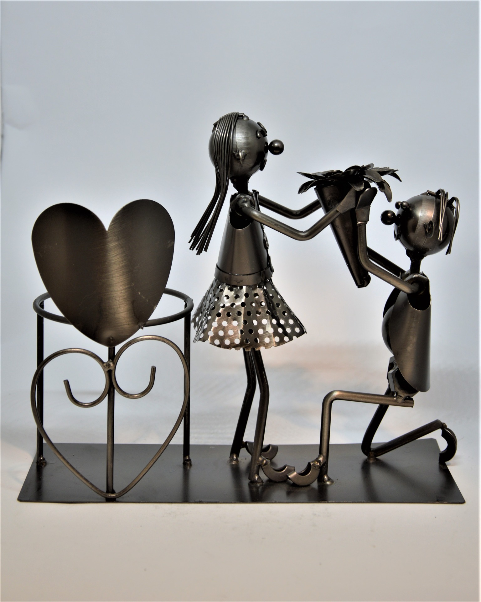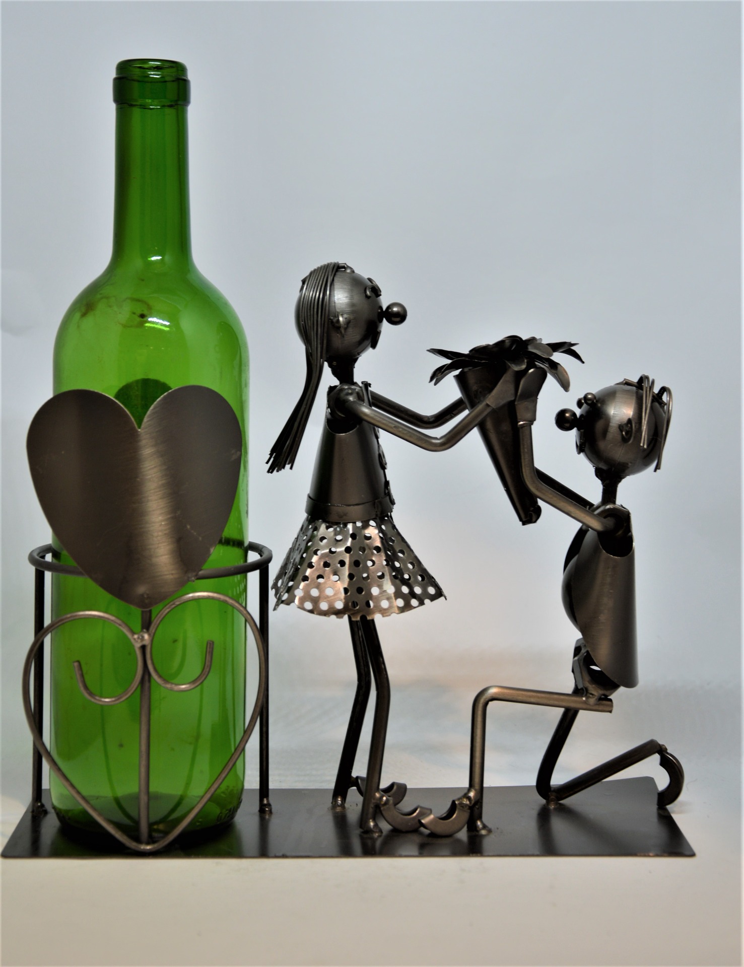 Kovový stojan na víno Žádost o ruku - originální ručně vyráběný stojan s motivem zamilovaného páru, kdy mladík pokleká před svou vyvolenou s kyticí v ruce, aby jí mohl položit onu zásadní otázku: Vezmeš si mě? Pokud přemýšlíte, jak zajímavě požádat vaši milou o ruku, tento stojan na víno vám s tím pomůže. Stačí jen doplnit láhev, abyste klíčové “ANO” společně zapili.