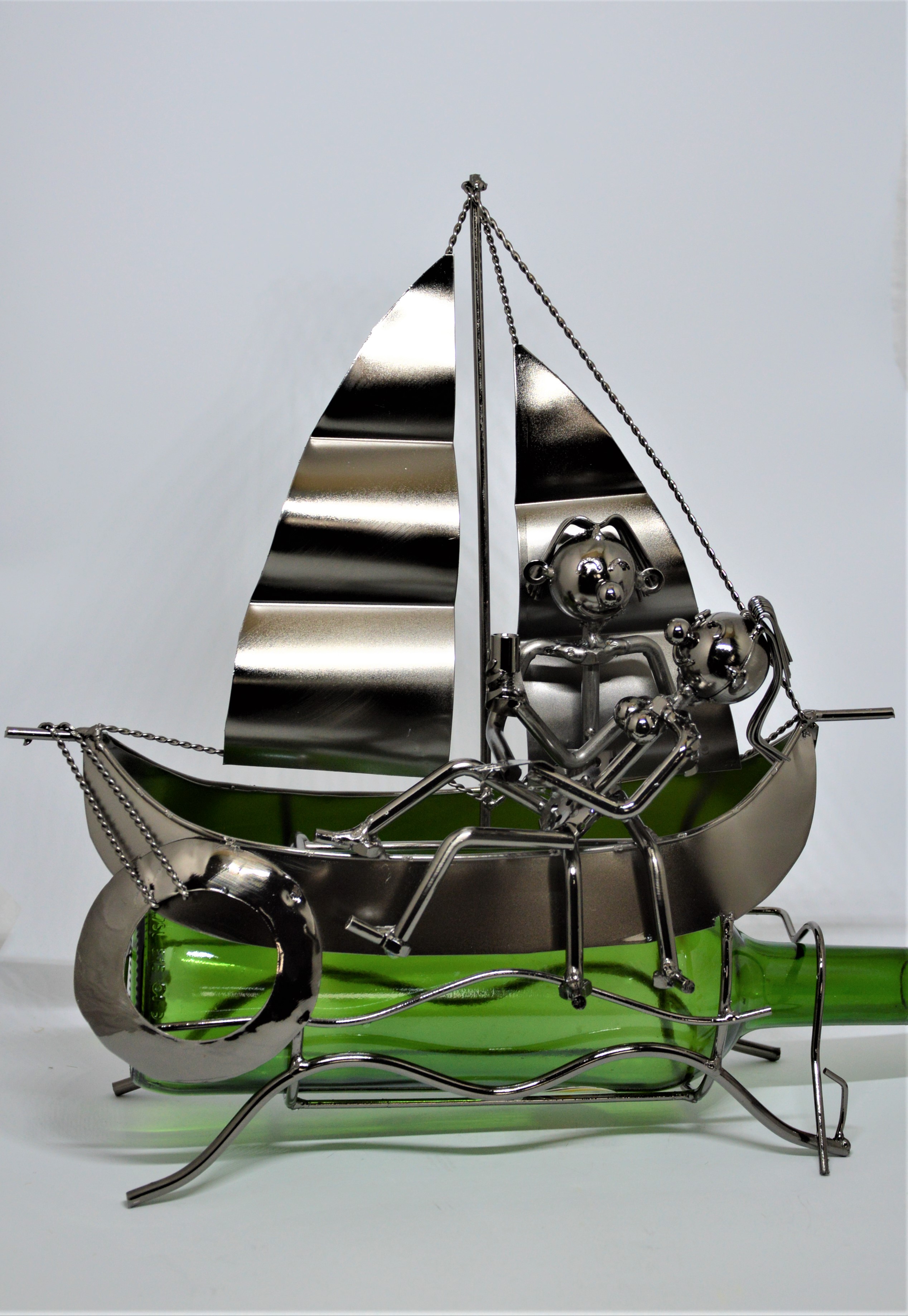 Kovový stojan na víno Zamilovaní na plachetnici - originální stojan na víno s romantickým motivem.