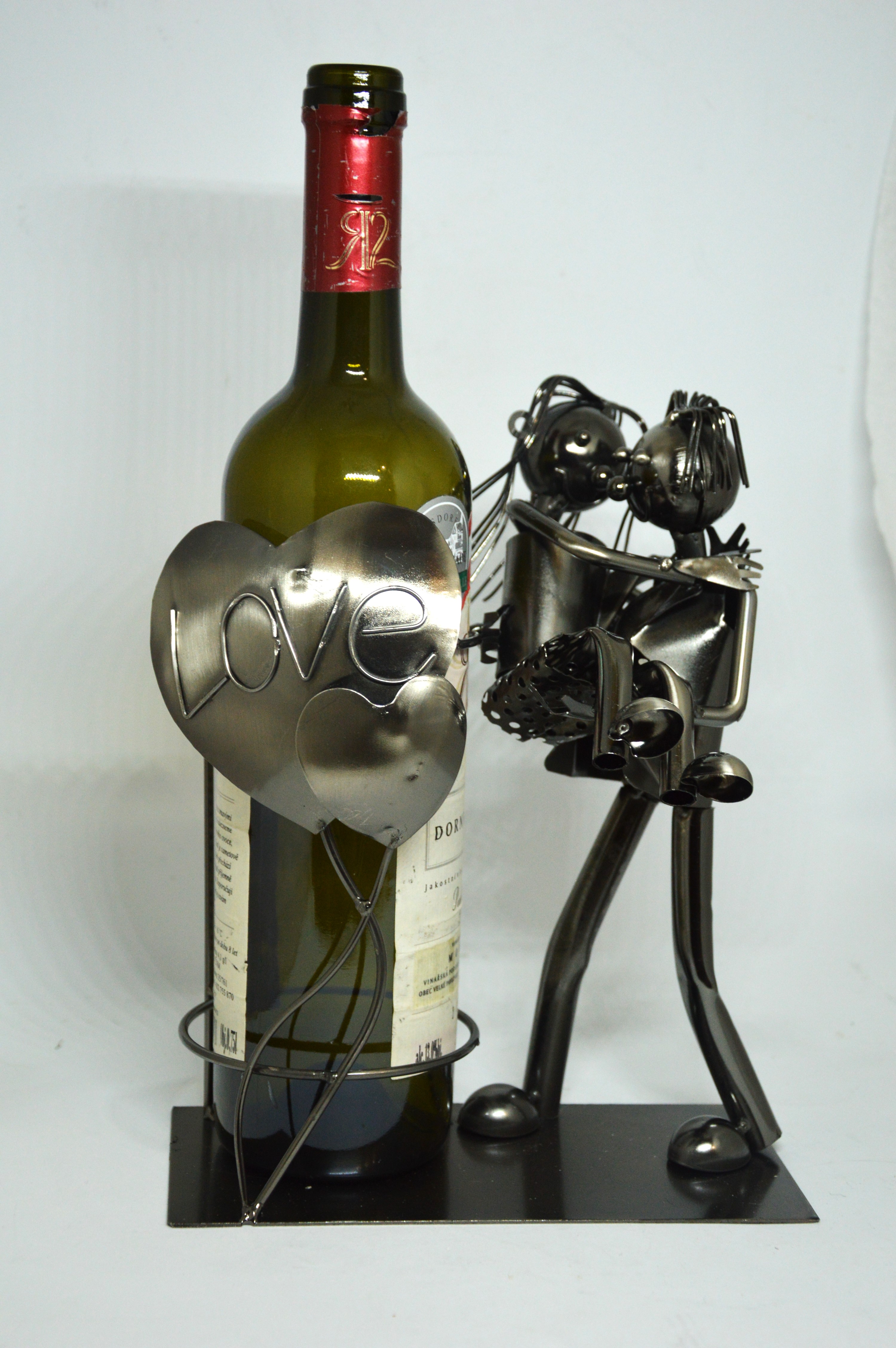 Kovový stojan na víno Zamilovaní - originální ručně vyráběný „zamilovaný” stojan s motivem srdce a nápisem Love se stane skvělým svatebním dárkem či dárkem k výročí.
