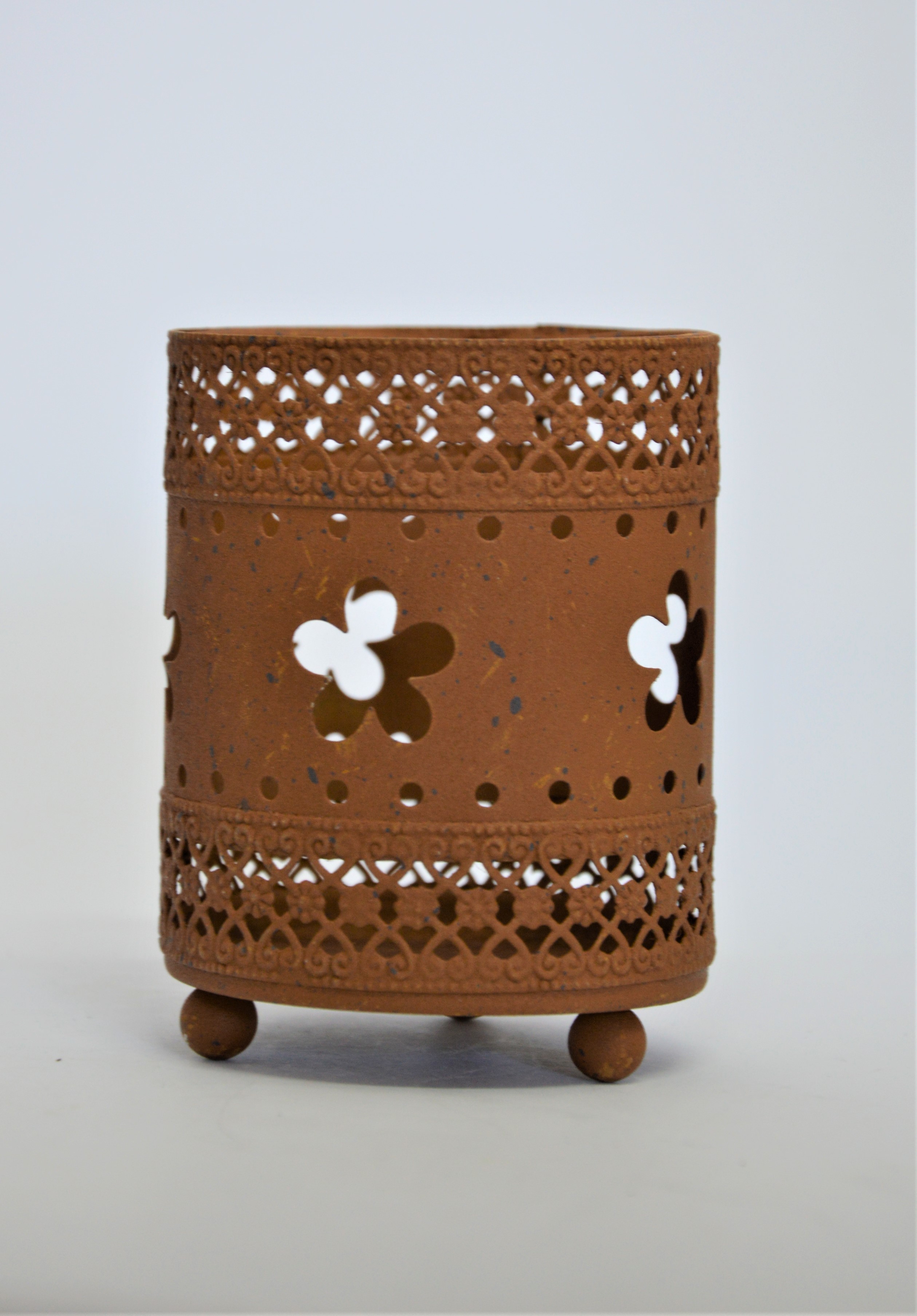 Kovový svícen s květinami - kovový svícen rezavé barvy s vyřezávanými květinami umístěný na drobných kulatých nožičkách se stane milým dekorativním prvkem vašeho interiéru především v jarním či letním období.